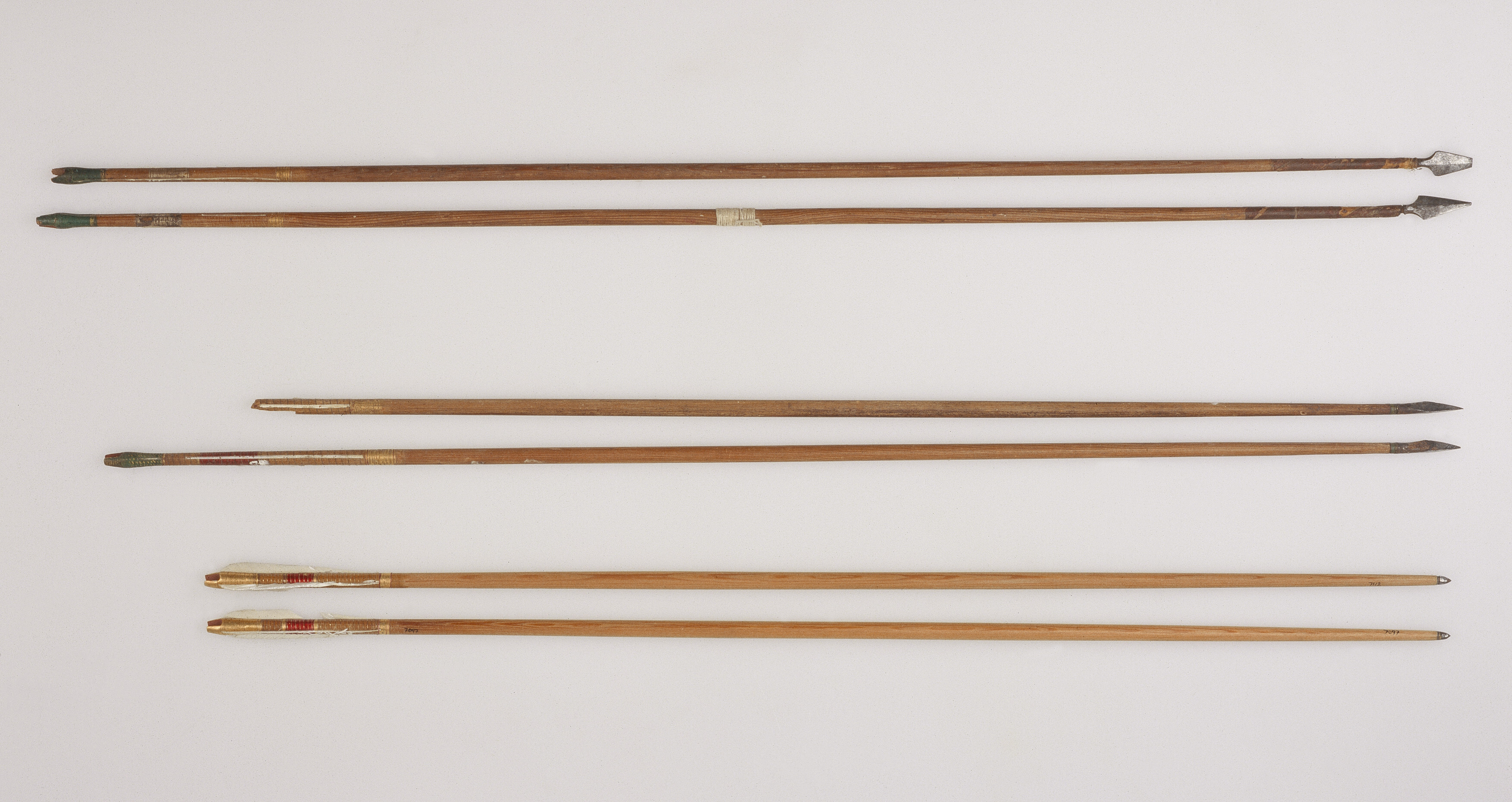 Spets av stål, tunn med antydd mittås, lancettformig med tånge instucken i skaftet. Runt skaft av trä, invid spetsen lindat med snöre och däröver med rödbrun bark eller skinn? Pilstjärten något vidgad, kluven och grönmålad med en smal förgylld ring inuti röd. Där framför två förgyllda ringar. Märken efter fastklistrade styrfjädrar av vingpennor. Mitt på är nytt snöre lindat runt skaftet.