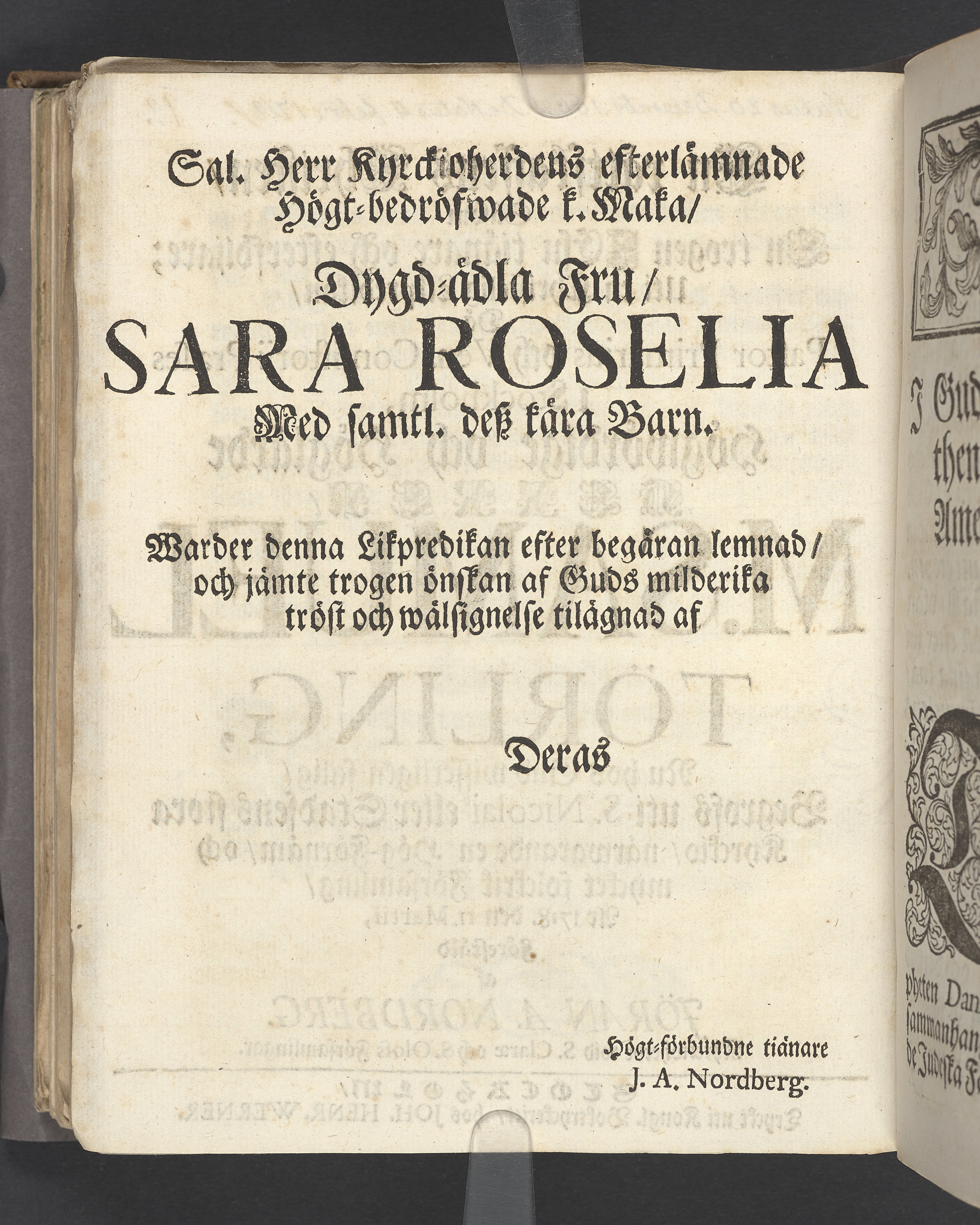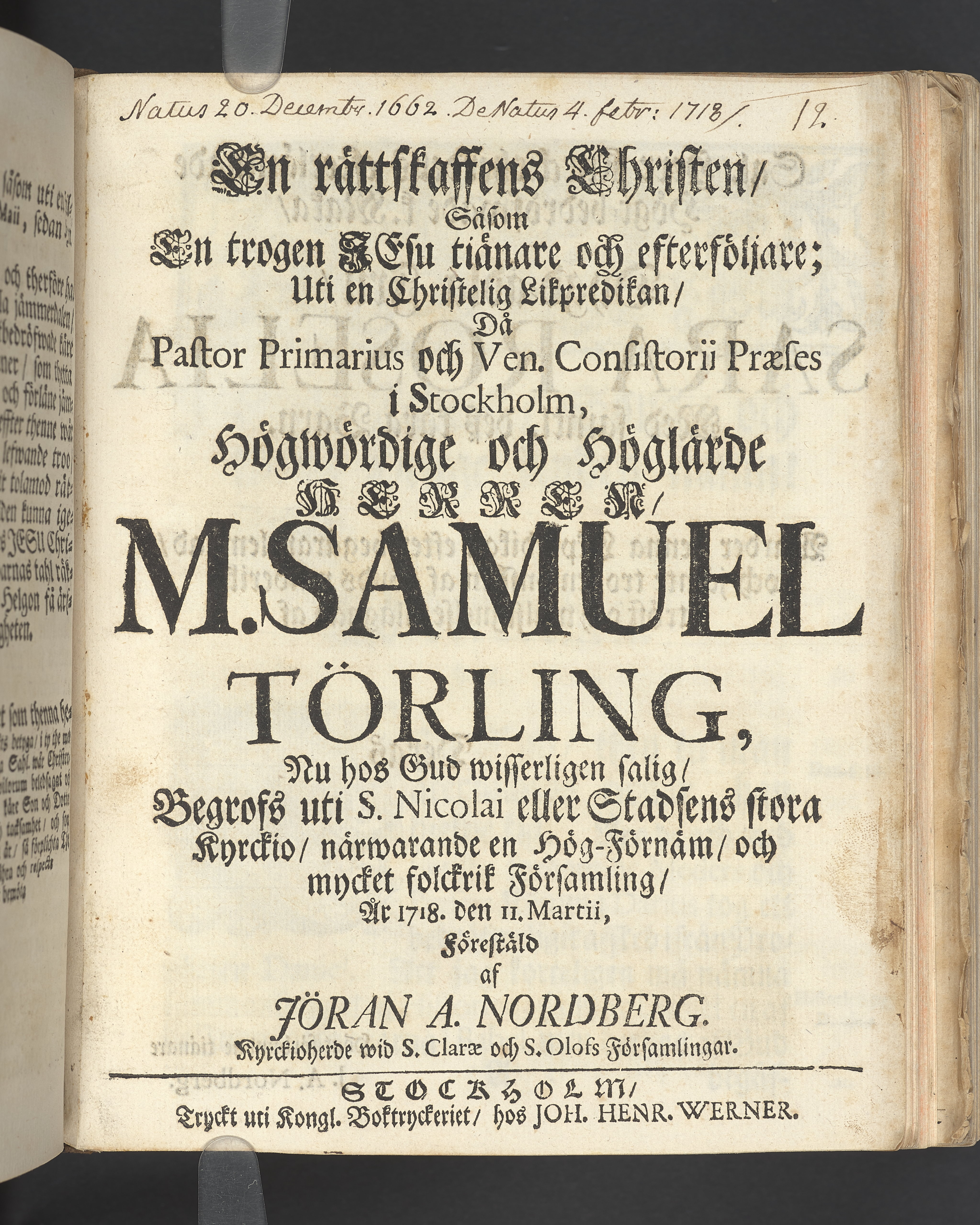 En rättskaffens christen, såsom en trogen Jesu tiänare och efterföljare; uti en christelig likpredikan, då ... M. Samuel Törling, nu hos Gud wisserligen salig, begrofs uti S. Nicolai eller stadens stora kyrckio ... år 1718. den 11. martii, förestäld af Jöran A. Nordberg ... Stockholm, tryckt uti kongl. boktryckeriet, hos Joh. Henr. Werner.