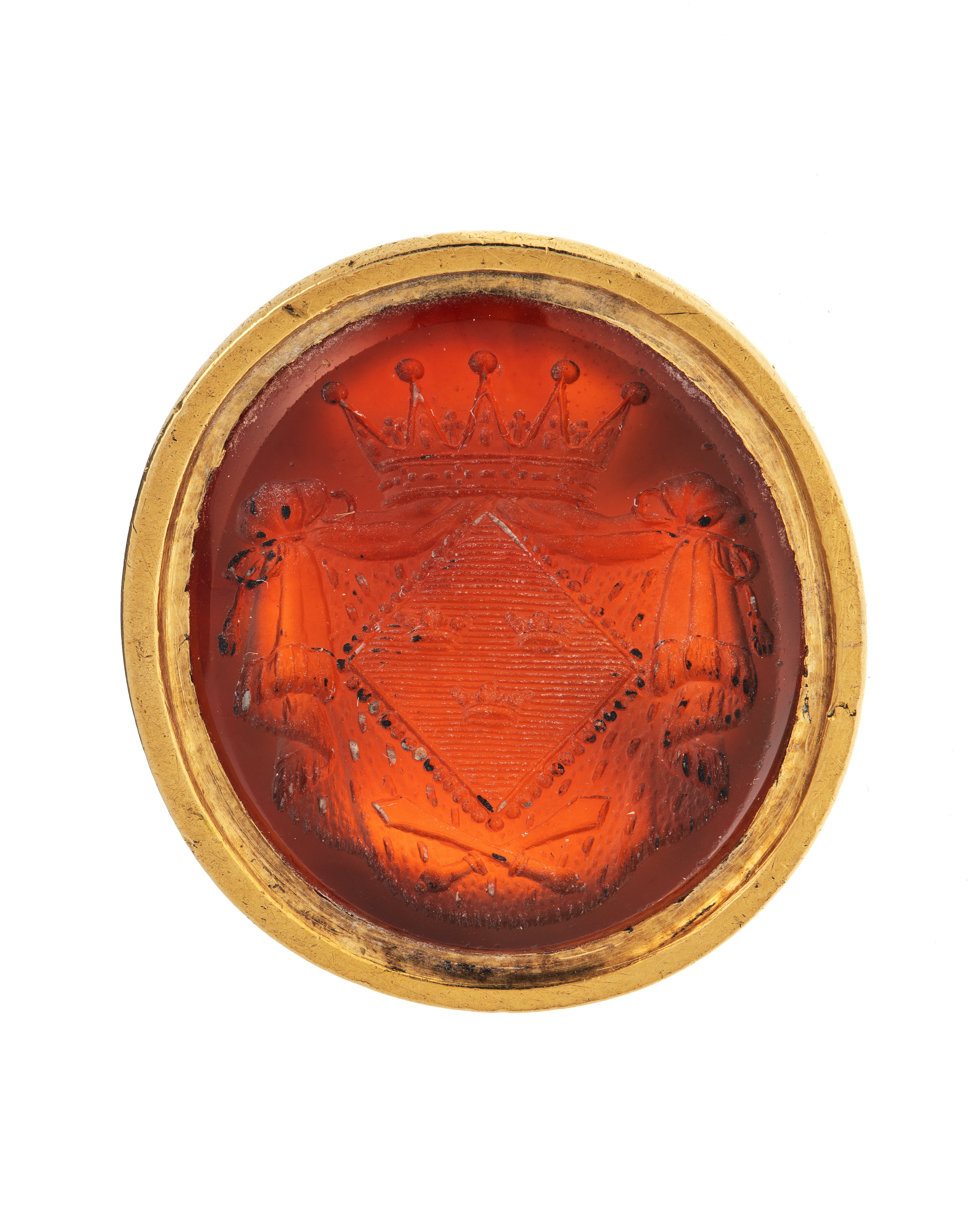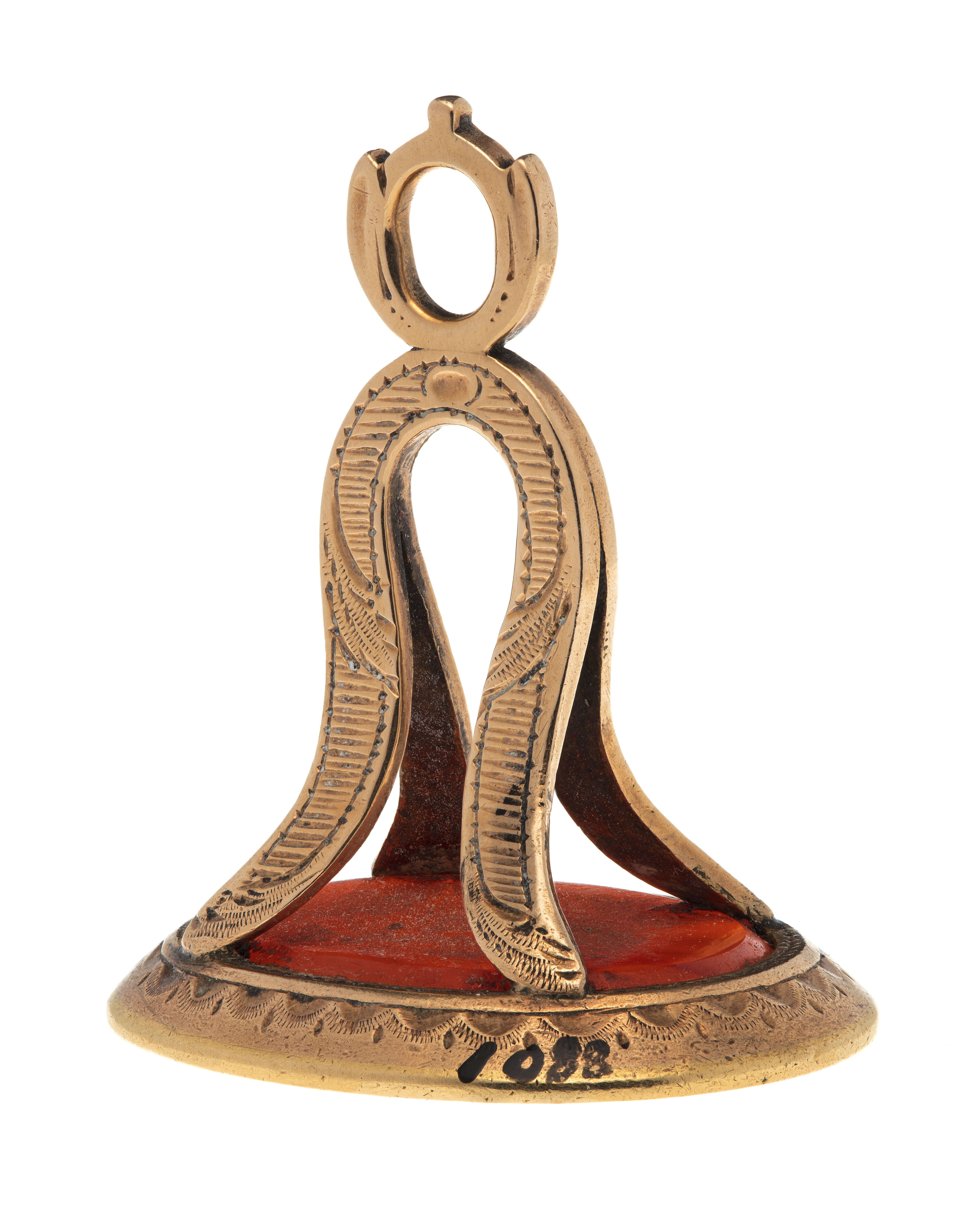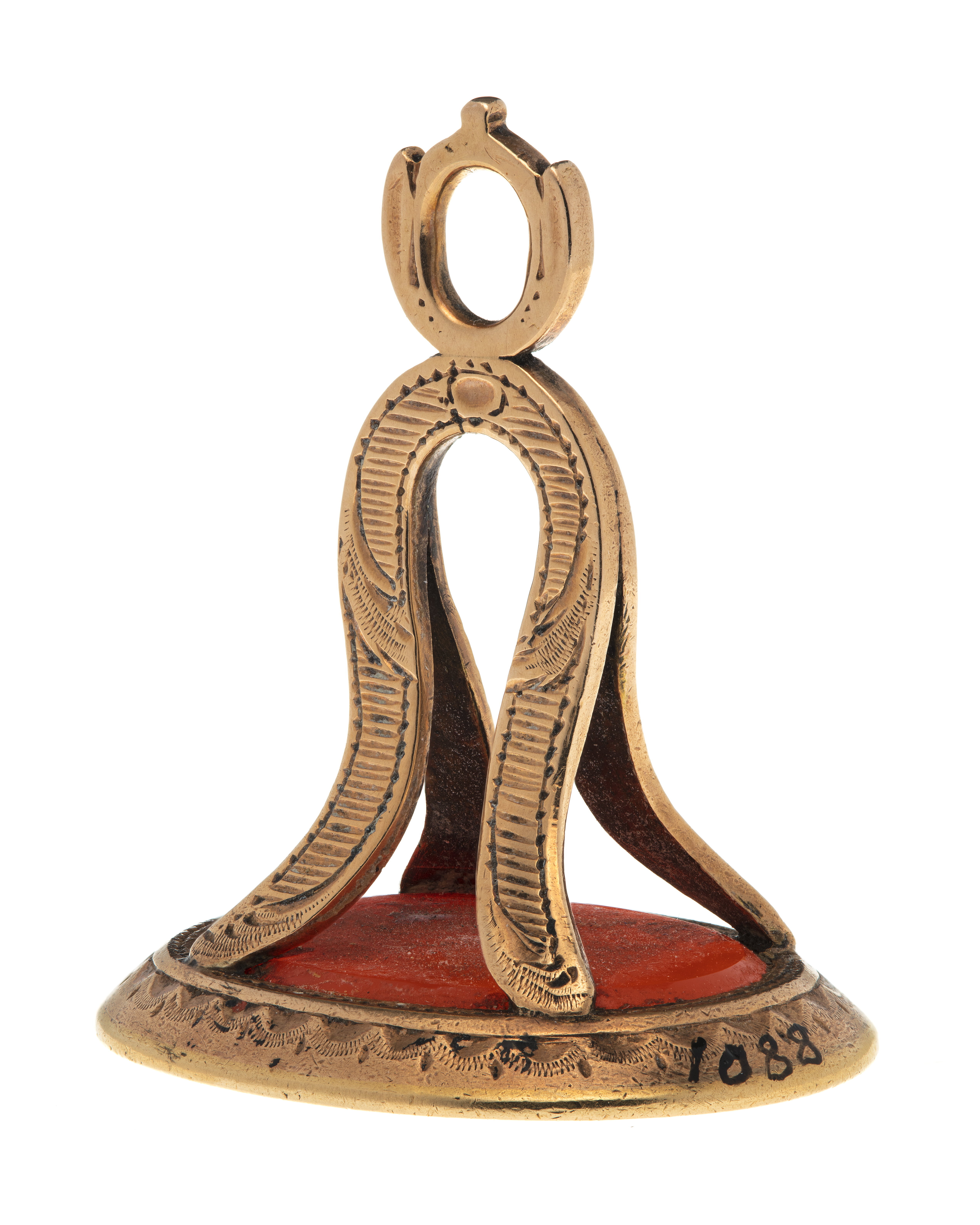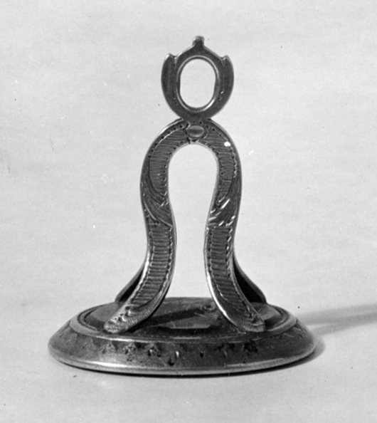 Oval karneol med fasad kant, graverat vapen, rutsköld med tre kronor, därnedanför två korslagda kredensknivar (symboler för stift Quedlingburg). Vapentält, krönt med svensk hertigkrona. Slät fattning á jour, klockformigt skaft av två u-formiga byglar med graverad dekor, upptill oval ring.