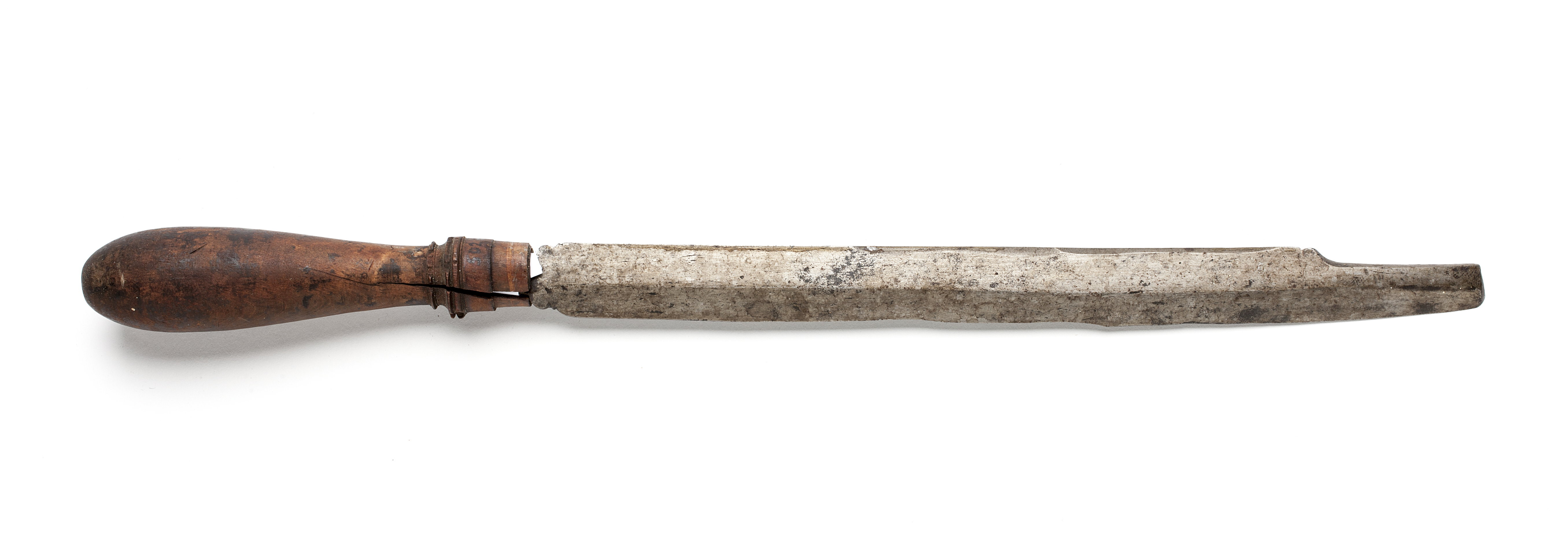 Profilerad bas och ensidig profilering i änden. Ojämn, slipad egg efter stålets ena långsida. Svarvat skaft av päronträ med två vulster nedtill. Ringen bortfallen. Kniv?