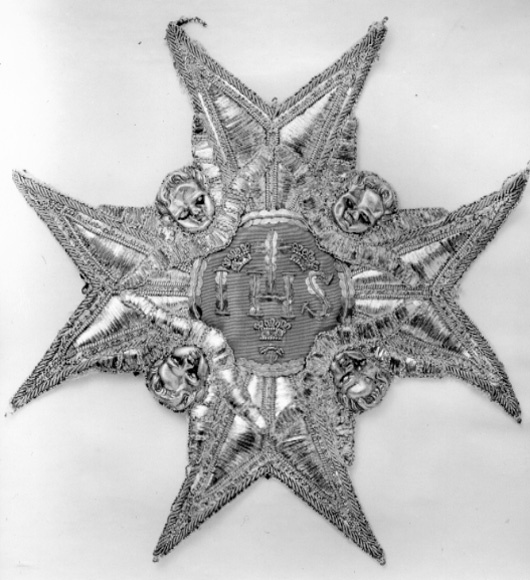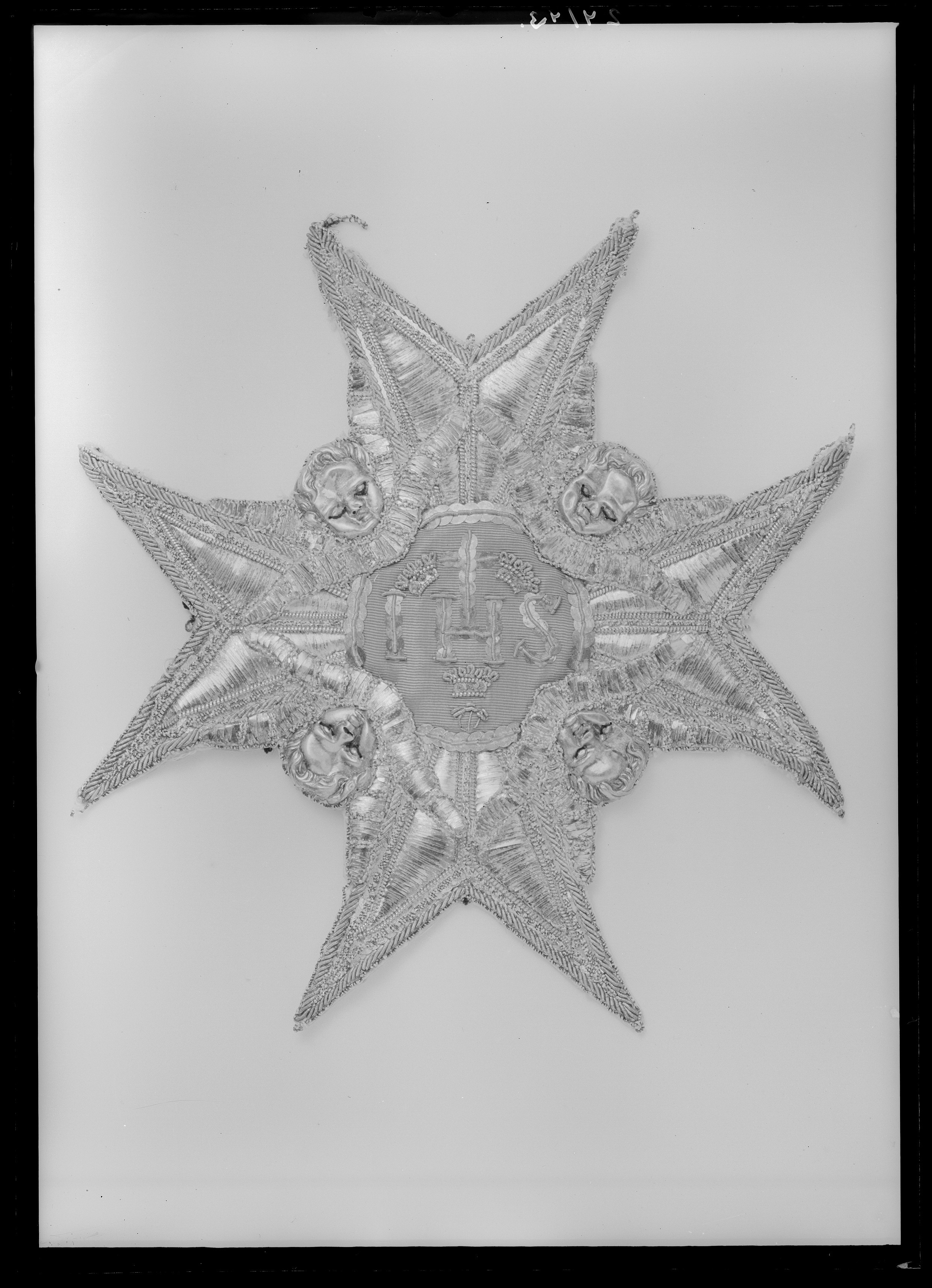 Malteserkors, broderat med silverlan, -kantiljer och -paljetter. Serafer med huvuden pressade i silverbleck, ögon av svart silke, mun av rött silke, vingar av silverlan. Svagt välvd medaljong täckt med ljusblå sidenmoaré, därpå broderat IHS, kors, tre kronor, tre spikhuvuden och kantbård av kantiljer och paljetter av förgyllt silver, spikarna av silvertråd. På baksidan klistrat vitt papper, trasigt vid spetsarna.