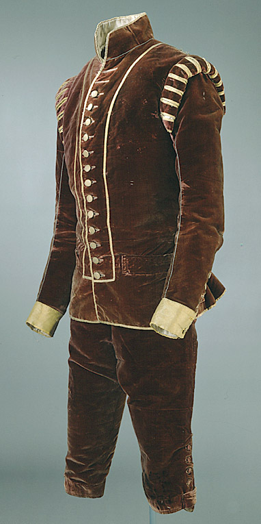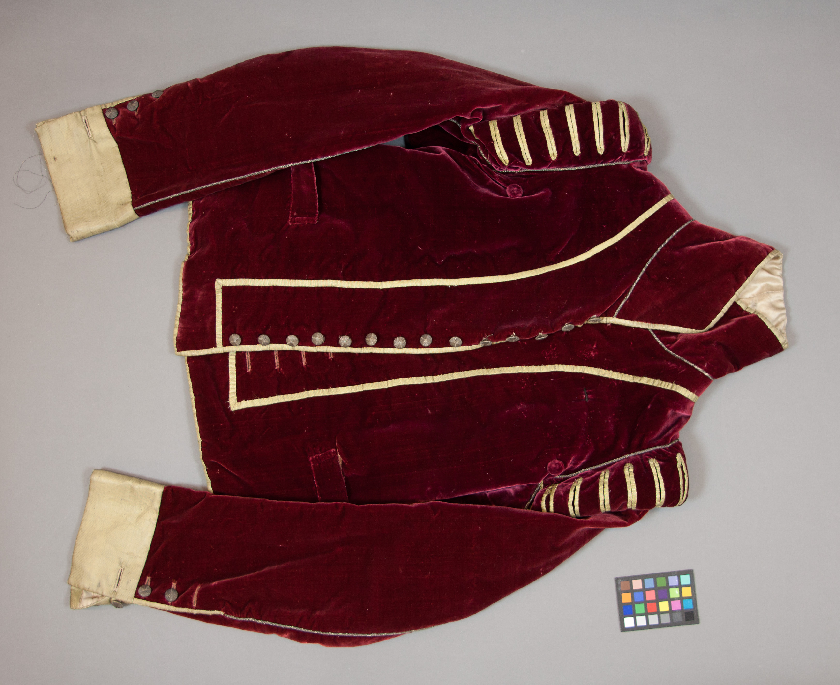 Jackan är sydd i röd silkesammet, modellen är midjelång med långa, formydda ärmar. Jackan knäpps framtill med fjorton knappar. Knapparna är tillverkade i silvertråd som numera har oxiderat. Knappslån har utmärkts med ett dekorationsband som utgår från den nedersta knappen för att sedan utvidga sig uppåt/utåt för att gå på utsidan av kragen. Dekorationsbanden på jackan är av samma material som manchetterna på ärmarna, dvs. silvertråd (kantiljtråd) på en gul botten som imiterar ett guldtyg. Det finns ytterligare en variant av dekorationsband, dessa är smalare och av tvinnad silvertråd. Dessa kan eventuellt ha varit förgyllda för att passa in med resten av dräkten. Sliverbanden sitter på undersidan av ärmarna, runt halskragen och som dekorationsband på ryggen. Ärmsluten har slits som knäpps med fem knappar av silvertråd (se ovan). Axlarna har axlelkarmar med skurna fingrar som har kantats med samma guldimiterande tyg som bla manchetterna. På vardera framsida sitter det ett påsytt ficklock med en påsficka av vit linne. Jackan är fodrad med ljusbeige/gul sidentaft. Jackan är stoppad över bröstet. På vänster bröst, i fodret sitter det ett innerficka. Ståndkrage 1000 mm hög. Skörten har isydda kilar för att få ytterligare vidd. Hela nederkanten är kantad med guldimiterande tyg.