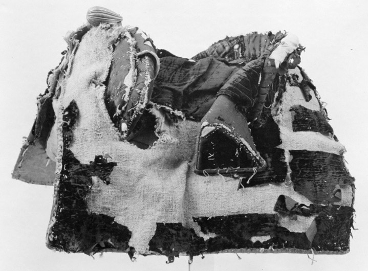 Bomsadel av svart sammet med rektangulära kappor, fodrade och kantade med brunt läder. Tvådelad frambom med snett avskurna ändar, ca 490 mm bred och 120 mm hög. Bakbom med stödbommar ca 580 mm bred, 130 mm hög med på insidan lodräta stickningar med flätad silvertråd samt häftning med försilvrade tennlickor av mässing. Rundad, räfflad, framåt utdragen sadelknapp av försilvrad mässing. Bom överklädd med väv, bossor av naturfärgat linne med kant av brunt läder. En stropp för sadelgjord av vitt läder. Byglar för stigläder i form av rektangulärt hål genom bommens sidor. Två söljor för förbygeln, två krampor för hölster samt baktill ögla av läder.