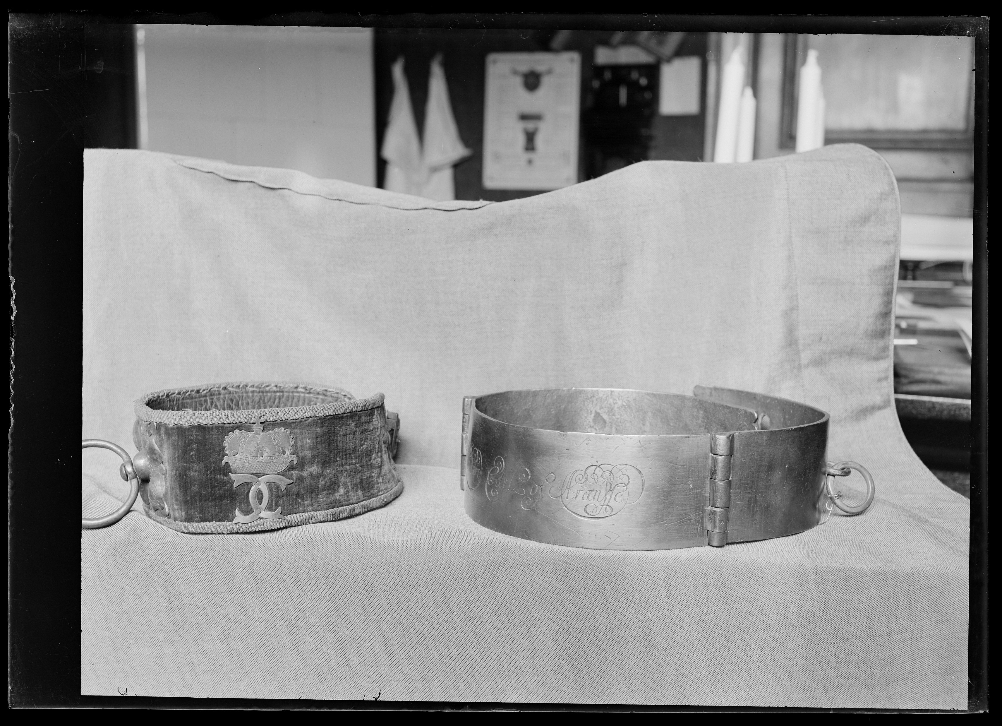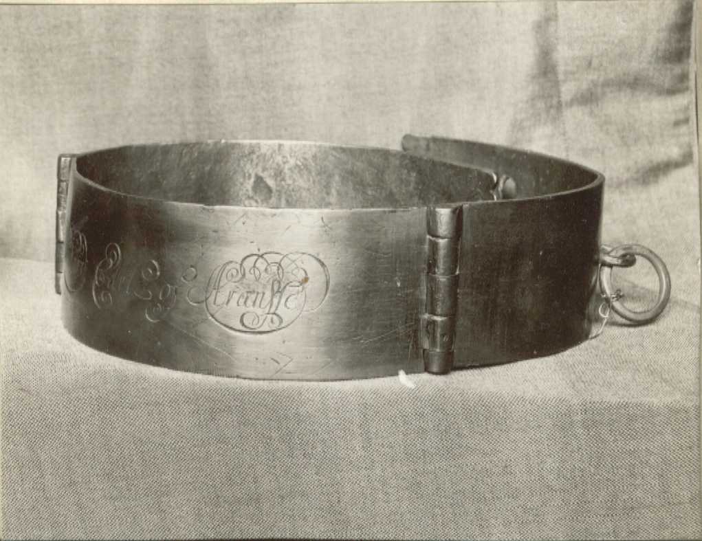 Halsband av mässing bestående av tre böjda delar ledade med gångjärn. På den mellersta graverat med skrivstil: "Richard Earl of Arran". I ytteränden av den ena u-formad bygel av stål, i den andra ytteränden tre rektangulära hål för hopfästandet av halsbandet, innanför hålen en horisontell u-formad bygel av stål, i denna ring av mässing. Enligt katalogkort (utan angivande av källa): Mässingshalsband sannolikt för irländsk varghund, som tillhört Lord Richard Butler (1639-86) vilken 1662-1686 bar de irländska titlarna Earl of Arran, Viscount Tullogh och Baron Butler of Cloughgrenan. Första gången upptagen i inventarium 1683.