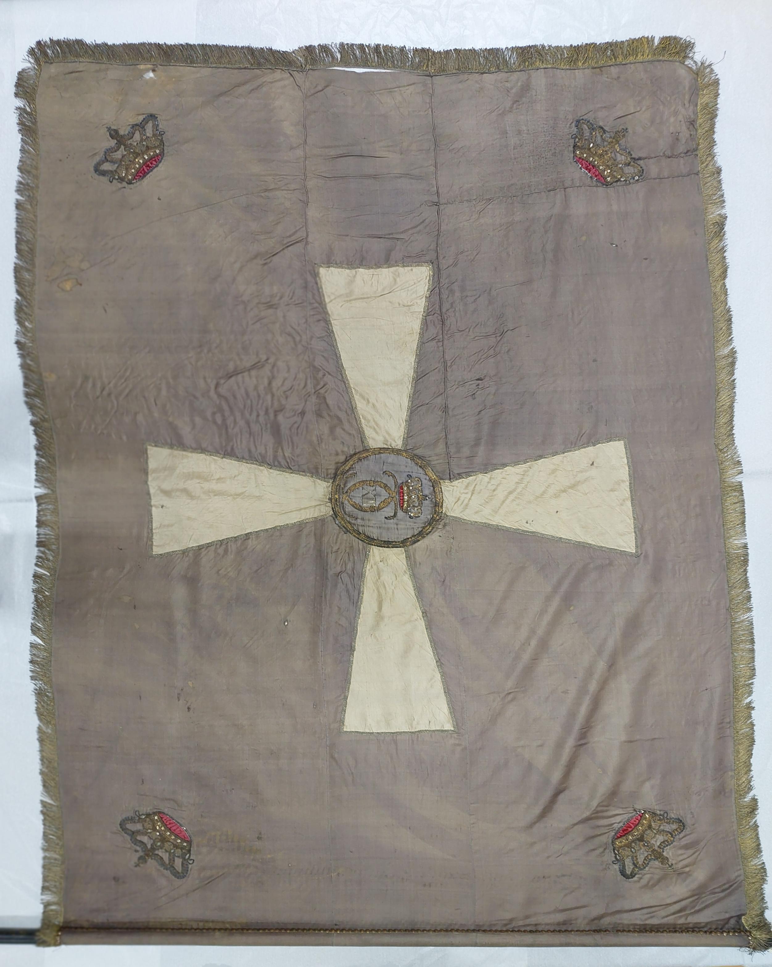 Duk av enkel lila sidenkypert, sydd av 3 horisontella våder. Dekor: applicerat stort georgskors i vitt. I korsmitten en oval (förhöjd) Karl XIII:s namnchiffer dubbelt C inneslutande XIII, applicerade slutna kronor med rött kronfoder. Broderade med kantiljer, paljetter och glasbitar. Duken fäst vid stången med 1 rad tättsittande tennlikor på ett violett sidenband. Frans: av guld drejad. Stång av svartmålad furu. Holk av mässing.