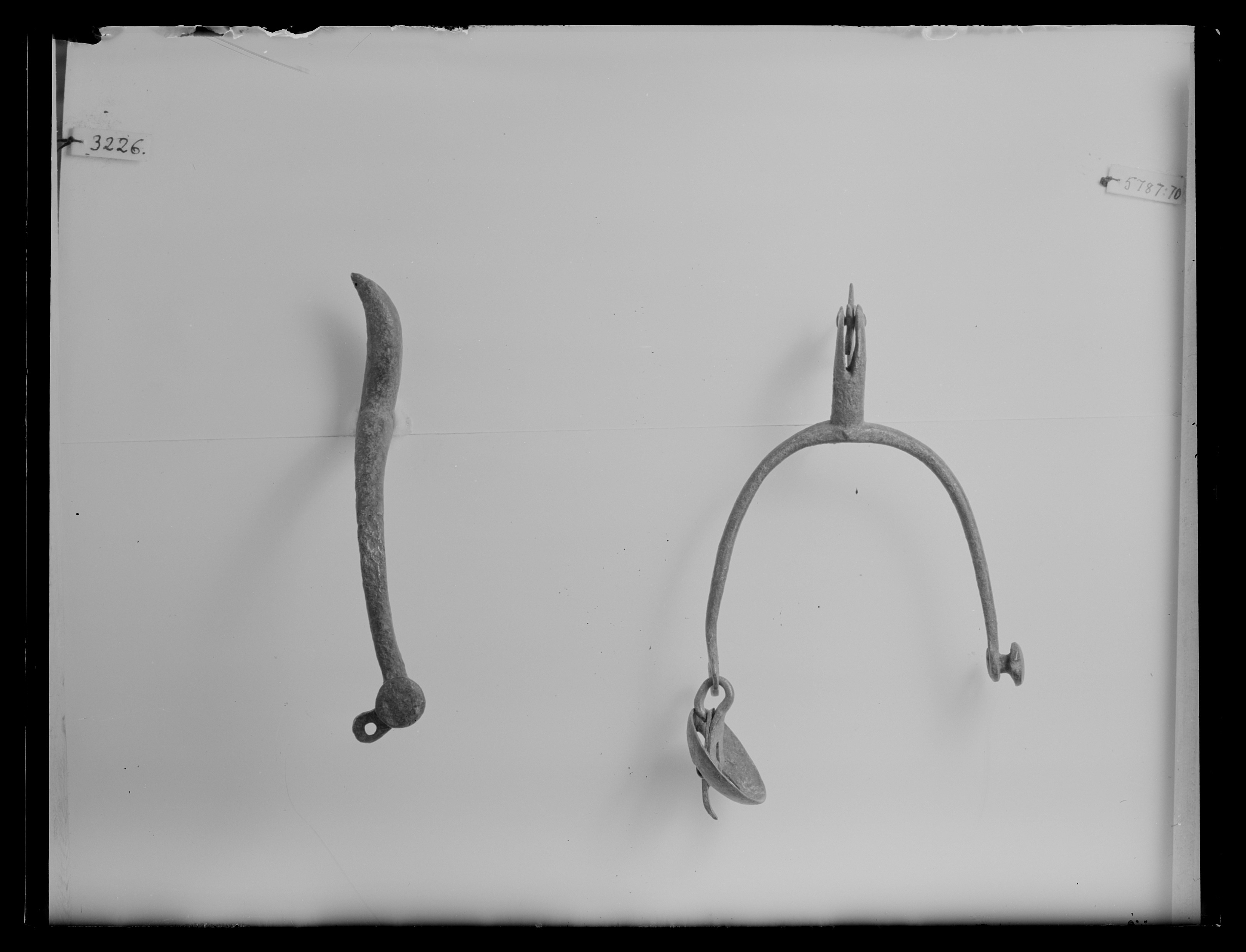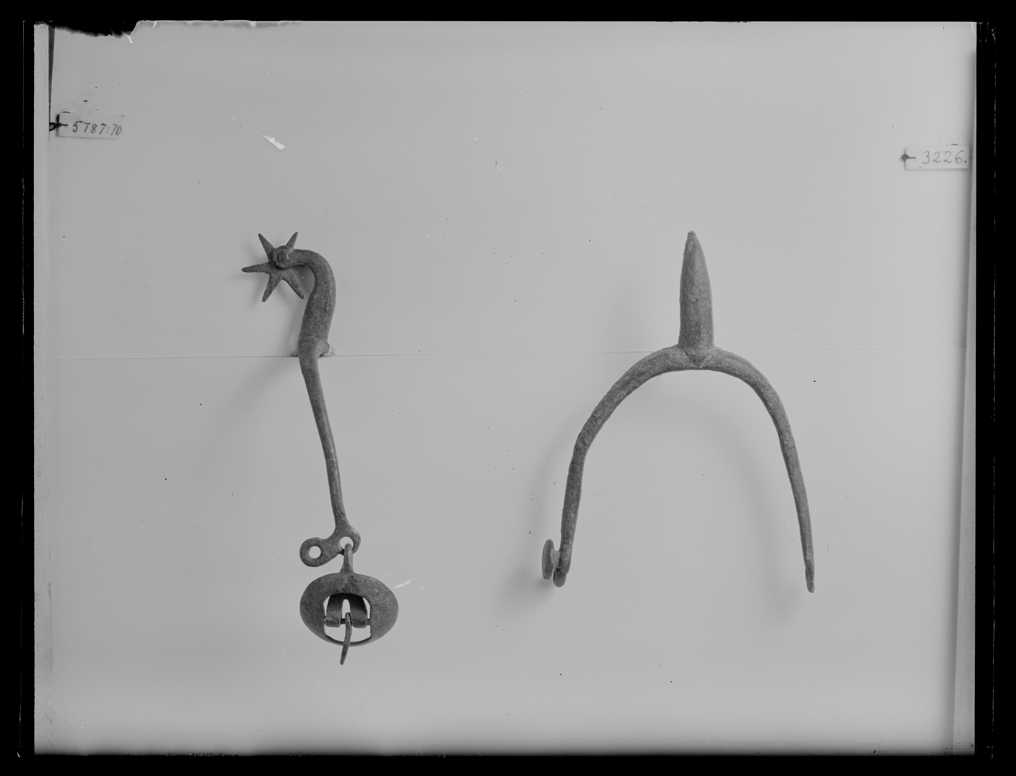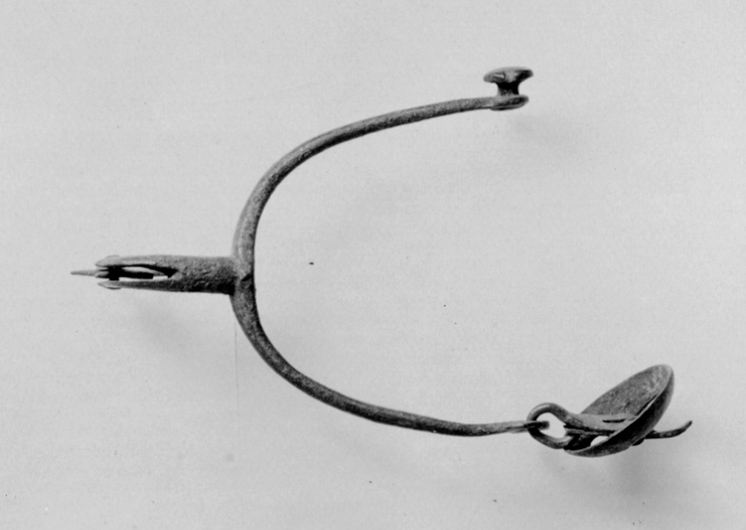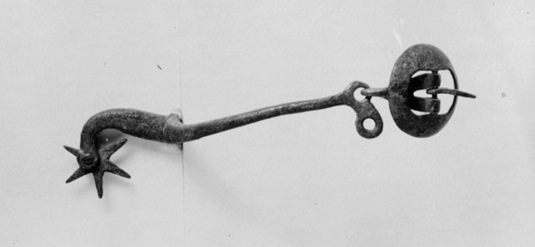 Sporre av stål. U-formade skänklar med rundade ytterändar med en hjärtformig knapp på ena sidan med en nedåtriktad genombruten platta nedanför. I andra skänkelns ytterände finns en rund skålformig sölja. Böjd sporrhals 35 mm lång med klinga av stål, stjärnformig med 6 taggar.