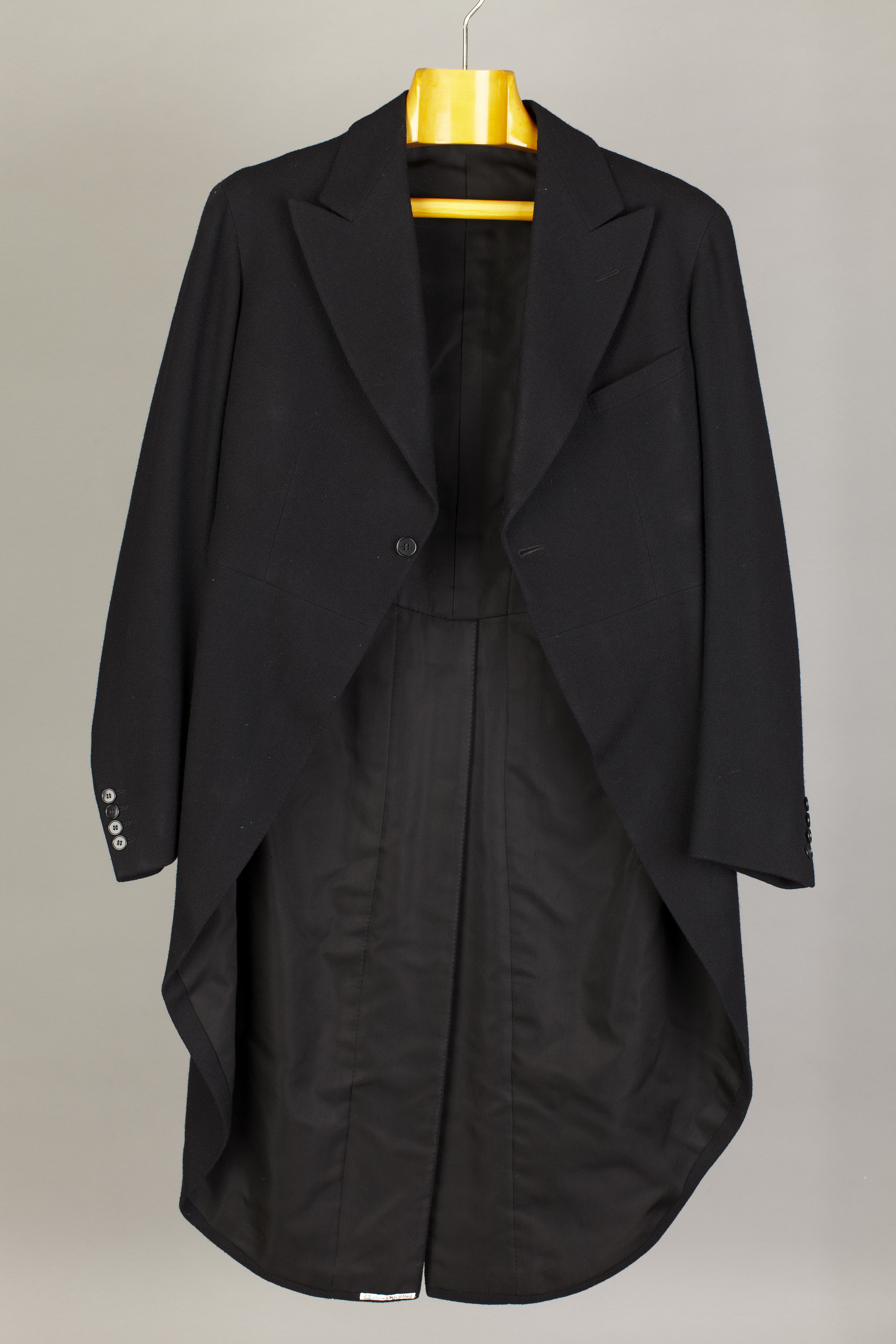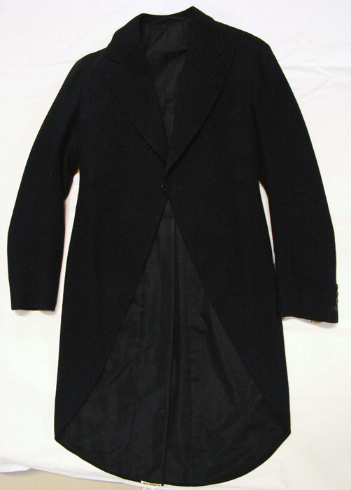 Jackett av svart fiskbensmönstrat ylle. Hel rygg. Fällkrage med slag, knapphål på v. slag. Framsidan i mjukt svängd båge ned till skjörtens spetsar. En knapp, med på baksidan påsydd knapp för knäppning i ett knapphål. Båda knapparna plana med kantlist, svarta, av plast, d: 19 mm. På v. bröst en stolpficka. Ärmar med nedtill ett sprund, knäppt med fyra knappar, plan med kantlist, svarta, av plast, d: 14 mm. rygg i fyra delar med mittsöm. I midjesömmen, vid skjörtens längsgående veck två plana, svarta plastknappar med kantlister, d: 19 mm. Foder av svart bomullsdiagonal. I fodret två bröststolpfickor. I den h. en vit sidenetikett med kungligt vapen och: " Militär Ekiperings A.B // KUNGL. HOFLEVERANTÖR // MEA // Stockholm, den 16:12 1936 // Herr HKH // Prins Gustaf Adolf ". Fickorna fodrade med svart bomullskypert, upptill med grönröd kant. Ärmarna fodrade med vitt siden. Har tillhört prins Gustav Adolf (1906-1947), gåva 1952 av prinsessan Sibylla (1908-1972).