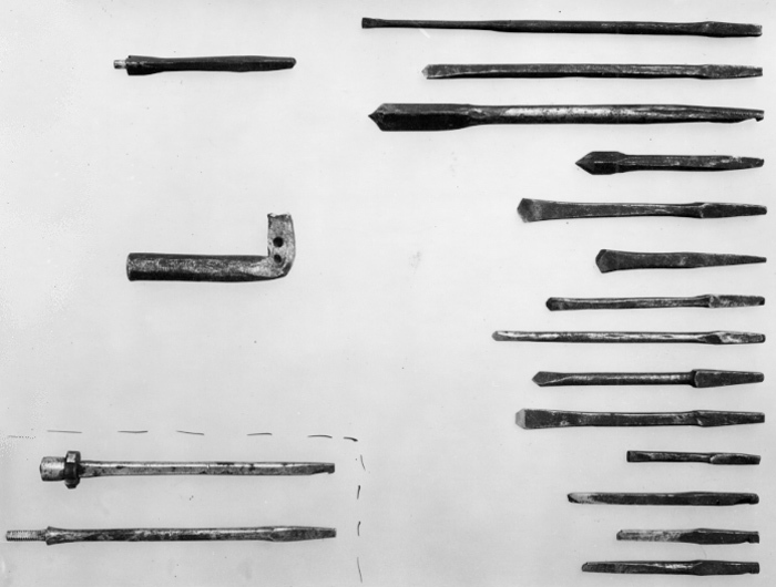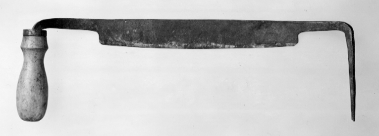 Ur Johan Rings bössmakarverkstad. Eneggad bandkniv av stål med svagt konvex egg, var ände svagt böjd och försedd med ett i rät vinkel böjt handtag. Det ena handtaget av trä är svarvat, kägelformigt och vid fästet försett med en vulst och skott av stål. Andra handtaget saknas.