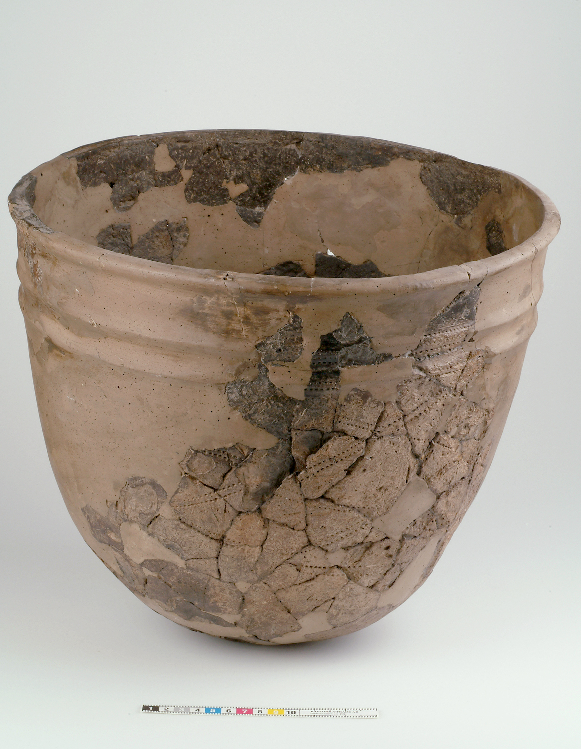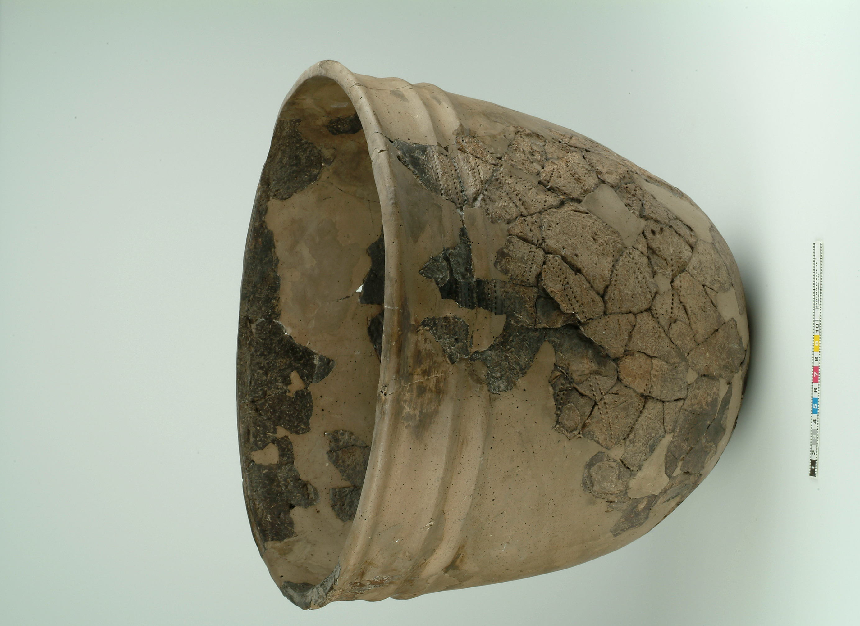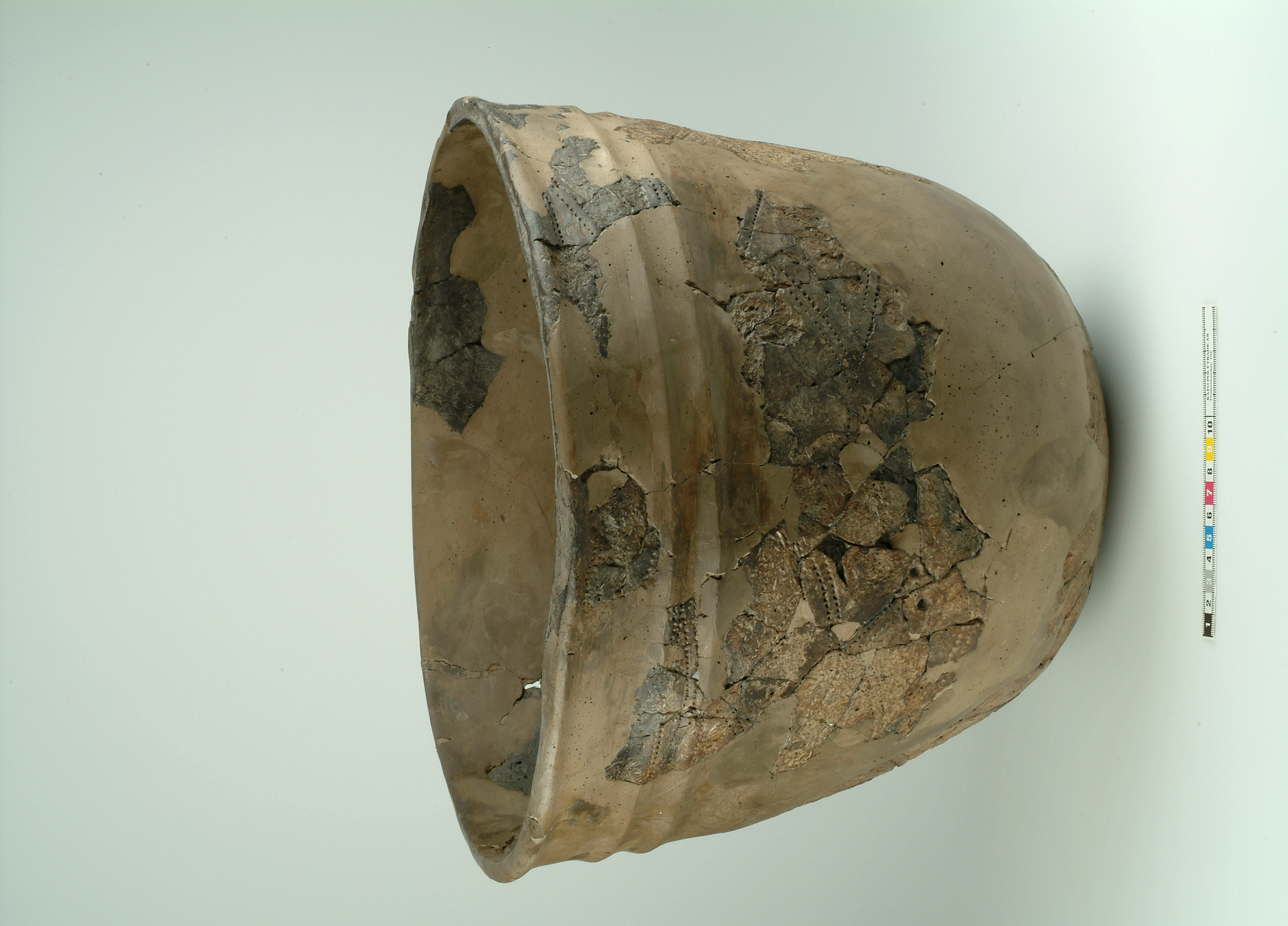 Stort kärl av asbestblandad keramik. 14C-daterat med 2 värden till äldre bronsålder se Linder 1966 i Fornvännen