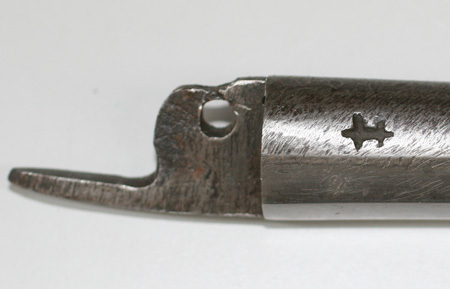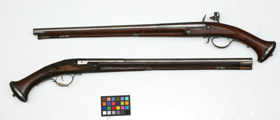 Rund, slätborrad pipa av stål med åttsidig kammare, filad ring vid övergången på de tre övre faserna. På kammarens v sida en otydlig H-liknande stämpel. Svagt nedåtböjt, smalt, spetsigt svansskruvblad. Fästning: Två häften. Pipan fäst med pipstift av stål samt bakre låsskruven genom hål i svansskruvplattan. Låset saknas. Fästning: Båda låsskruvarna kvar. Rak, smal avtryckares. Smalt, långt avtryckarbleck, något avsmalnande mot ändarna, tvärt avskurna ändar. Helstock av brunbetsat lövträ (apel ?), plana ytor som sidbleck och förlängning av svansskruvbladet. Spetsoval kolvände, kolvkappa av trä, stålband, b: 7 mm mot kolven, 1 mm av träet synligt utanför stålbandet, mitt på kappan en rundad stålknapp. Beslag av stål. Näsband och två balusterformiga rörkor (ingen spets). Varbygel med kluvna stolpar, kort främre arm, något längre bakre arm, två fästskruvar. Tillbehör: Laddstock, l: 484 mm, framtill skodd med ljus horn, l: 35 mm.
