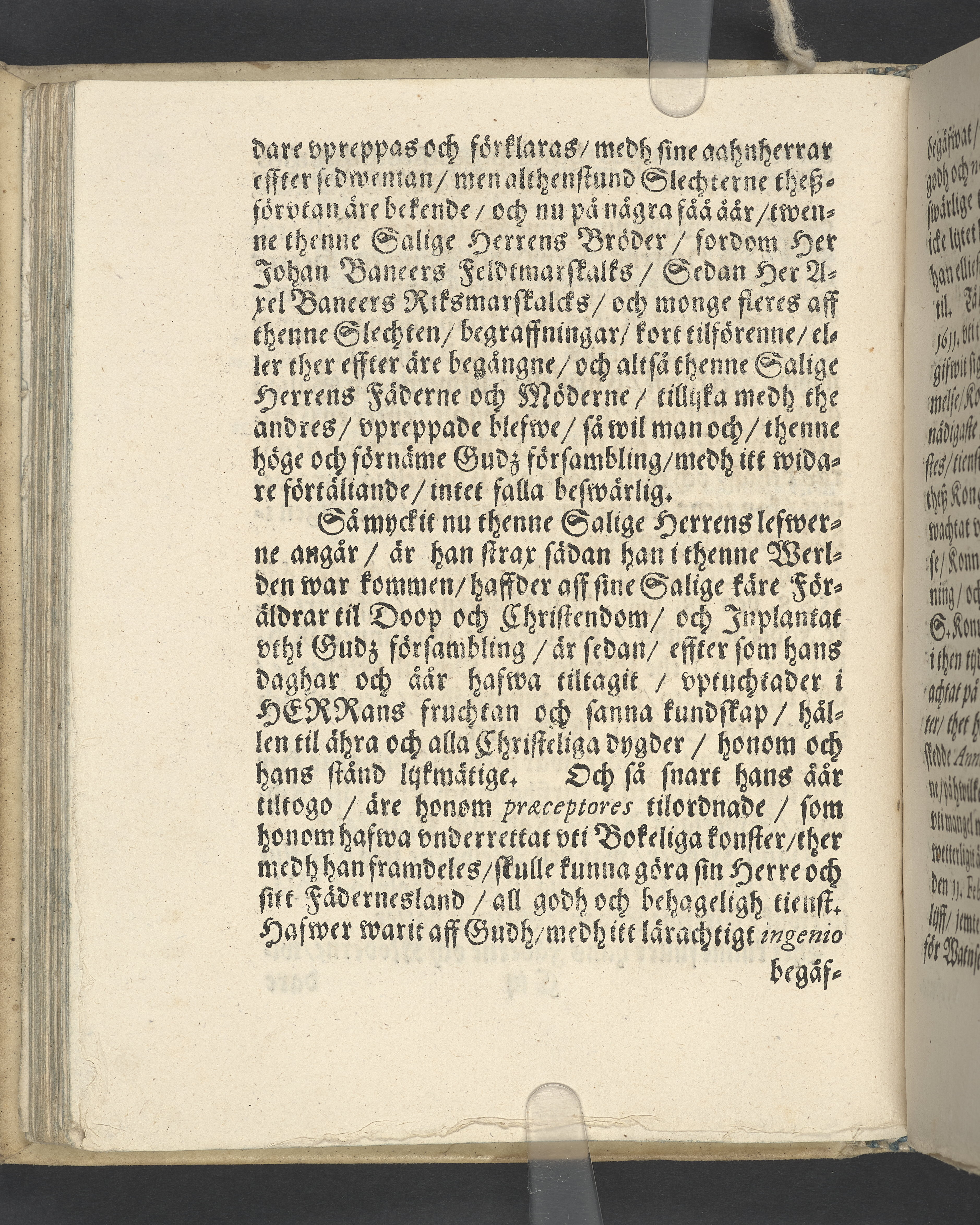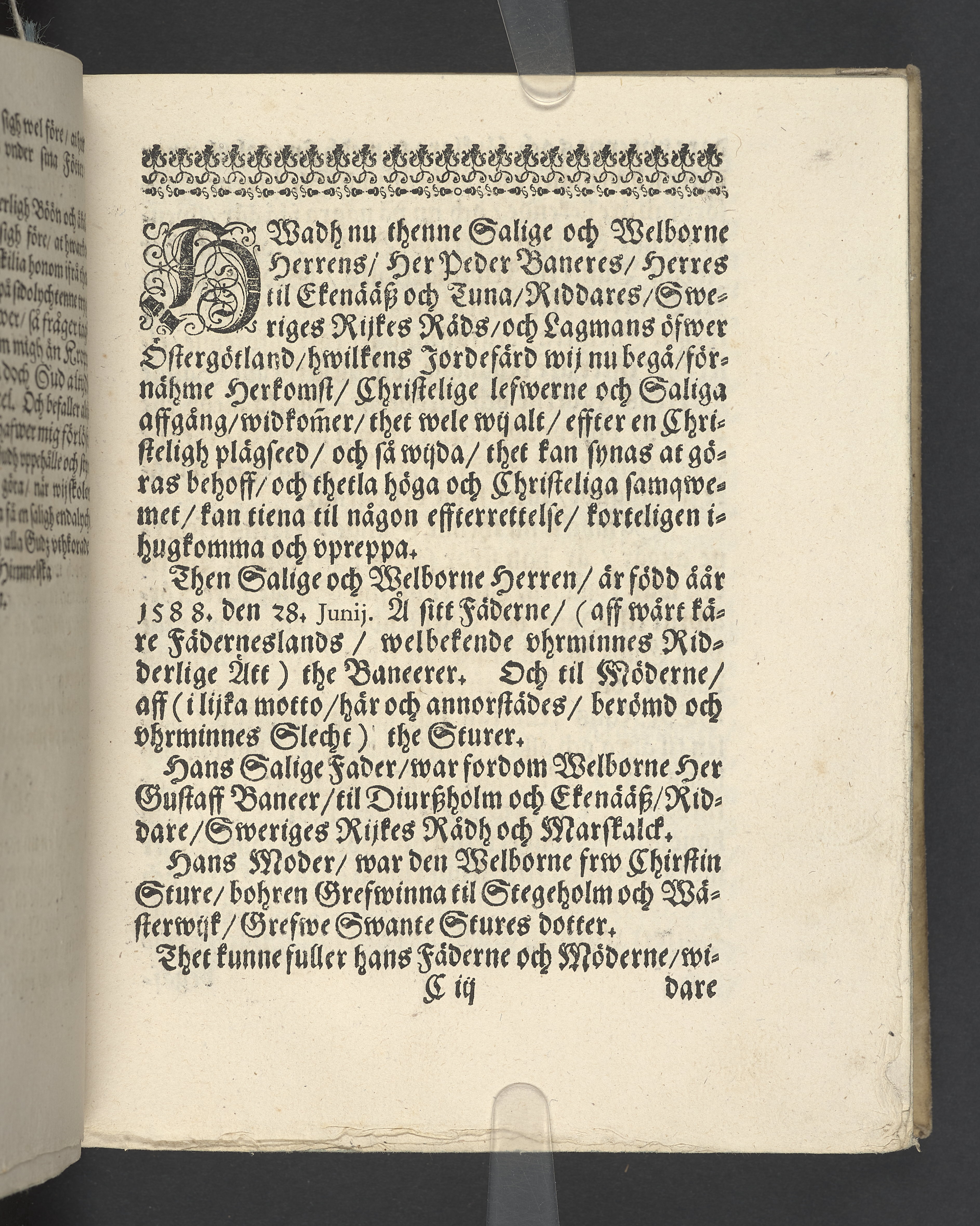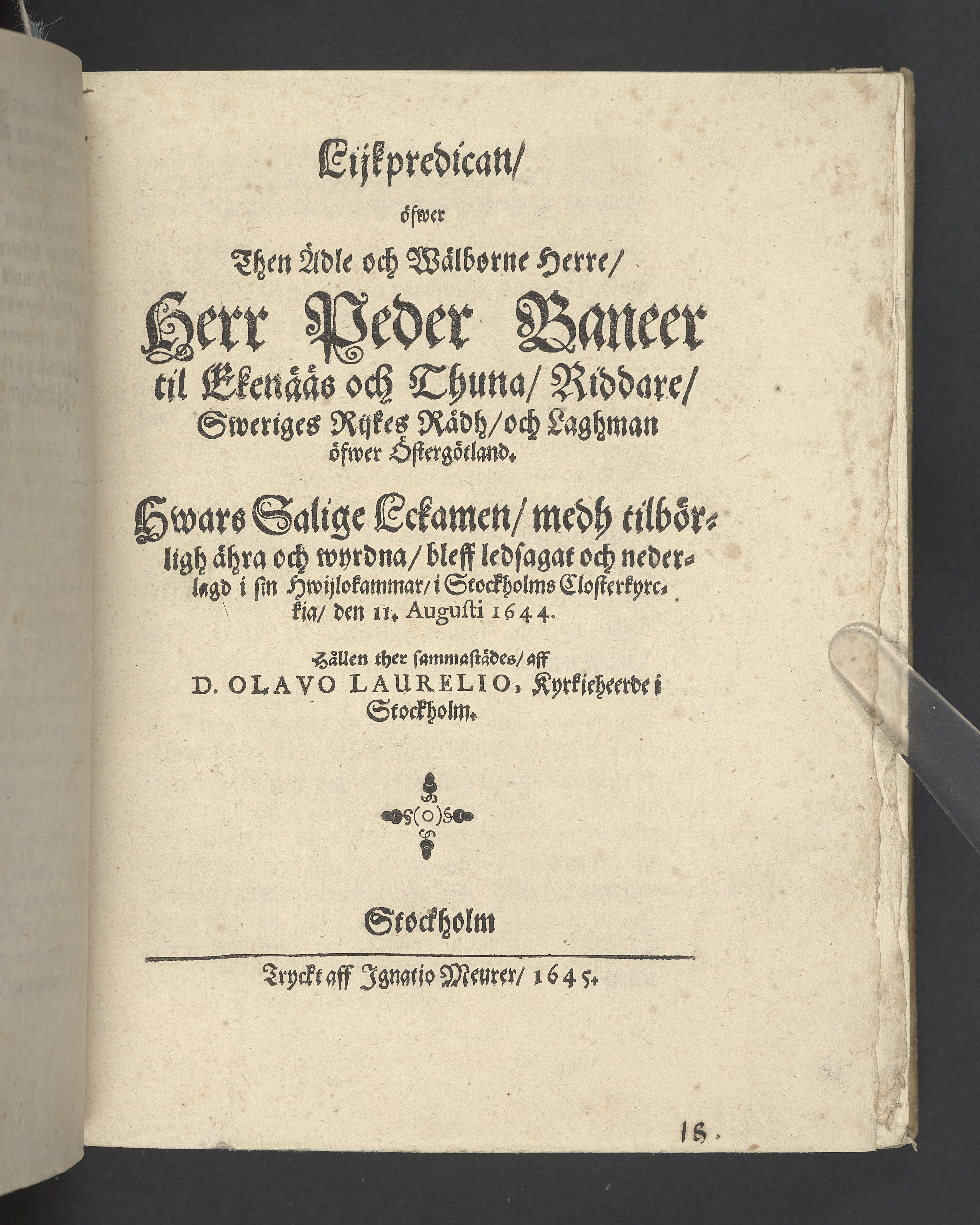 Lijkpredican, öfwer... herr Peder Baneer til Ekenääs och Thuna... Hwars salige lekamen... bleff... nederlagd i sin hwijlokammar, i Stockholms Klosterkyrckia, den 11. augusti 1644... Stockholm tryckt aff Ignatio Meurer, 1645.