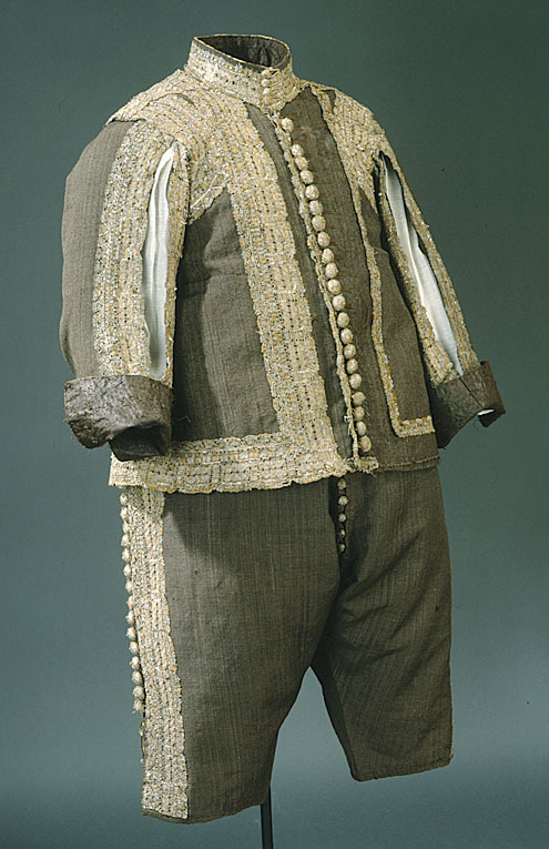 Byxorna som är snedskurna längs den inre bensömmen är av relativt snäv modell. De består egentligen av 4 stycken men har utefter sidsömmarna försetts med tillskarvade remsor med stadkant mot sidsömmen av ca 7 cm bredd (de är ej lika breda på fram- och bakstyckena och ej heller lika breda hela vägen uppifrån och ner), däremot har man ej skarvat byxorna i grenen. De är hopsydda längs den raka sidsömmen samt de sneddade bak- och framkanterna. Framtill är ett ca 30 cm långt sprund, med en 23 cm lång knäppslå. Denna har endast 9 knapphål, som till sin typ påminner om fröhus. Upptill är byxorna fastrynkade vid den endast 116 cm långa linningen, som hopskarvats av 4 olika stora bitar. Denna knäppes framtill med 2 st (d: 2 cm) stora knappar. På vänster framsida sitter en liten urficka, genom vars hål i linningen den främsta byxhaken fästs. Alla 4 (ca 4 cm långa) metallhakarna är kvar. De är 3 från baksidan stuckna genom övertyget och fastsydda på baksidan på fodret. Nertill vid knäna har byxorna ca 11 cm långa sprund i yttersömmen, dock saknas här avslutande garnering, Endast en enkel skoning, ca 1 cm bred, i form av en rak remsa, avslutar byxbenen. (Remsan går i motsatt riktning mot plagget i övrigt och alltså i inslagsriktningen). Anmärkningsvärt är att sidofickorna inte placerats i sidsömmarna, utan ungefär 10 cm framför desamma. På höger sida framtill sitter en mindre, likaledes vertikalt inskuren ficka, ca 15 cm från främre kantens översta punkt. (Skoningen kring fickorna är ej heller tagen på snedden av tyget, eller speciellt avpassad för sitt ändamål, utan består av en rakremsa av kamlott som går runt sprundet, så att man nertill har varit tvungen att göra ett"nyp" i tyget och sammanhållit det med en liten sydd träns). Fickorna är fodrade med flammig taft (52x36 tr/cm2) med undantag av den mindre fickan fram, som fodrats med samma randiga taft som hängslena är klädda med. Framkanten är skodd med ylletyget, fast den lilla knäppslån är fodrad med mörk olivfärgad taft (58x21 tr/cm2, vars stad delvis finns bevarad, 12 rosa, 6 vita trådar etc.) Mitt i sidsömmen garneras byxorna med en rad av knappar (d: 2 cm) varav 21 st alltjämt finns kvar i varje sida. I sidorna sitter också byxornas spetsar. På bakstyckena saknas den bredare spetsen. Ursprungligen skulle det sitta en rad smal spets närmast sidsömmen och utåt en rad bred spets på varje stycke. Till hela dräkten skulle det fordrats ca 10,5 meter bred spets och 12 meter smal spets. Nertill vid byxbenen saknas dock troligen avslutande garnering. Ursprungligen har byxorna också haft dekor av bandrosetter. Spår av 3 rosetter på vardera framstycket syns nedanför linningen i triangulär placering och 2 nere vid knäsprunden i vertikal rad. Byxorna är med bläck på fodret märkta: "N 65" (= nr 1789-90 års inv.).