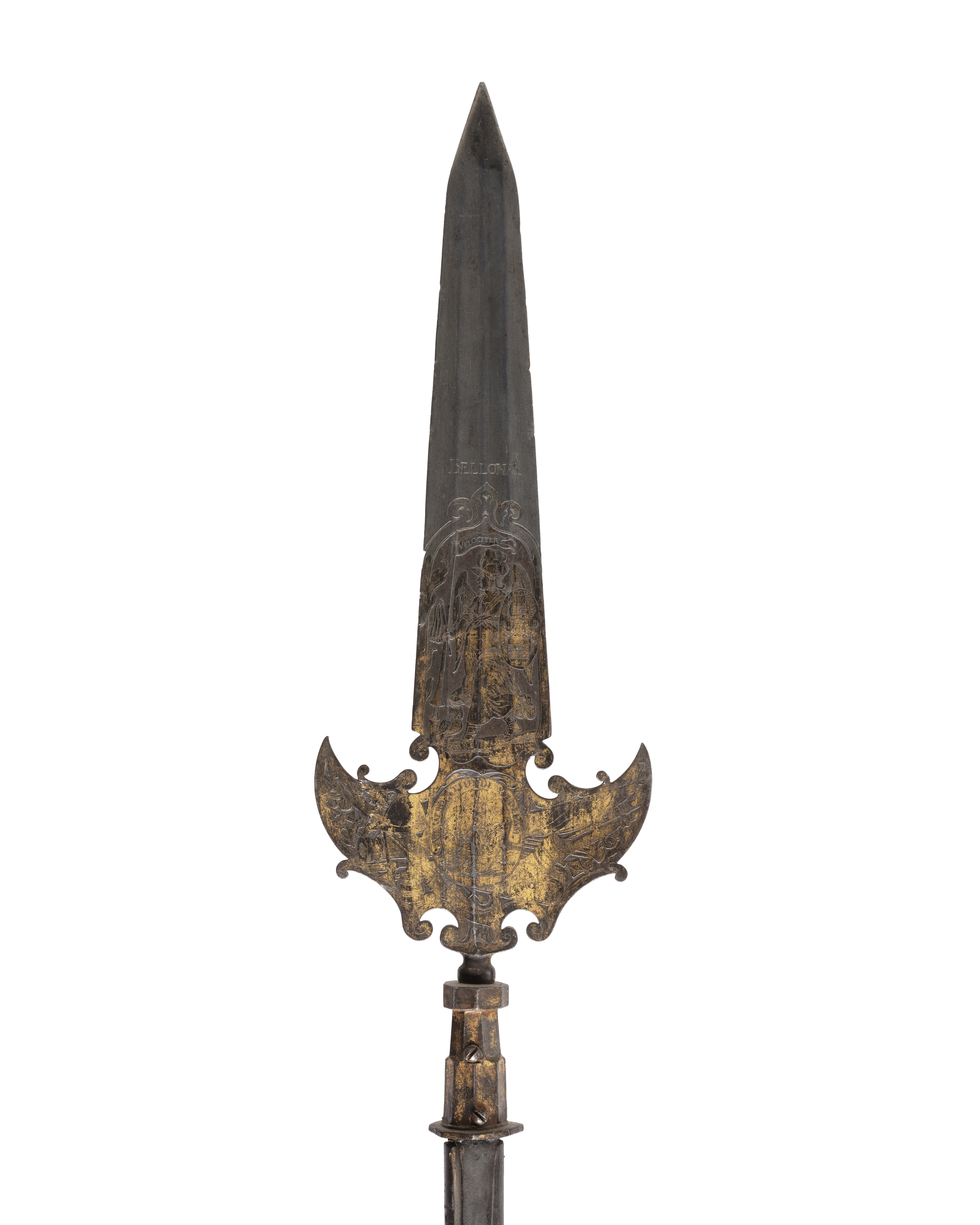 Klinga med tämligen brett blad och symmetriskt konturerade vingar. Bladet med fyra längsgående grunda hålkälar och trekantigt utdragen spets. Vingarnas form av nederländsk-tysk typ. Bladets nedre hälft och vingarna med en sammanhängande, etsad och förgylld komposition, på ena sidan: över kompositionen etsat "Bellona", därunder gudinnan med på vänster arm oval sköld med ätten Wrangels stamvapen, varöver "CGW", i höger hand lans med lansflagga varpå inskriptionen "VELOCITER". Vid Bellonas fötter vishetens symbol, uggla. På vingarna trofegrupper, därimellan betande hjort träffad av pil inskriven i oval med omgivande text: "NON QUERO ALIUNDE MEDELAM". På andra sidan: "PALLAS", därunder gudinnan med sköld på vänster arm (ätten Wrangels stamvapen), i höger hand lans med lansflagga med inskriptionen "PRUDENTER". Under figuren etsat "CGW". På vingarna trofegrupper, därimellan Ganymedes ridande Jupiters örn, omgiven av texten: "NON EST MORTALE QUOD OPTO". 80 mm hög förgylld holk. Skaft av svartmålat trä, med på båda sidor 540 mm långa stålskenor, fästade med sex stift (fyra stifthuvuden saknas). Doppsko av stål, 140 mm hög.
