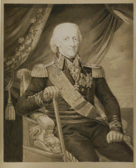 Knäbild , sittande. Fas höger. Uniform. Ordnar , bl.a. Karl XIII:s orden , Gyllene skinnet , Serafimerorden samt Svärdsordens svärd. Ordensband. Höger hand stödd på en käpp. Draperi i fonden. Förgylld ram med kunglig krona , 3354:3 , och lager och eklövskvistar. Pastellagelister. Ramlistens bredd 70 mm. På papp på baksidan med blyerts : "N3 gula Rummet" (överstruket) , "Gula förmagett". "3" , "Nro 1" och "No 4" , ca 2 cm högt.