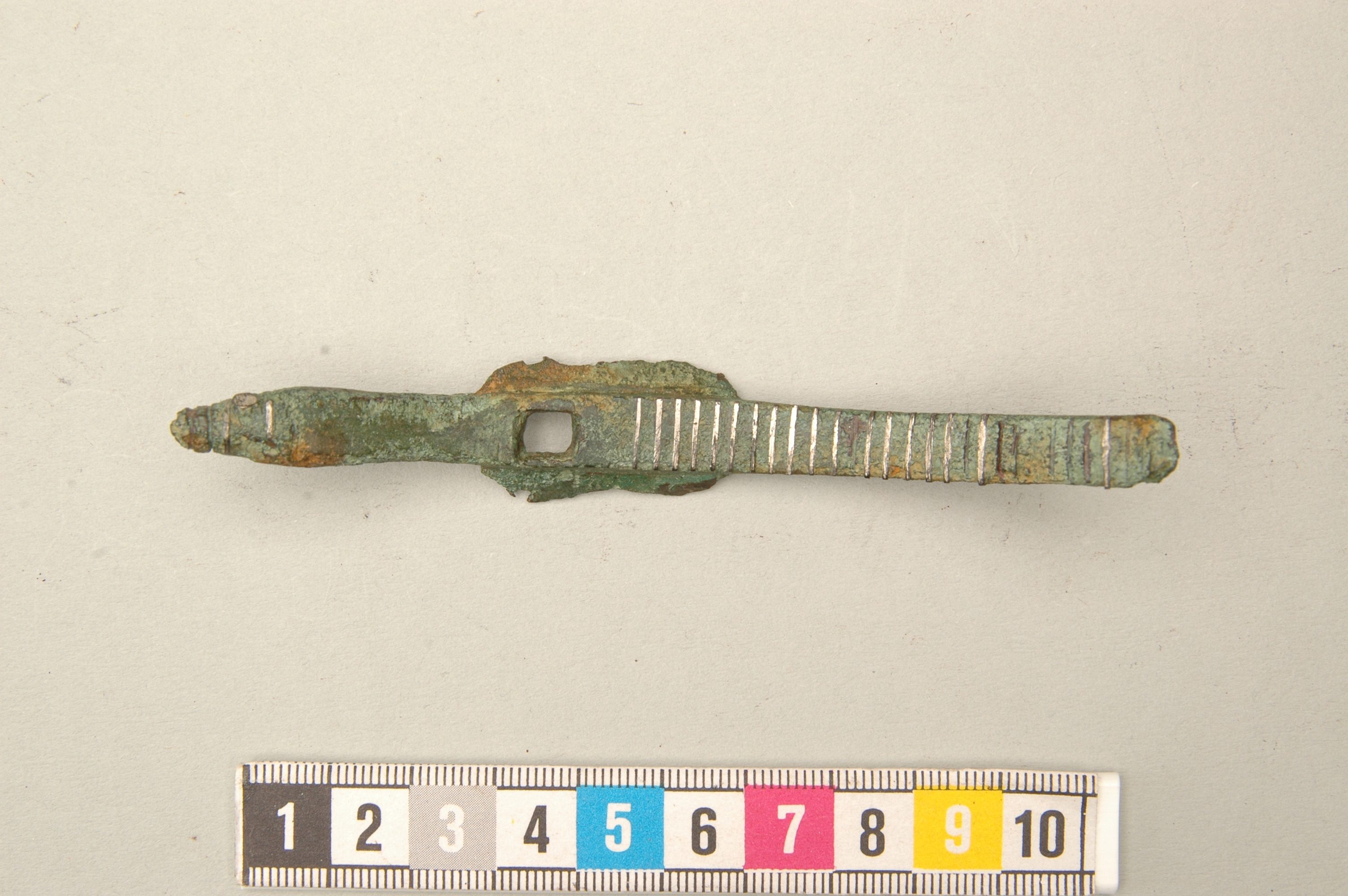 Smalt, böjt, med smala tvärgående silverränder inlagt brsonbeslag. Ett fyrkantigt hål.