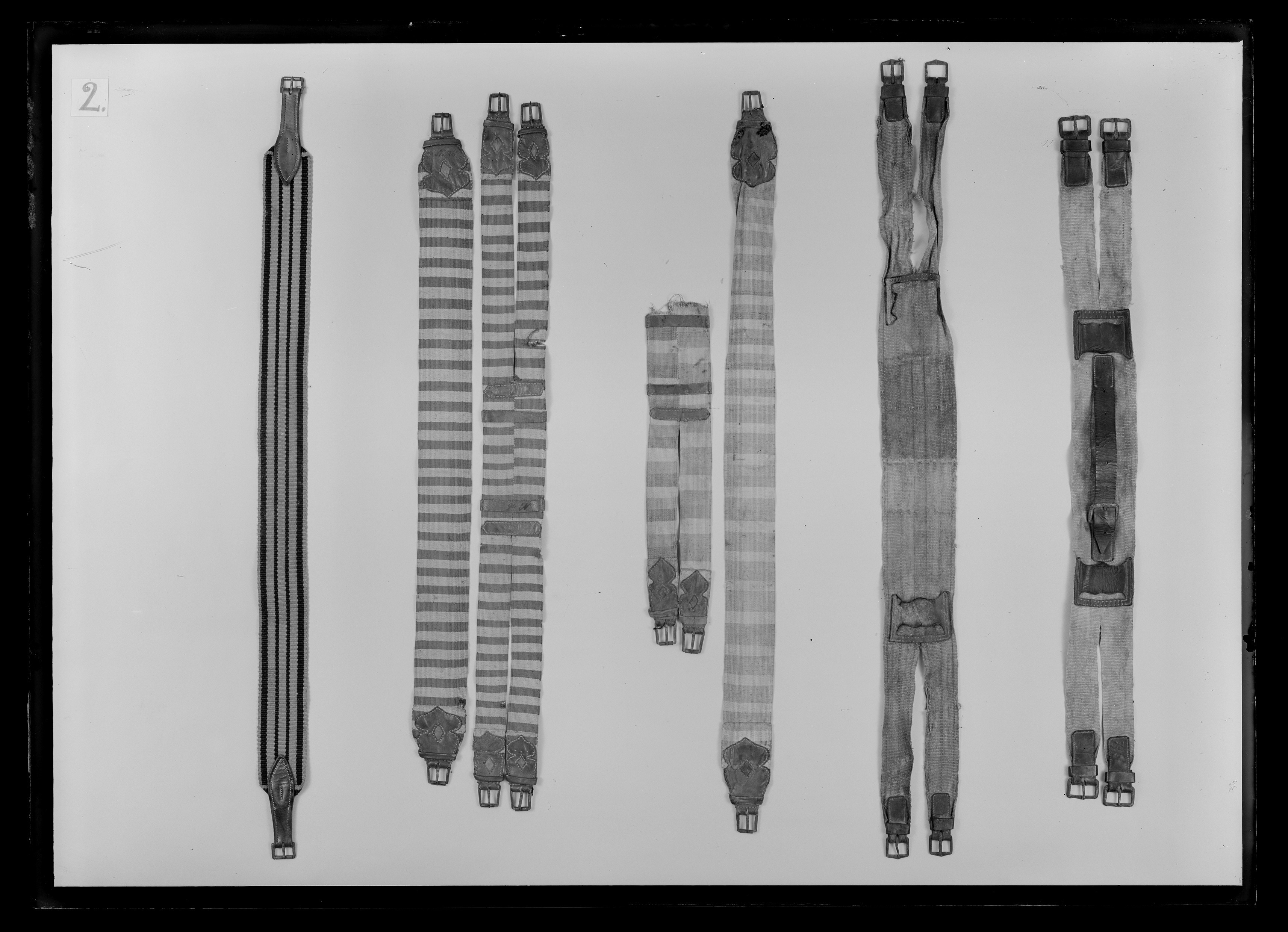 1 Sadel af blommeradt sammet. Sätet är stickadt med silfver, sömmarne äro försedde med guldfransar, deraf en del borta, och galoner, deraf en del borta, Sadelkåpan, hölsterkapporne och schabraket äro broderade med upphöjdt arbete samt guld och silfwer i grönt blommeradt och rödt silke. Fransarne omkring sadeln och schabraket samt hölsterkapporne äro af massifwa kantiljer med guldgalon. Sadelknappen med en ögla till pistolhölstrens anspännande af förgyldt Messing. Förbygeln är af blått saffian, stickad med silfver och guld samt kantad med guldgalon, 13 (ändrat till 5) pucklor, 6 sleifar, 2 tampar och 2 söljor af förgyld messing. Ryggstycket är äfvenså af blått saffian samt försedt med 3 pucklor, 3 slejfar 1 tamp och 1 sölja af nätt drifvet arbete af förgyldt silfver 112) samt med en bouquette af guld och silfverband. (på h. sida - 112 - arbetet är af förgyld messing, ej silfwer) Stigremmarne äro likaledes af blått saffian med 2ne förtenta jernsöljor. 113) (på h. sida - 113 - söndrige) Stegbyglarne äro af förgyldt messing. Höllstren, af blått saffian, äro chamererade med silfwer och guld, infattade med guld och silfvergaloner samt remmarne försedde med 2ne förtenta jernsöljor. Husen öfver pistolkapporne äro af blommeradt ferandin med en silfver och guldspets chamererade samt ofvanom ornerade med en guld och silfver galon. Litsquarden, hvarmed husen upp- och igendragas, är af guld, silfver och blått silke. Hufwudstället är af blått saffian, stickadt med guld och silfwer samt kantadt med guldgalon. Beslaget är af förgyldt silfwer, bestående af 47 stycken med 4 kedjor. Tyglarne af blått saffian, stickadt med guld och silfver, kantade med guldgalon, försedde med 4 beslag af förgyldt messing Betselstängerne och pucklorne äro af förgyldt drifvet arbete. 1 Litsqvard af guld, silfver och blommeradt silke med en qvast uti ena ändan. Den har warit brukad i swanskappan. 1 Bukjord af swart silke med inwäfdt silfwer samt 2ne tampar af silfwer. Denna sadel har Konungen af Frankrike förärat Konungen. Pistolerne till denna sadel är upptagne under no 402/53 Rubrik: Inventarium öfwer de Persedlar, som till Kongl. Klädkammaren blifwit afflyttade från Kongl. LifRustkammaren, upprättadt år 1855 Tid. inv. nr.: 46 Sida: 61 Nr. i föreg. inv.: 581 Anmärkning: ex B sid. 111 f.