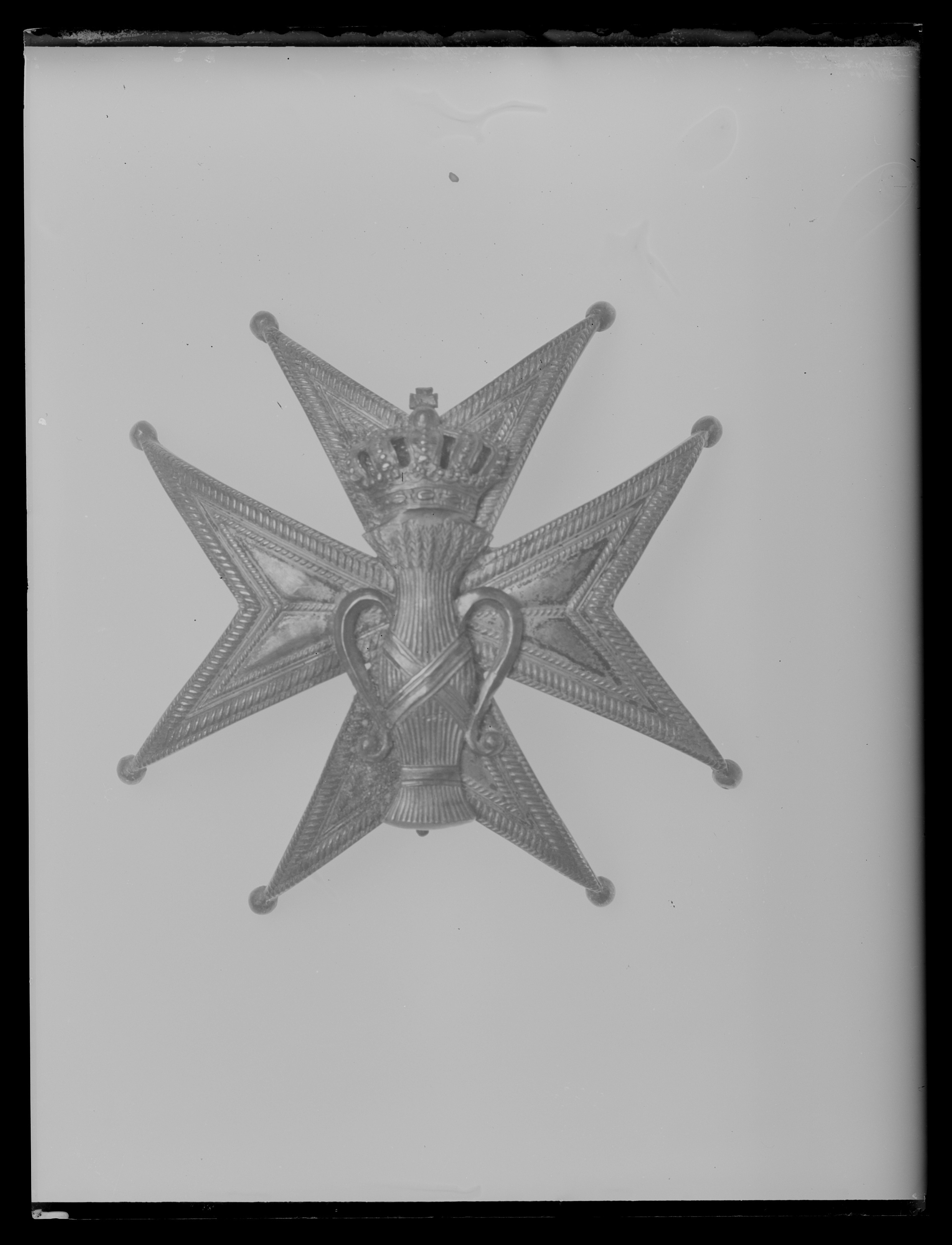 Malteserkors av silver, delade armar, kantning och delning av repstavar av olika grovlek, kulor på armarna. På korset lagt en med kunglig krona krönt vase, fäst med tre på baksidan utvikta dubbla tenar. Vertikalt placerad säkerhetsnål.