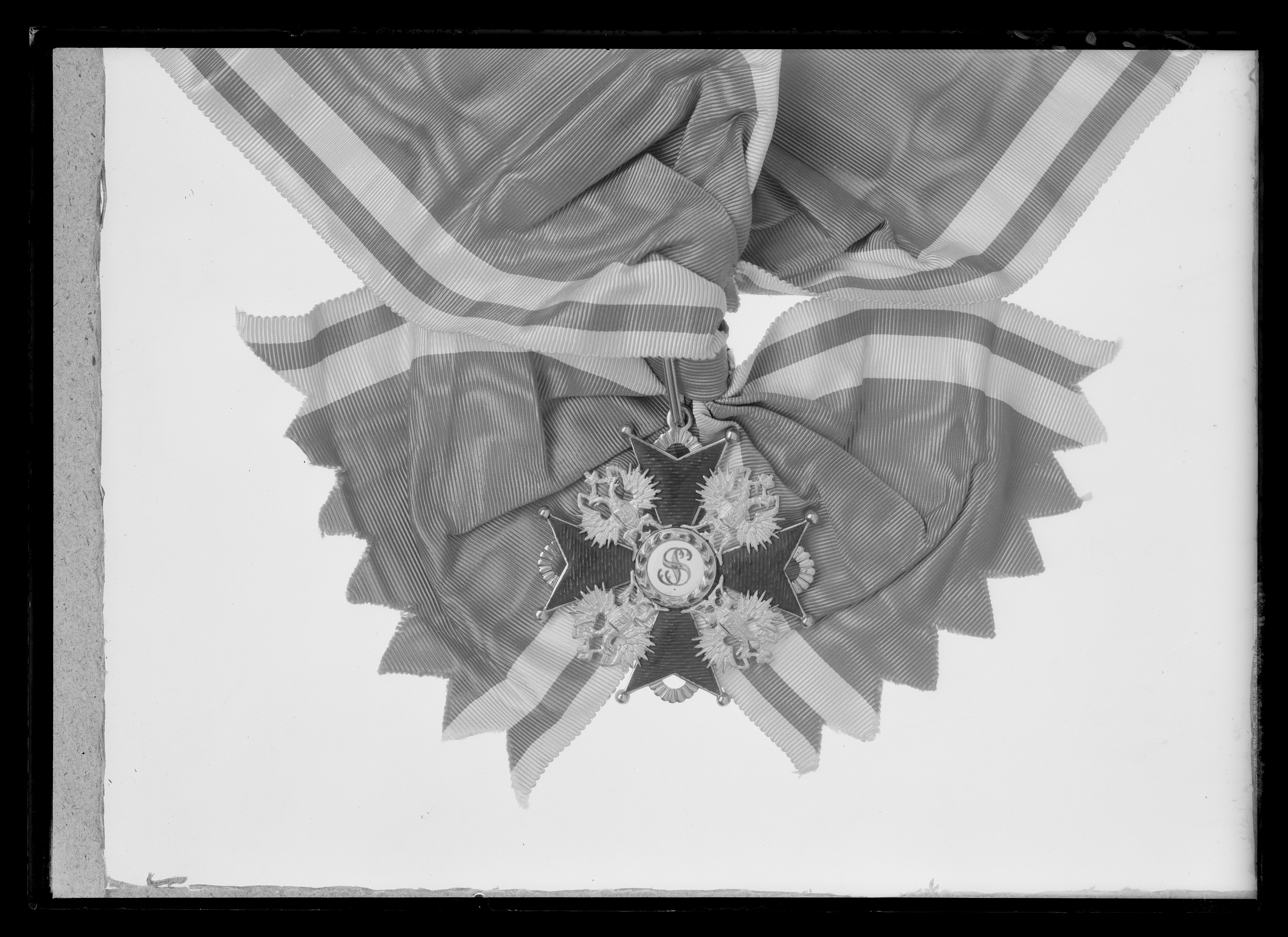 Malteserkors av guld med kulor på spetsarna, korsarmarna på åtsidan täckta med röd,genomsynlig emalj. Mellan och delvis på korsarmarna ryska dubbelörnar pressade i guldbleck.Svagt välvd medaljong, täckt med vit emalj, därpå målat med rött namnchiffer: SS. Kantringav guld med grönemaljerad lagerkrans. Frånsidans medaljong av samma utseende men med slät kantring av guld. På korsarmarnasbaksidor stämplar, på den övre den ryska dubbelörnen, på den nedre I K. Mellan korsarmarnasspetsar räfflade cirkelbågar av guld, på den övre en platt guldring, på baksidan otydligstämpel. I ringen fäst en oval bandring.
