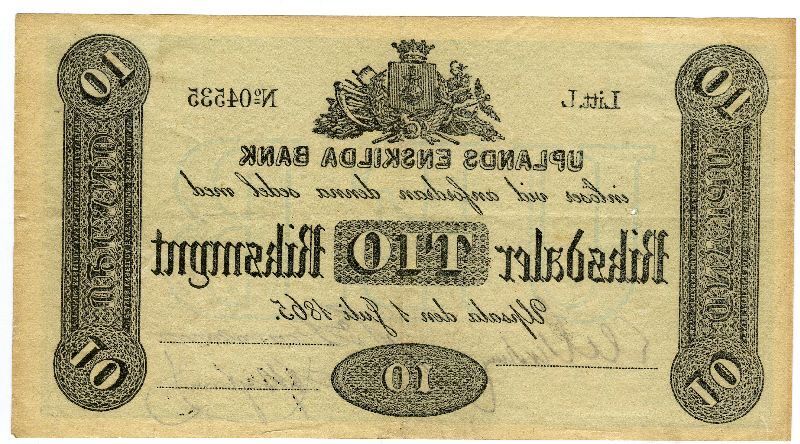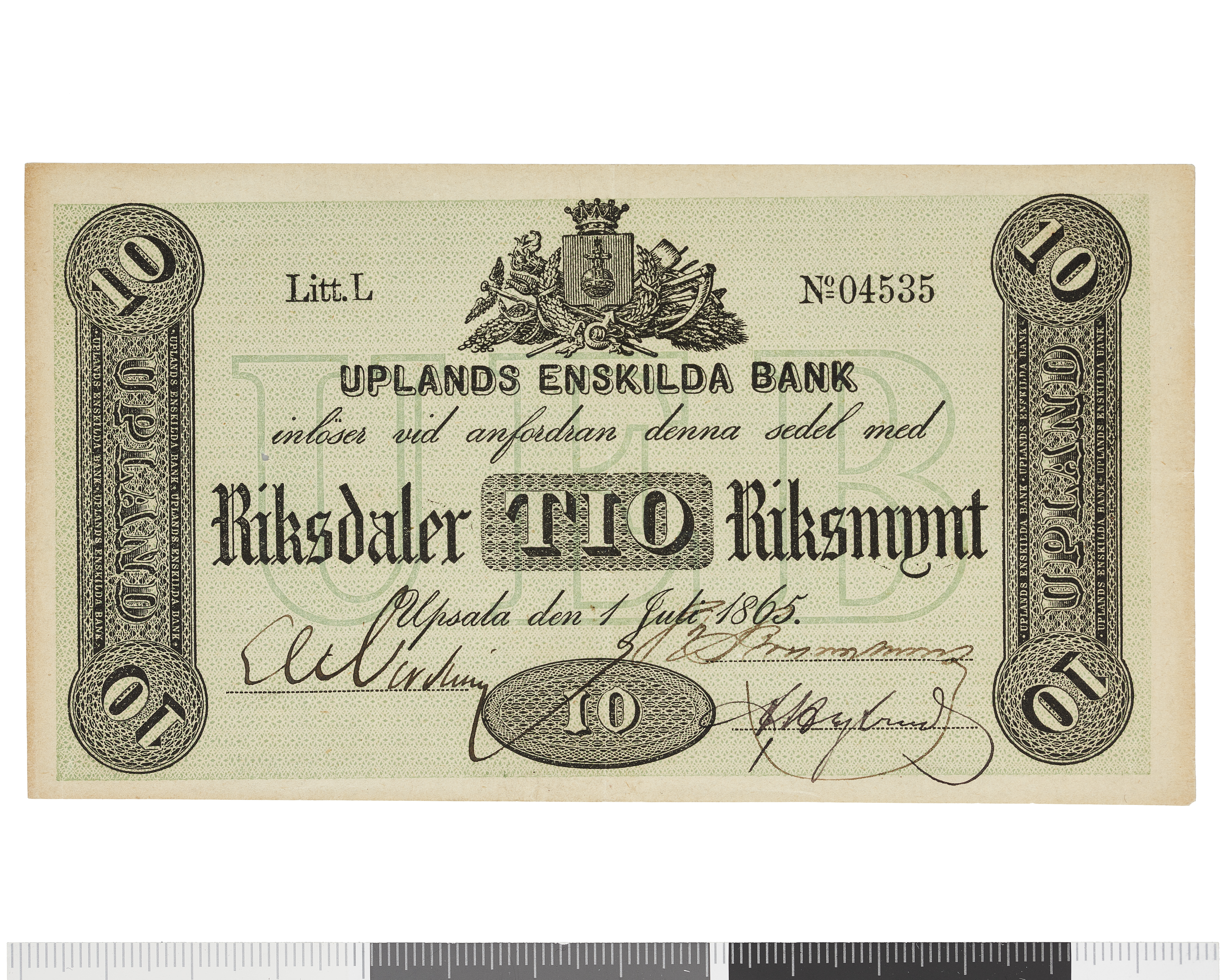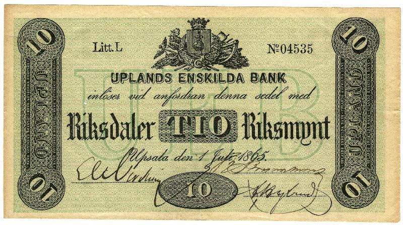 Upphov: Uplands Enskilda Bank. Media: Bonnevier, Helena. Ekonomiska museet - Kungliga myntkabinettet/SHM, (PDM) Upphovsrätten till detta verk har gått ut och är därmed fritt att använda på alla sätt. Ange gärna upphovsperson om denne är känd.