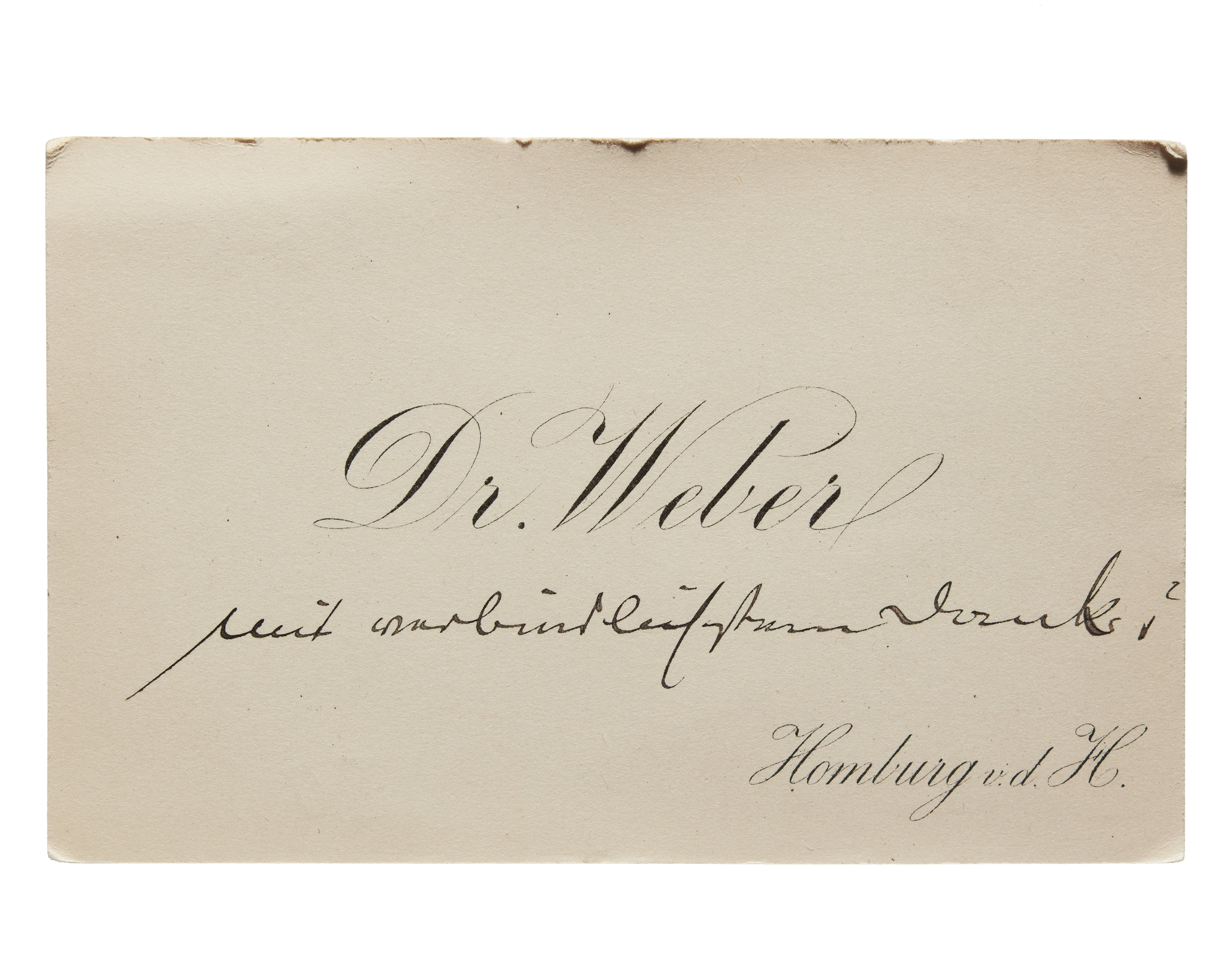 Ett visitkort från Dr Weber, utan datum. Adress (nedre högra hörnet) Homburg v. d. H. Handskrift, troligen på tyska. Oläsligt.