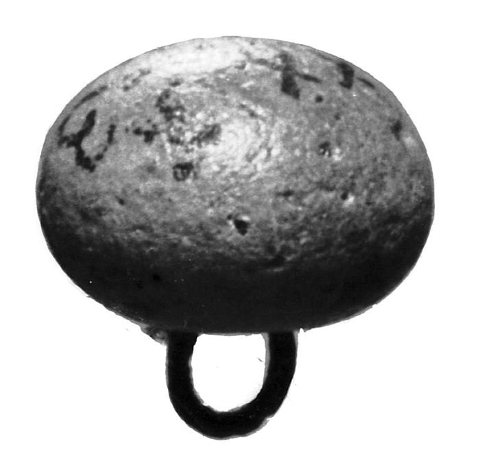 KNAPP Överdragen med gråbrun glasliknande massa. Nästan klotformig, med ringformig ögla av smal tråd Diameter: 1,3 cm