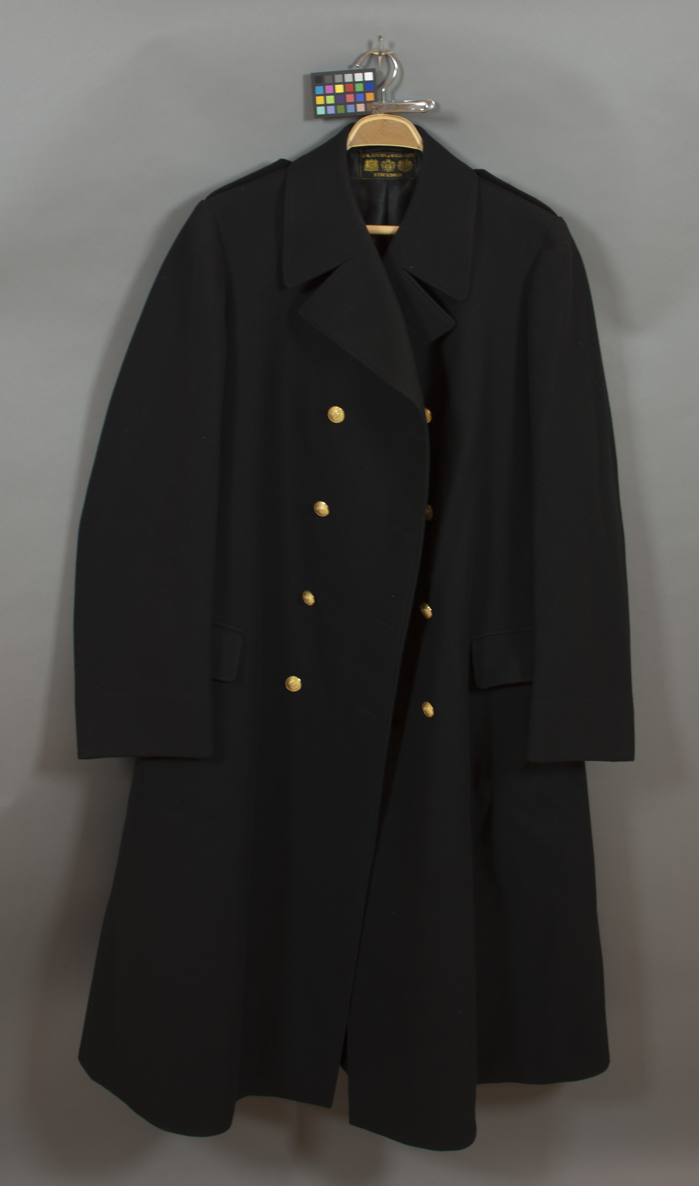 J. M. Janson & Wallgren, Stockholm. Kappa av svart kläde, med dubbel knäppning fram. Fem par, guldfärgade, kullriga knappar med en sluten kunglig krona på skrafferad botten och blank kant, diam: 22 mm. Två fickor med lock fram. Axelklaff, kantad med gulgalon, knäppt vid kragen med en knapp av samma utseende som övriga knappar samt tre guldstjärnor. Två tampar bak, ihopknäppta med två knappar av samma utseende som knappar ovan. Foder av svart siden. Två innerfickor, varav den högra har broderat monogram på insidan: "V. O.". Längst upp, på insidan mitt bak finns en 78 mm lång hälla av svart siden. Nedanför sitter en fastsydd rektangulär textillapp, b: 70 mm, h: 34 mm, i svart och gult med firmamärke: "J. M. JANSON & WALLGREN // STOCKHOLM" samt tre vapen på rad varav det i mitten är stora svenska Riksvapnet. Sprund mitt bak, 565 mm långt, med tre sidenklädda svarta knappar på insidan, diam: 14 mm.