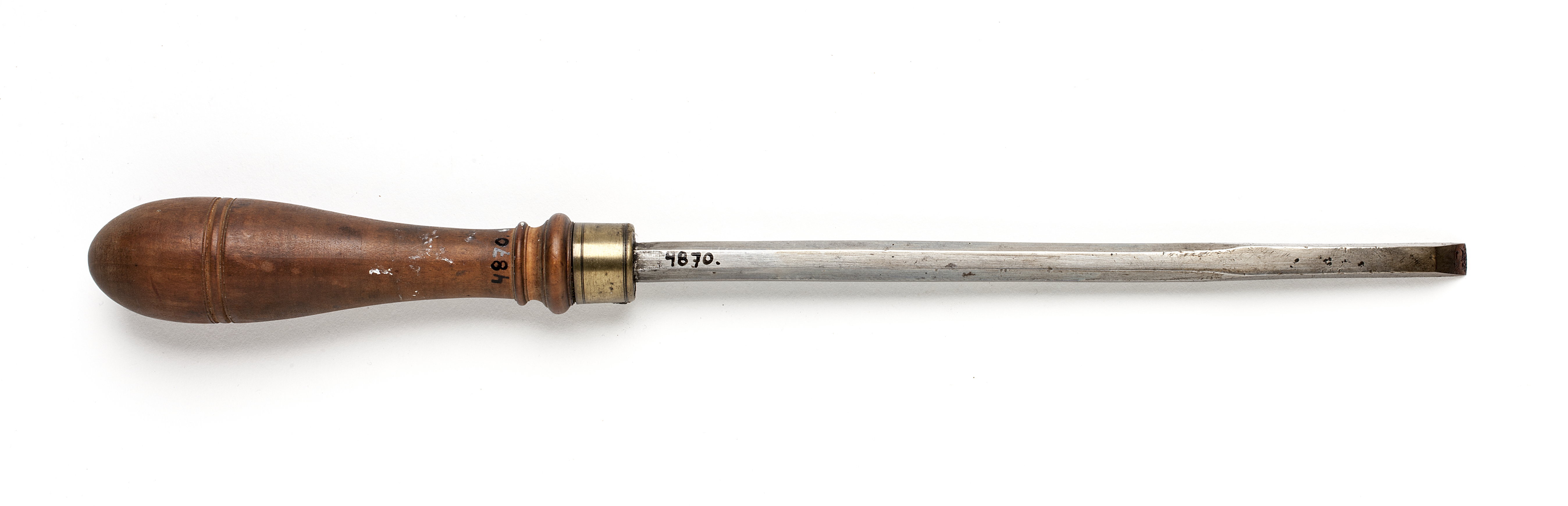 Klinga med åttsidig, i änden trapetsoidisk genomskärning. Svarvat skaft av päronträ med två vulster nedtill ("skoklostertyp"). Mässingsring. Stämpel i skaftets ände vid fästet: "16" med stansar nr 5375.