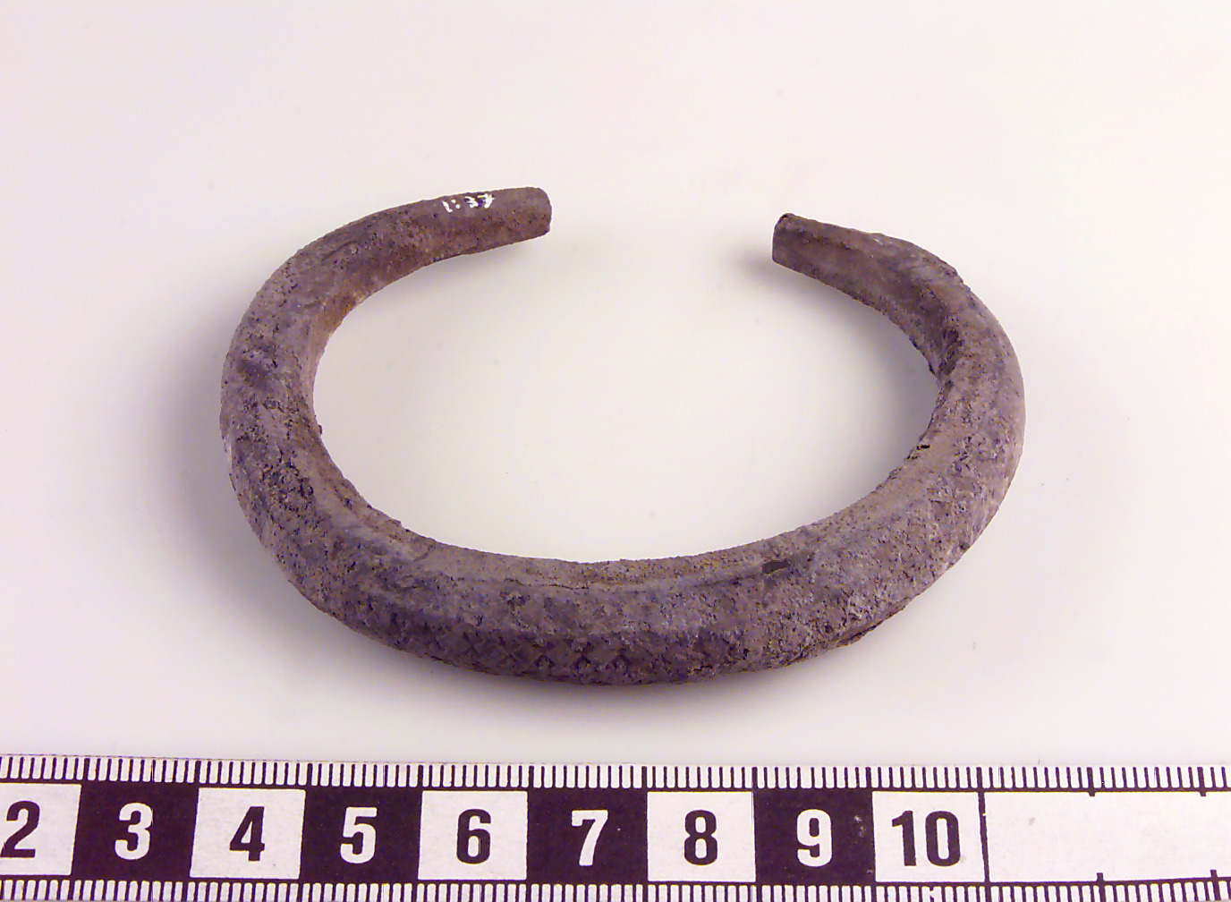 Av åttkantig ten med avsmalnande ändar. Kraftigt korroderat ytskikt. Ornerad med motställda trianglar i fyra rader.