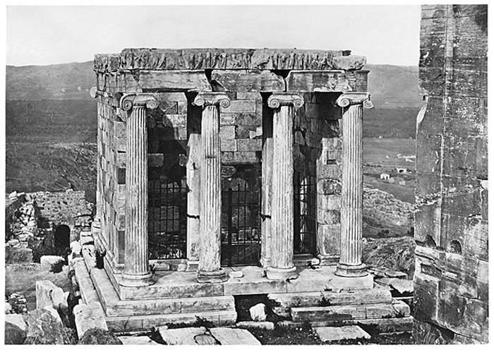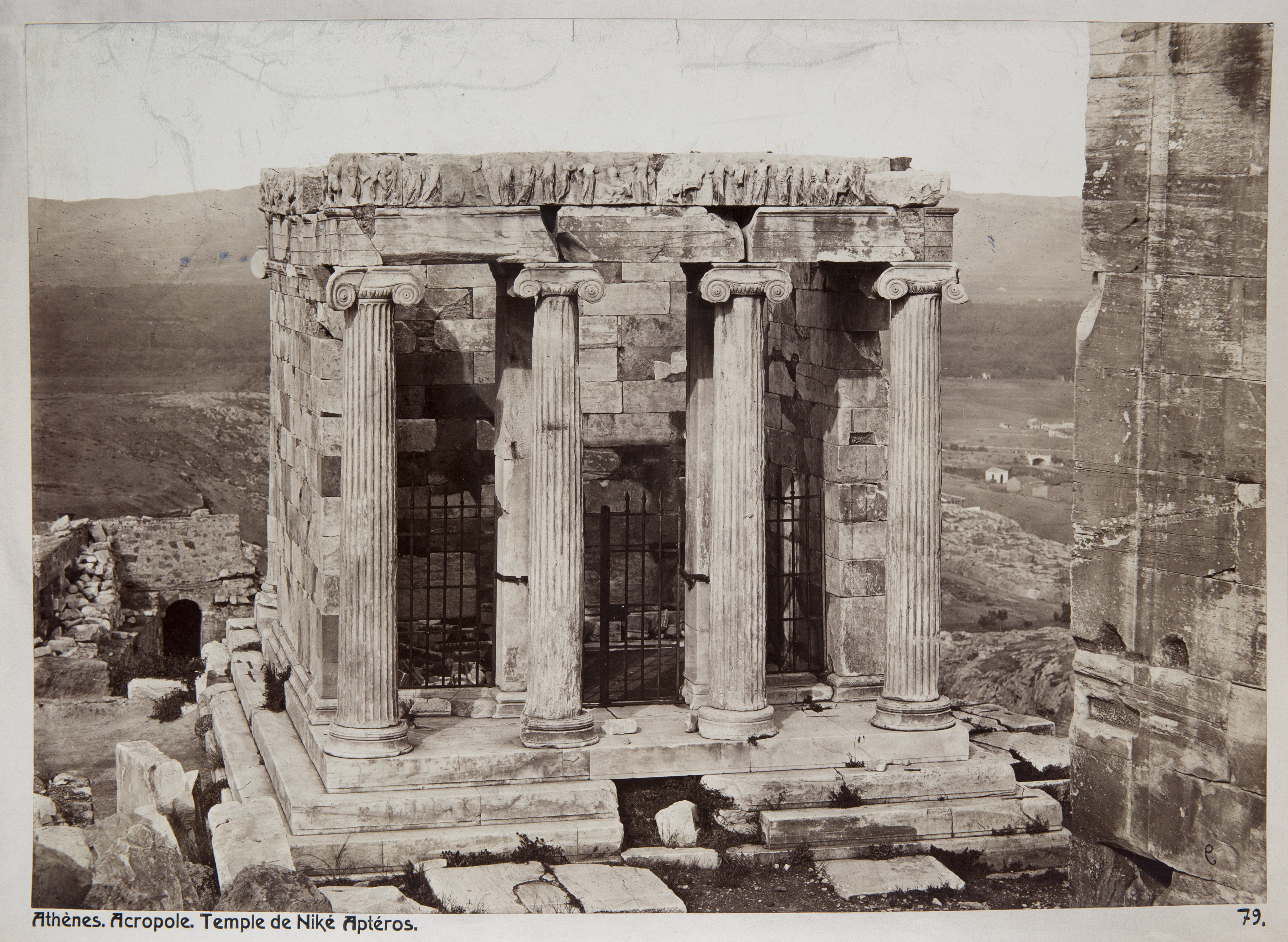 Athena Niketemplet på Akropolis i Aten, Grekland. Text på originalet: "Athènes. Acropole: Temple de Niké Aptéros." Foto från resa genom Grekland, Makedonien och Serbien, 15 mars-6 juni 1896. Fotografierna LXVI:K.18.-147. är köpta av Wilhelmina von Hallwyl, f. Kempe på Korfu samt i Patras, Nafplion, Aten, Thessaloniki och Belgrad. Med på resan var maken Walther von Hallwyl och fröken Ida Uhse. Uppgifterna kommer från Ida Uhses reseanteckningar.