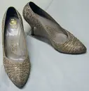 Pumps av guldlamé med en enkelsöm mitt bak. Skon har spetsig tå och en insvängd, hög och smal klack med stiftlapp fäst med två spikar i vitmetall. Lamén har beige botten med mönster av blomsterslingor i rosa och guld. Ringningen är kantad av ett beiget textilband. Skon är dekorerad framtill med fem draperade tvärställda veck samt fem små slipade och i gulmetall infattade, klara stenar/glas?. Foder och innersula av beigefärgat kalvskinn med hälförstärkning bak. På innersulan, i hålfoten finns en oval guldstämpel med text inuti: "RAYNE". På innersulans hälparti finns en guldstämpel i form av engelska riksvapnet samt text: "BY APPOINTMENT // TO H. M. THE QUEEN // SHOEMAKERS // H. & M. RAYNE LTD". På hälförstärkningens högra sida finns svart text: "Z B GODEY // 6361. 5.". Sulan är gjord av ljusbrunt läder (nöt?) med ett ristat rutmönster under tåpartiet. Stämplat under hålfoten: "MADE IN // ENGLAND". I hålfoten finns en handskriven svart tvåa.