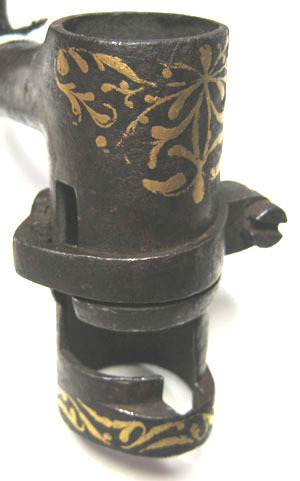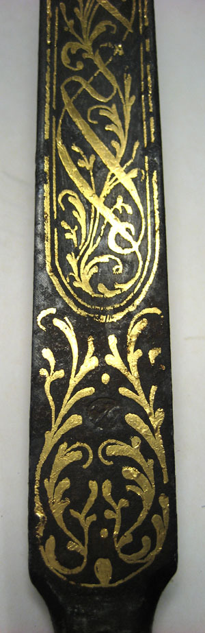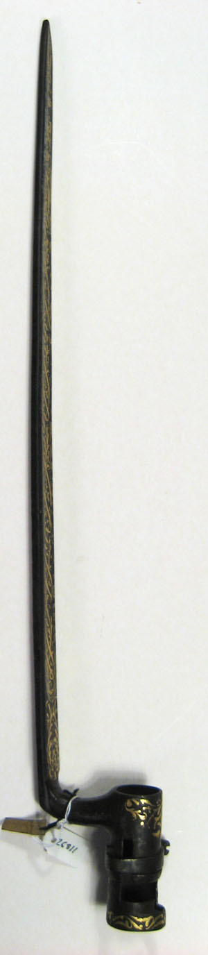 Av stål, mörkbrunt av korrosion. Rak stukatklinga med triangulärt tvärsnitt, bredare mot basen. Klingans sidor skålade, även bredsidan, vänd mot gevärets mynning. På bredsidan och hylsans över- och undre del en heltäckande dekor i form av rankverk och kantlinje av påslaget guld. På klingbasen inslagen otydlig stämpel inom cirkel. Inåtsvängd kort tånge med cirkulärt tvärsnitt, övergående i cylindrisk hylsa, l 64 mm. I hylsan Z-formigt spår med i mitten vridbar låsring med klack och spännskruv.