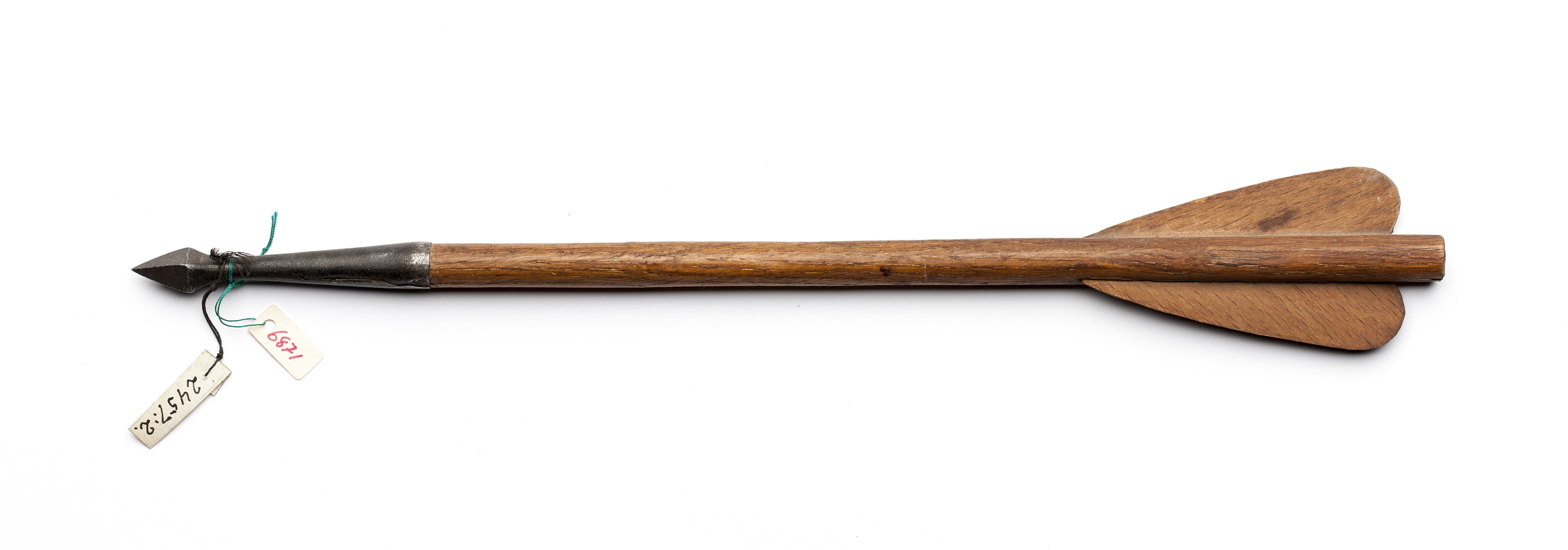 Spets av stål, fyrkantig pyramidformad insvängd framför den runda holken. Skaft av trä, runt tvärsnitt med två något snedställda styrfjädrar av trä fästa i skåror på stocken.