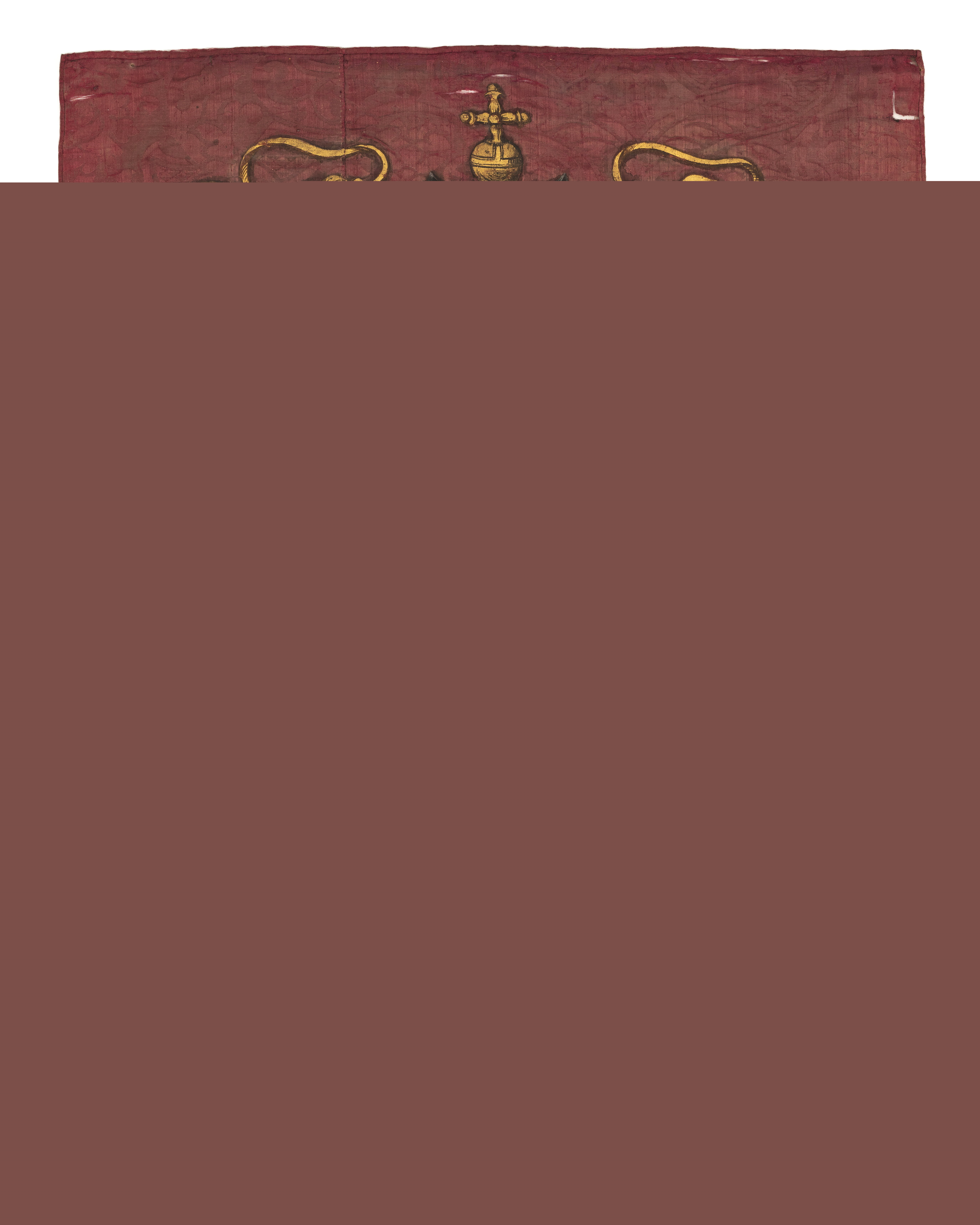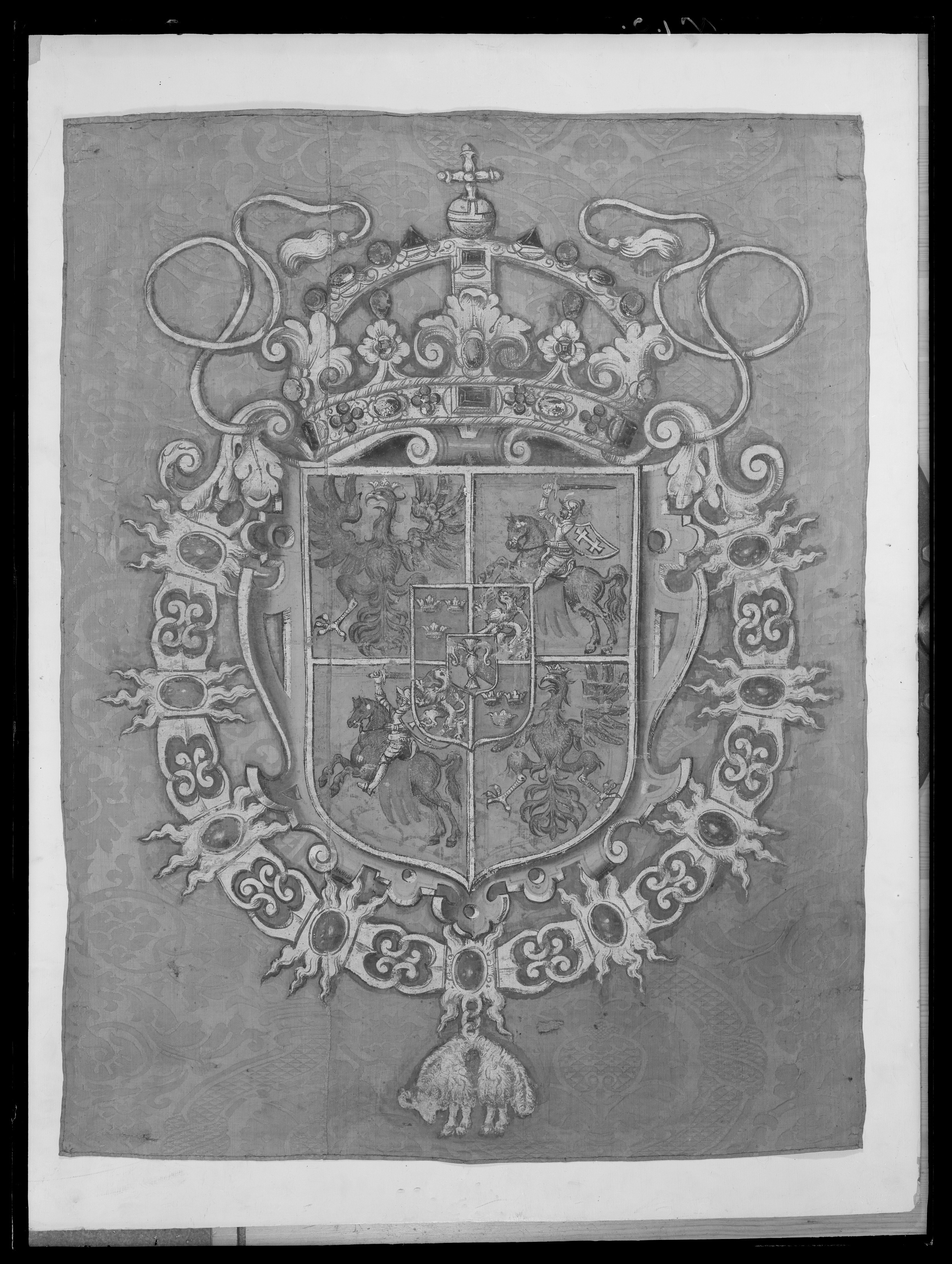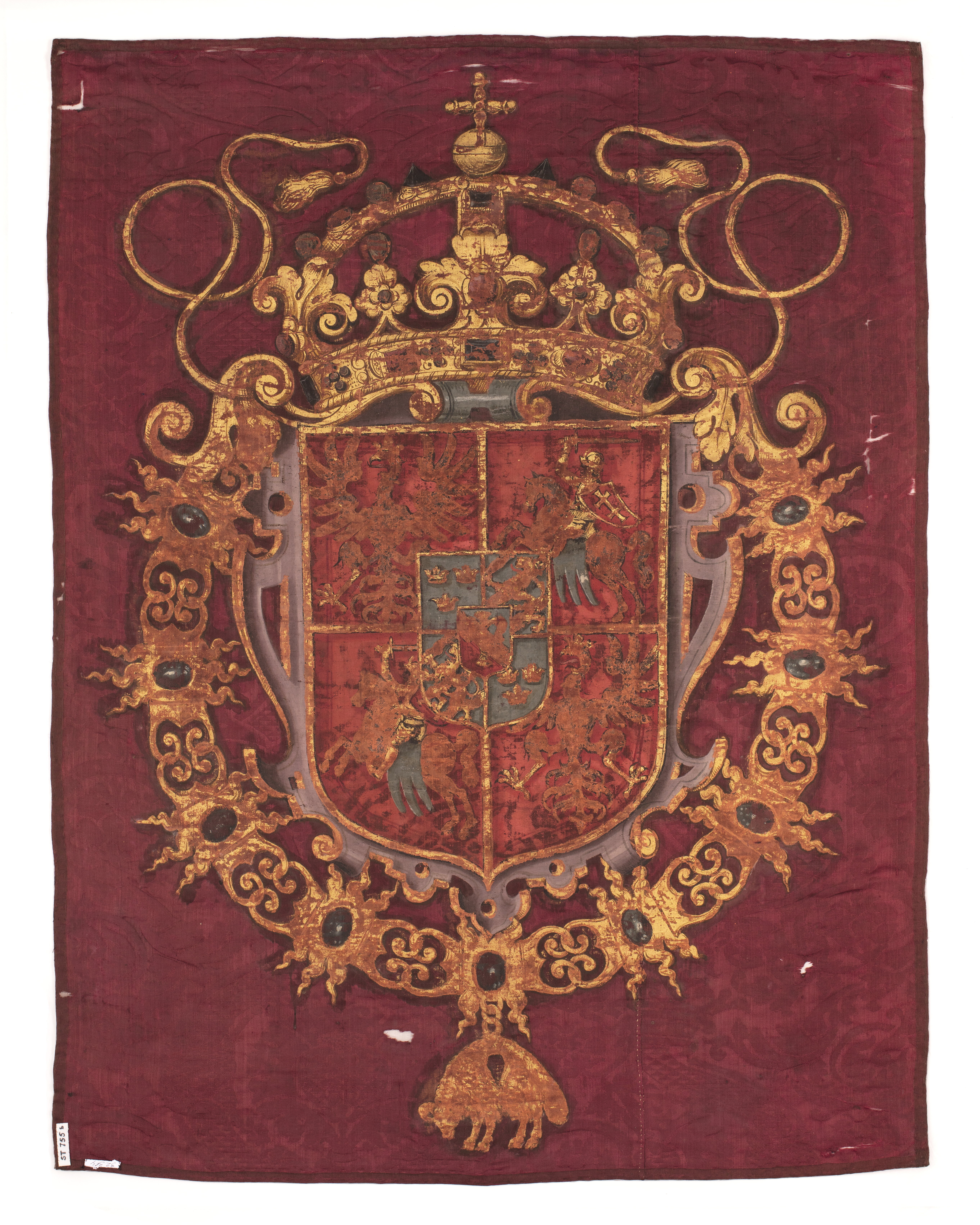 Fanduk av karminröd sidendamast i två vertikala våder, 260 och 540 mm breda, omvikta, kastade kanter. På båda sidor målat det polska riksvapnet krönt av en kunglig krona, en vapensköld lagd på en rullverkskartusch i olika grå nyanser med guldfärgade kanter, skölden omgiven av Gyllene Skinnets ordenskedja och klenod. Skölden är kvadrerad med guldkanter, alla fälten röda, i fält 1 och fyra i silver (nu grått) Polen (silverörn med guldbeväring, krönt med krona av guld), i fält 2 och 3 Litauen (ryttare i rustning av guld med lyft svärd med silverklinga och guldfäste, på v arm en röd sköld med ett två gånger korsat kors av guld. Hästen av silver med seldon av guld, hästtäcke målat med grå färg. Hjärtsköld likaså kvadrerad med guldkanter, fälten blå, i fält 1 och 4 tre kronor av guld (2,1), i fält 2 och 3 tre grå strömmar och däröver ett krönt lejon av guld. Innersköld Vasa. två gånger styckat av blått, silver och rött och däröver en Vase i guld.