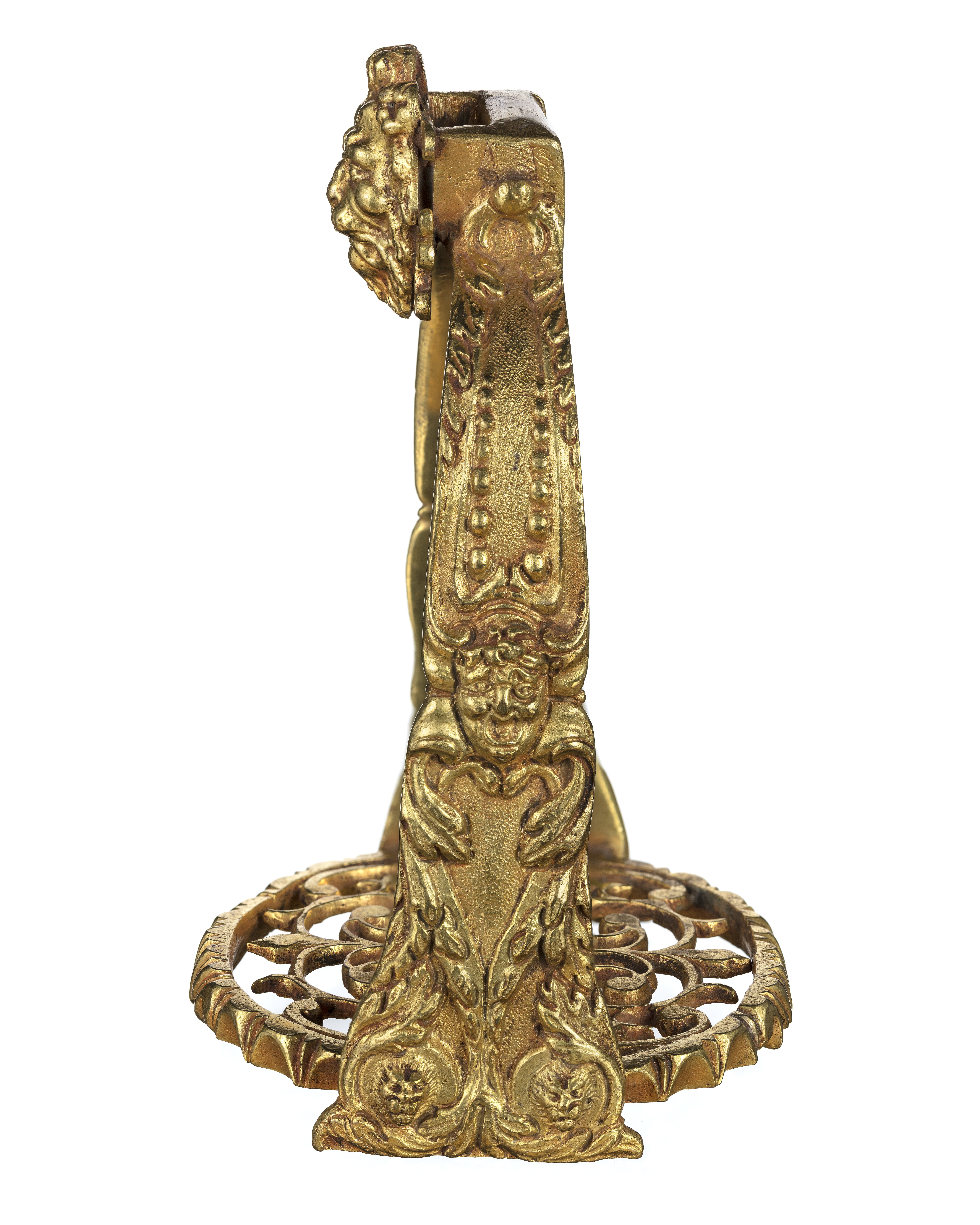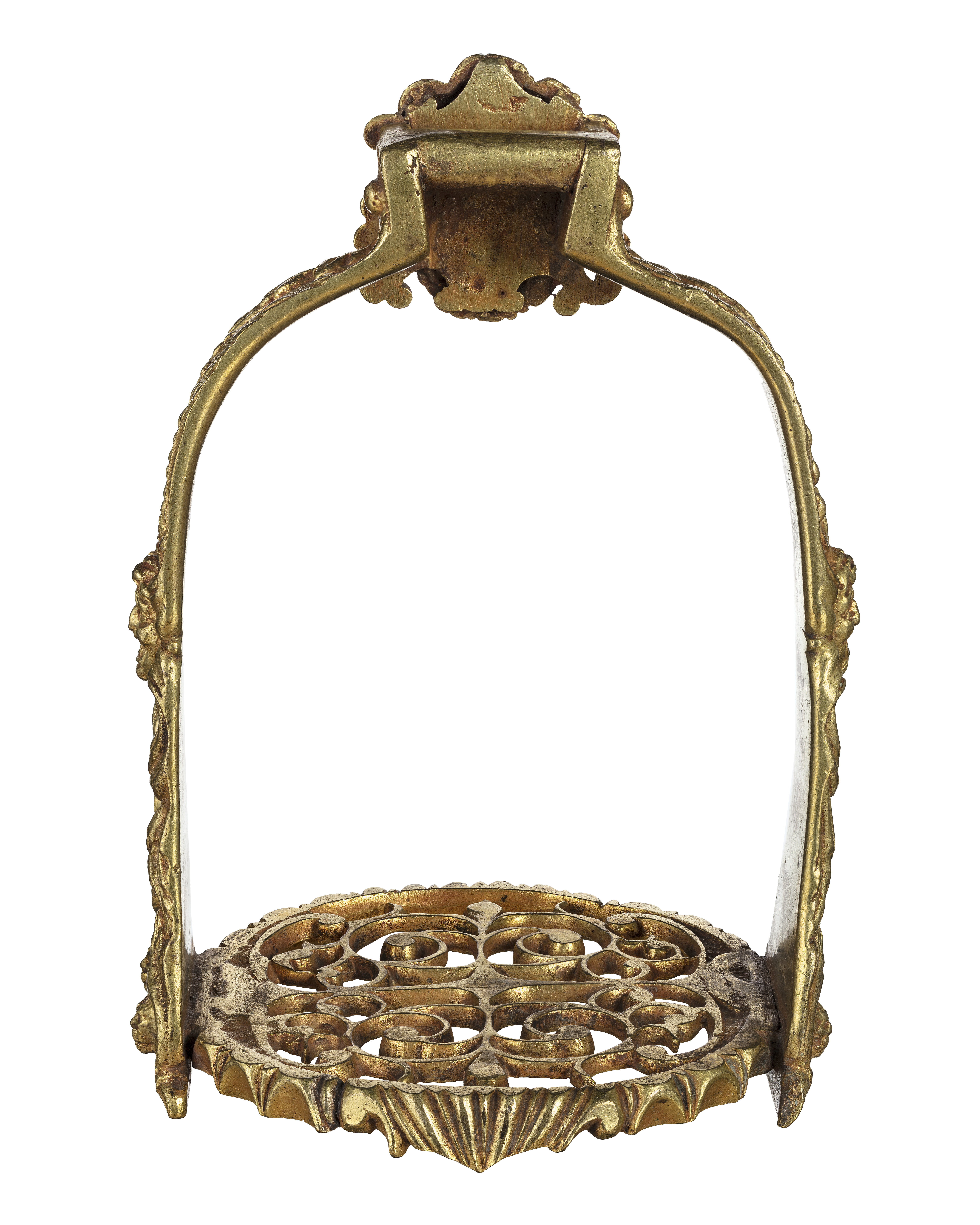 Ingående i franska gåvan 1673 till Karl XI. Stigbygel av förgylld mässing med u-formig bygel med rektangulär remsölja. Framför remläget en lejonmaskaron svagt kupig. Skänklarna breddade nedtill på båda sidor med lika dekor i form av lejonmaskaron samt bladornament. Nederkanten skjuter något nedanför trampstödet. Trampstöd i det närmaste runt med genombruten dekor. Trampstödets kant med skålformiga slipningar.
