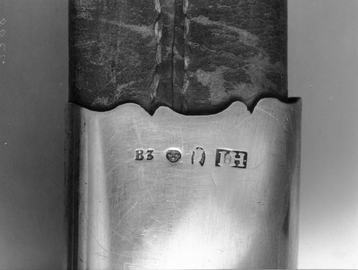 Balja överklädd med svärtat skinn. Munbleck, mellanbleck och doppsko av silver med konturerade katner och silverstämplar i form av "B.3" kontrollstämpeln och "I.H." (se sv. silversmide 1520-1850 nr 4351). Beslagen har parvis parallella graverade tvärgående linjer. På munbleck och mellanband finns koppelringar av silver. På doppskon släpsko av stål.