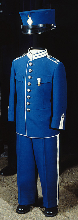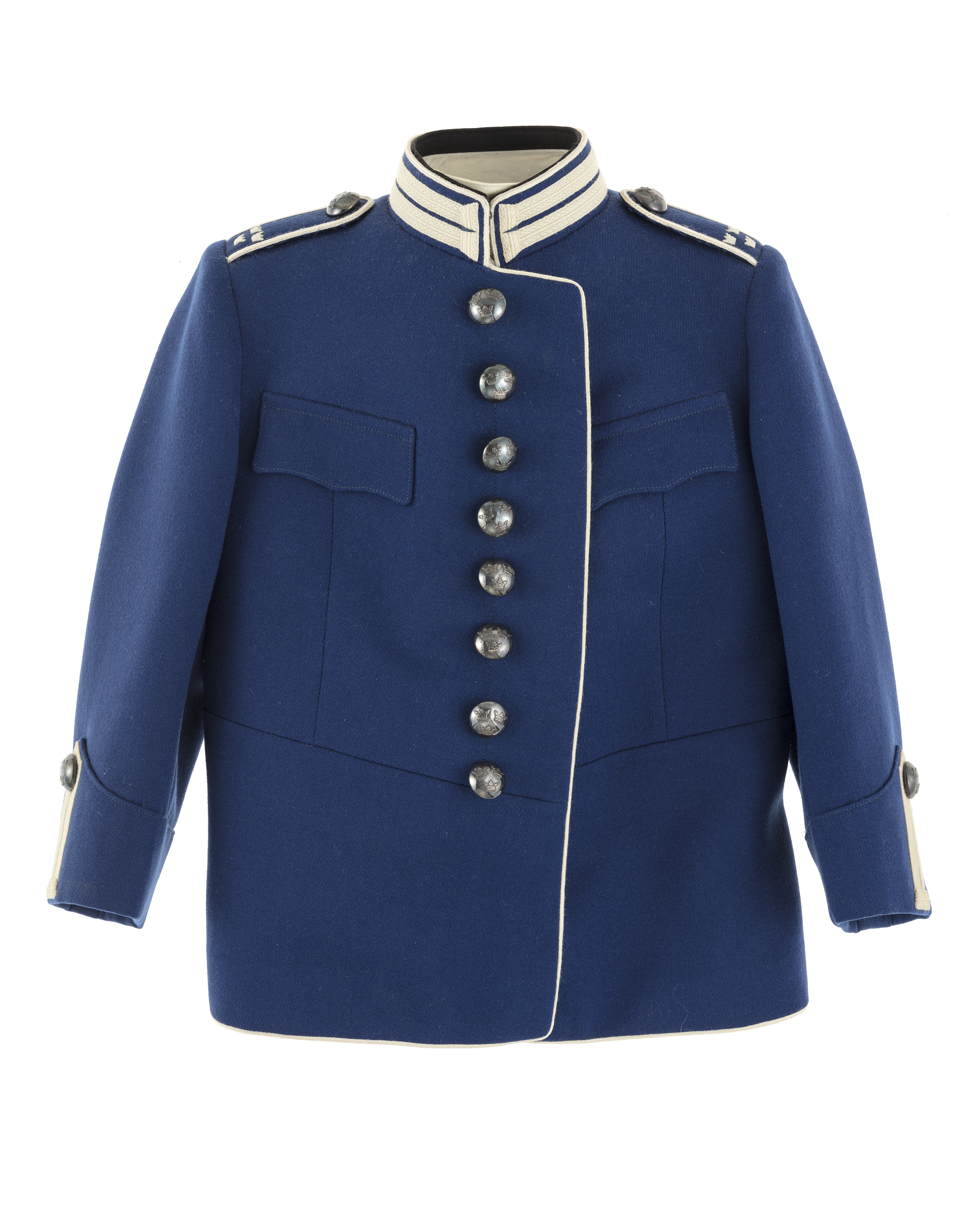 L fram: 450 mm, bak: 390 mm, ärml: 335 mm,, kragh: 30 mm, midja 630 mm Vapenrock av ljusblå diagonal tillskuren med livsöm kantad med vit passpoal. Ståndkrage, ärmuppslag axelklaffar. Enkelradig, åtta silverknappar med tre kronor, d: 19 mm, med firmamärke: "SPORRONG & CO, STOCKHOLM". Ärmuppslagen 85 mm breda med knapphål och knapp. Kragen med knapphål. Axelklaffarna med silverknapp, vit passpoal samt tre små kronor av kläde. Skört ihopsytt med fyra knappar. Foder av vitt siden med en innerficka med firmamärke LINDAHL KUNGL. HOVSKRÄDDARE Dec. STOCKHOLM 1949. H.K.H. Prins Carl-Gustaf.