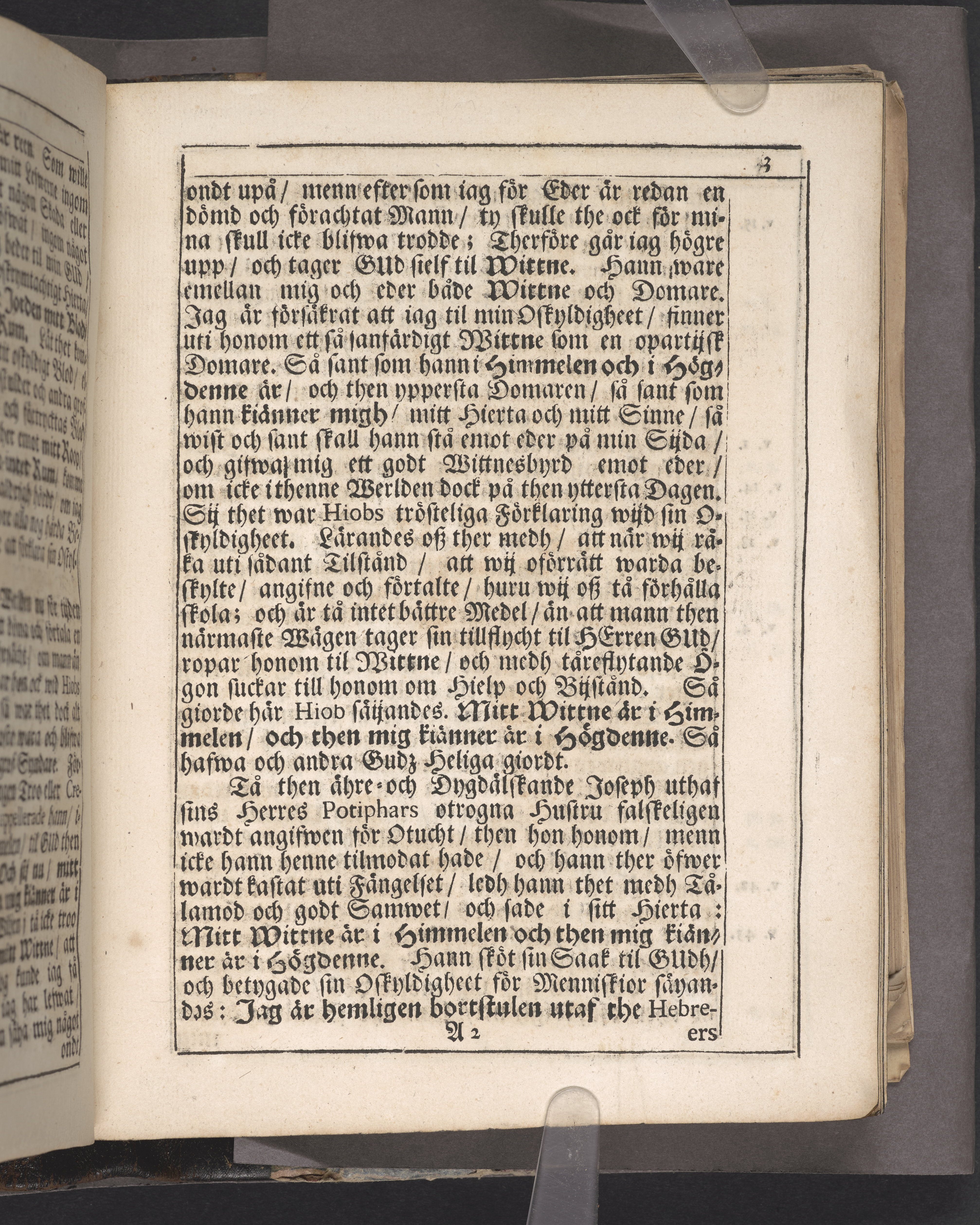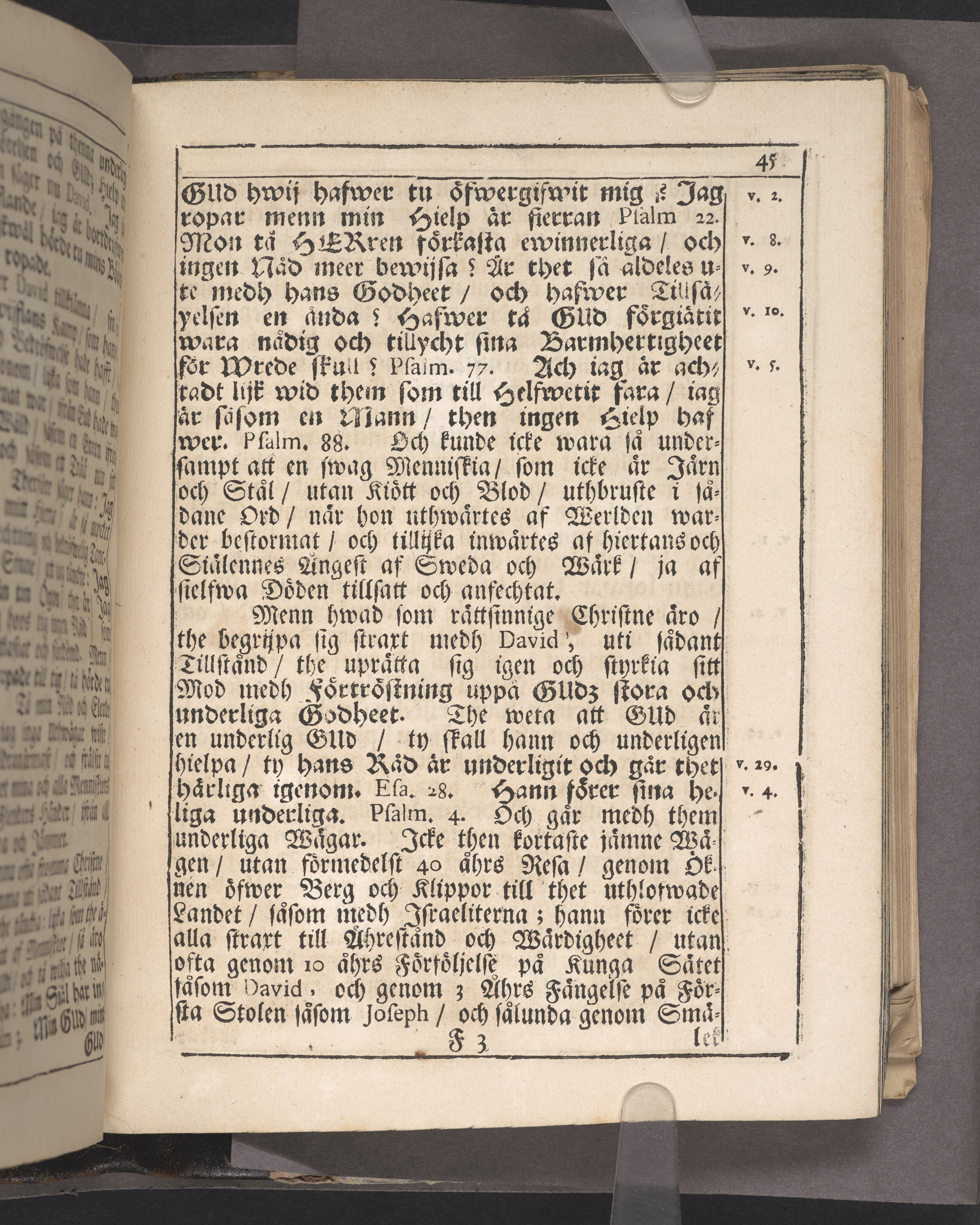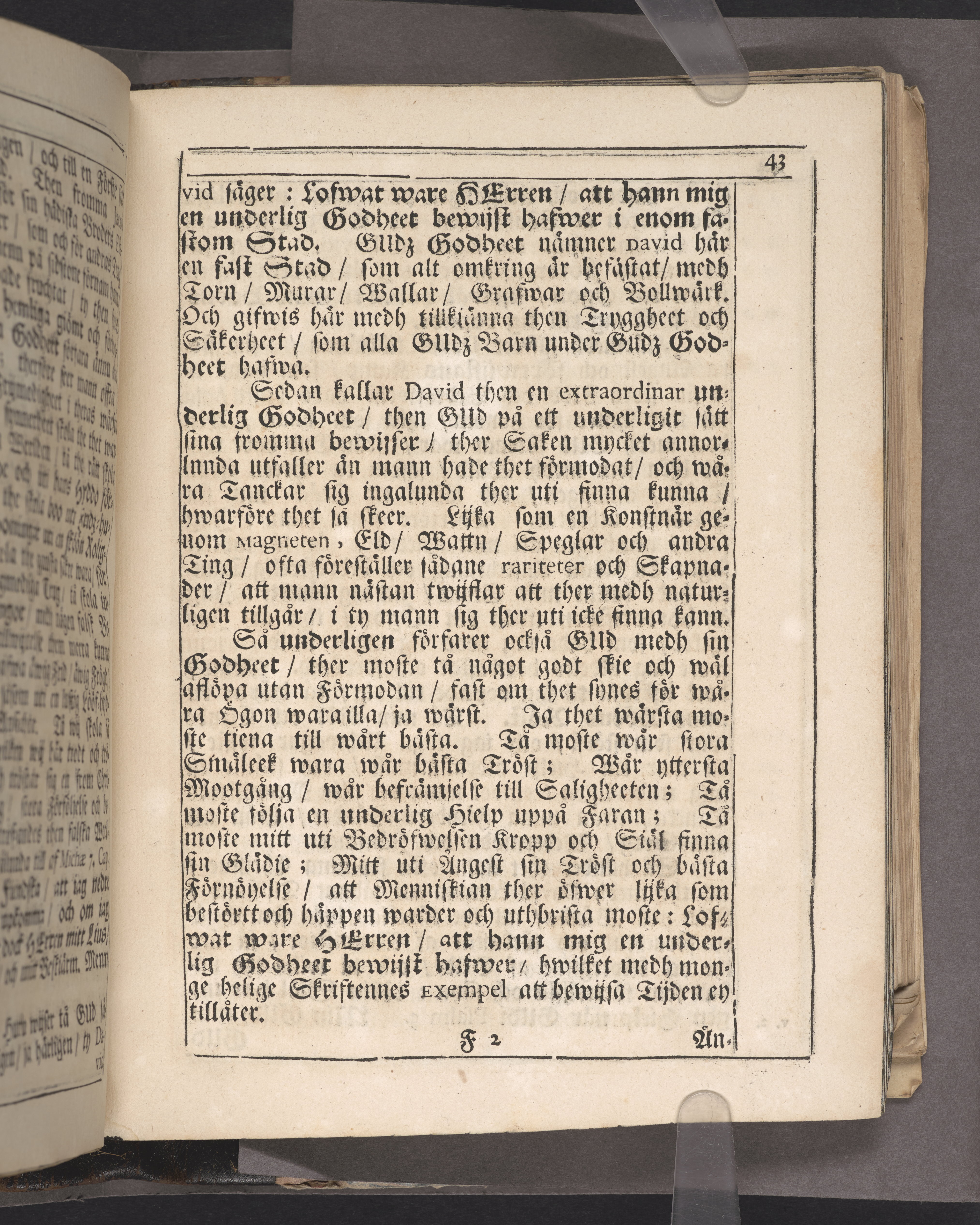 Del av band m. pärmar av marmorerat papper, rygg och hörn av getskinn. Pärmfyllnad: papp.
