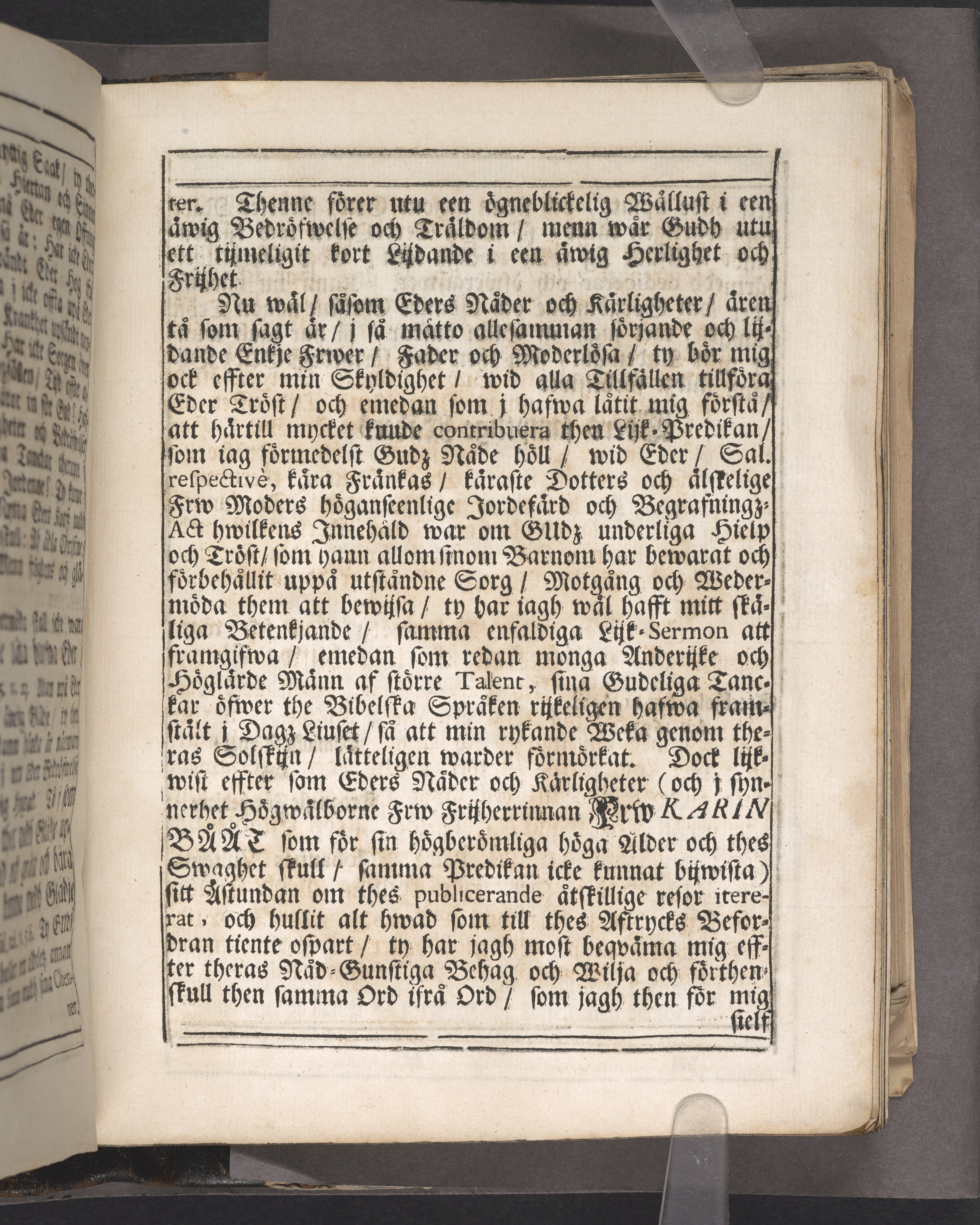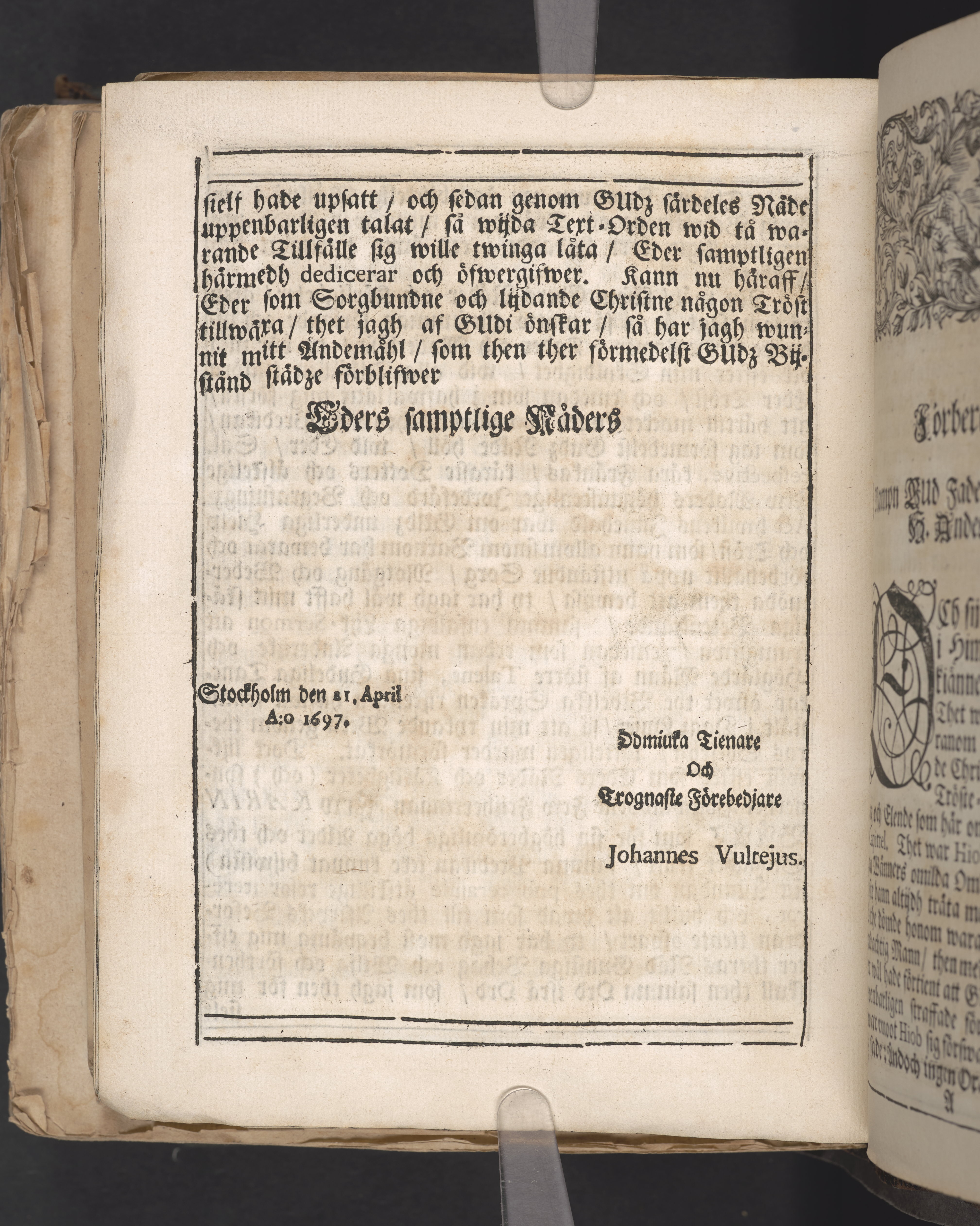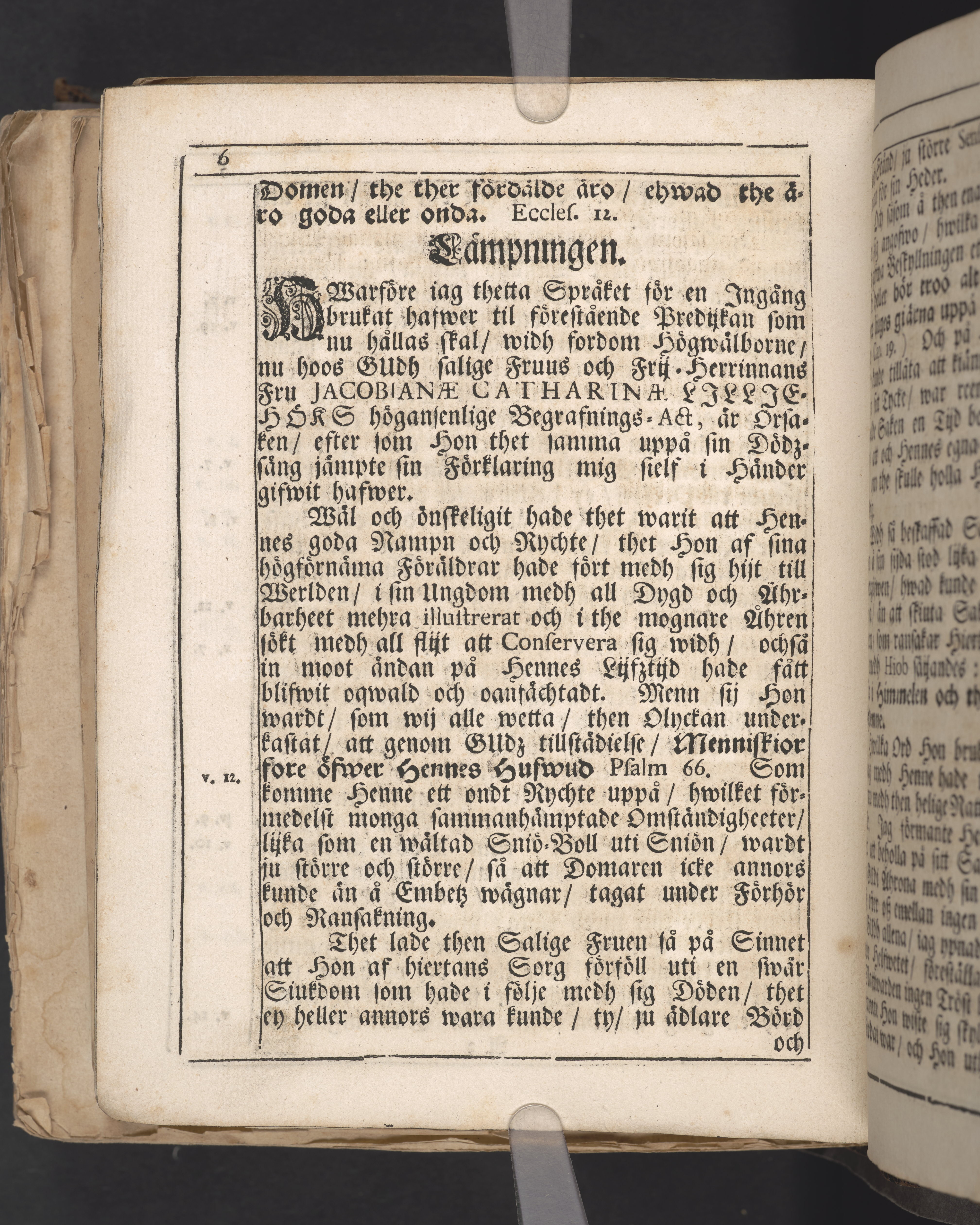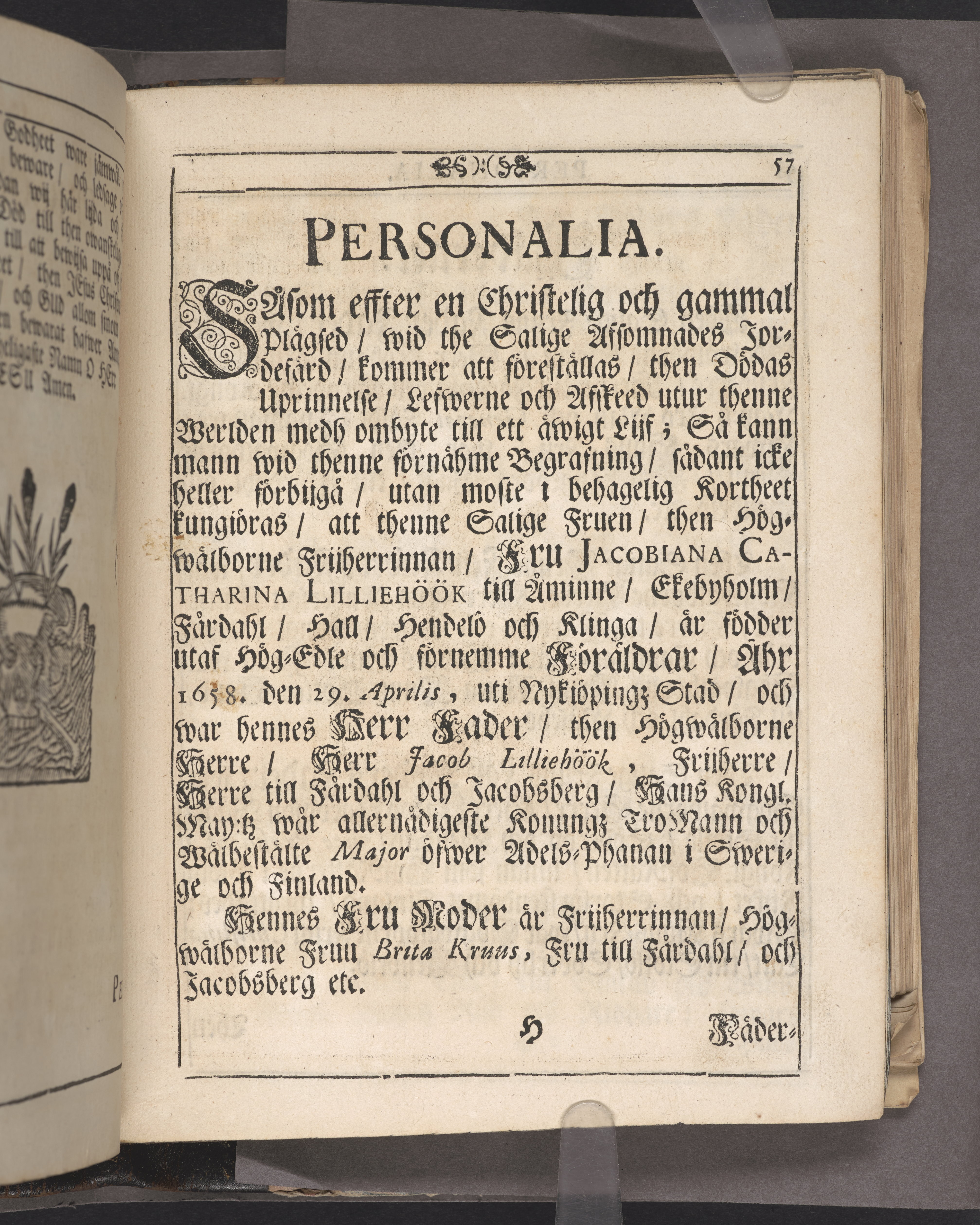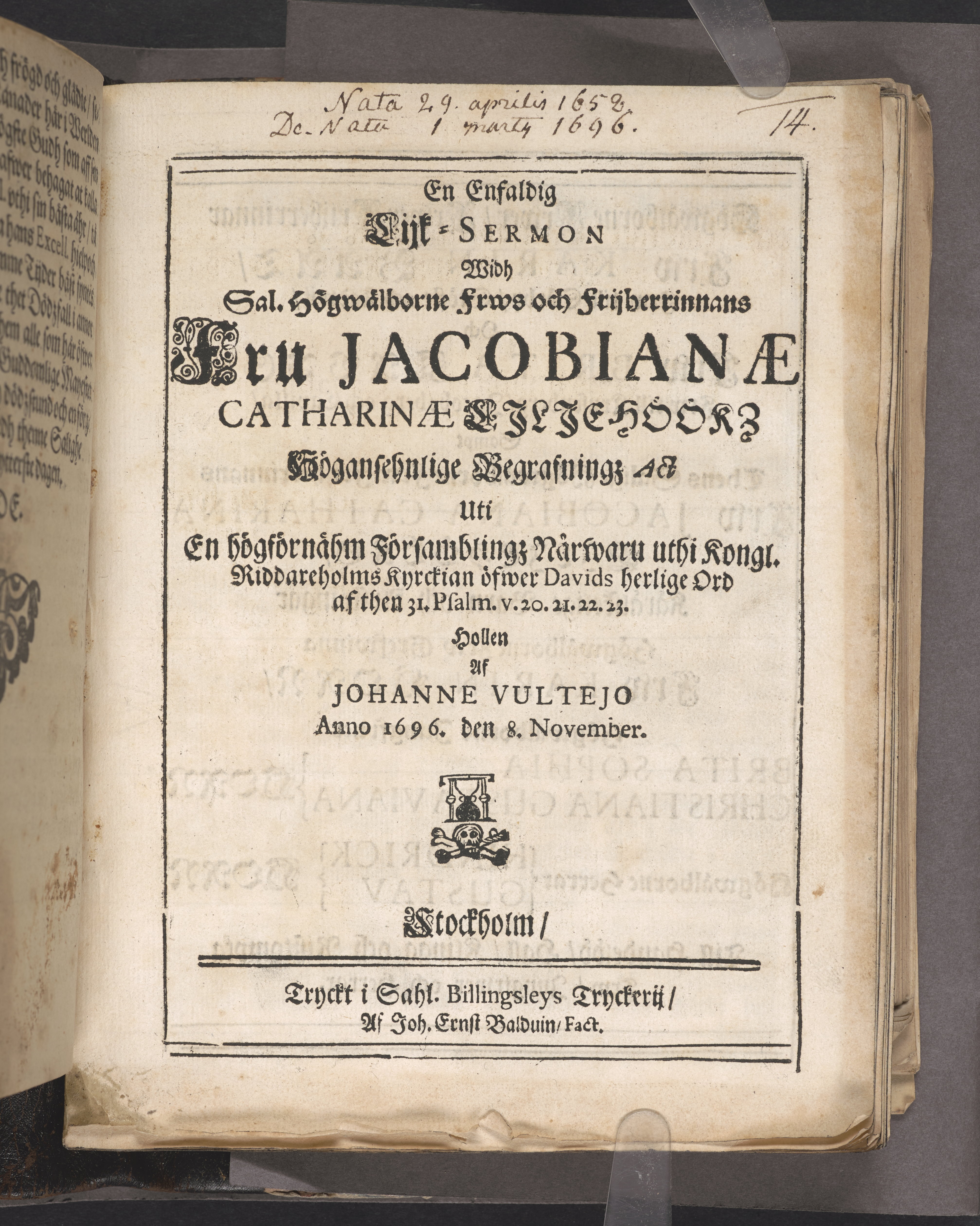 En enfaldig lijk-sermon widh sal. högwälborne frws och frijherrinnans Fru Jacobianæ Catharinæ Liliehöökz högansehnlige begrafningz act ... uthi kongl. Riddareholms kyrckian ... hollen af Johanne Vultejo anno 1696. den 8. november. Stockholm, tryckt i sahl. Billingsleys tryckerij, af Joh. Ernst Balduin, fact.