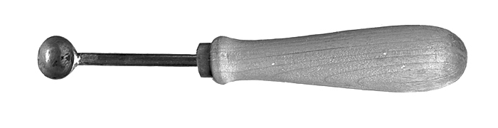 LEGYMJÄRN Av förtent järn med träskaft. Med nästan halvsfärisk skopa, i vars botten ett runt hål, samt lång rundstavig skaftstånge, på vars ytterända skaftet är fäst. Skaft av lönn, svarvat, med rundad ytterände och avsmalnande inåt, inre änden med en vulst samt avslutad i en kort rund tapp, skodd med en mässingsring. Längd: 16,1 cm. Skopa, diameter: 1,6 cm. Skaft, längd: 10,1 cm.