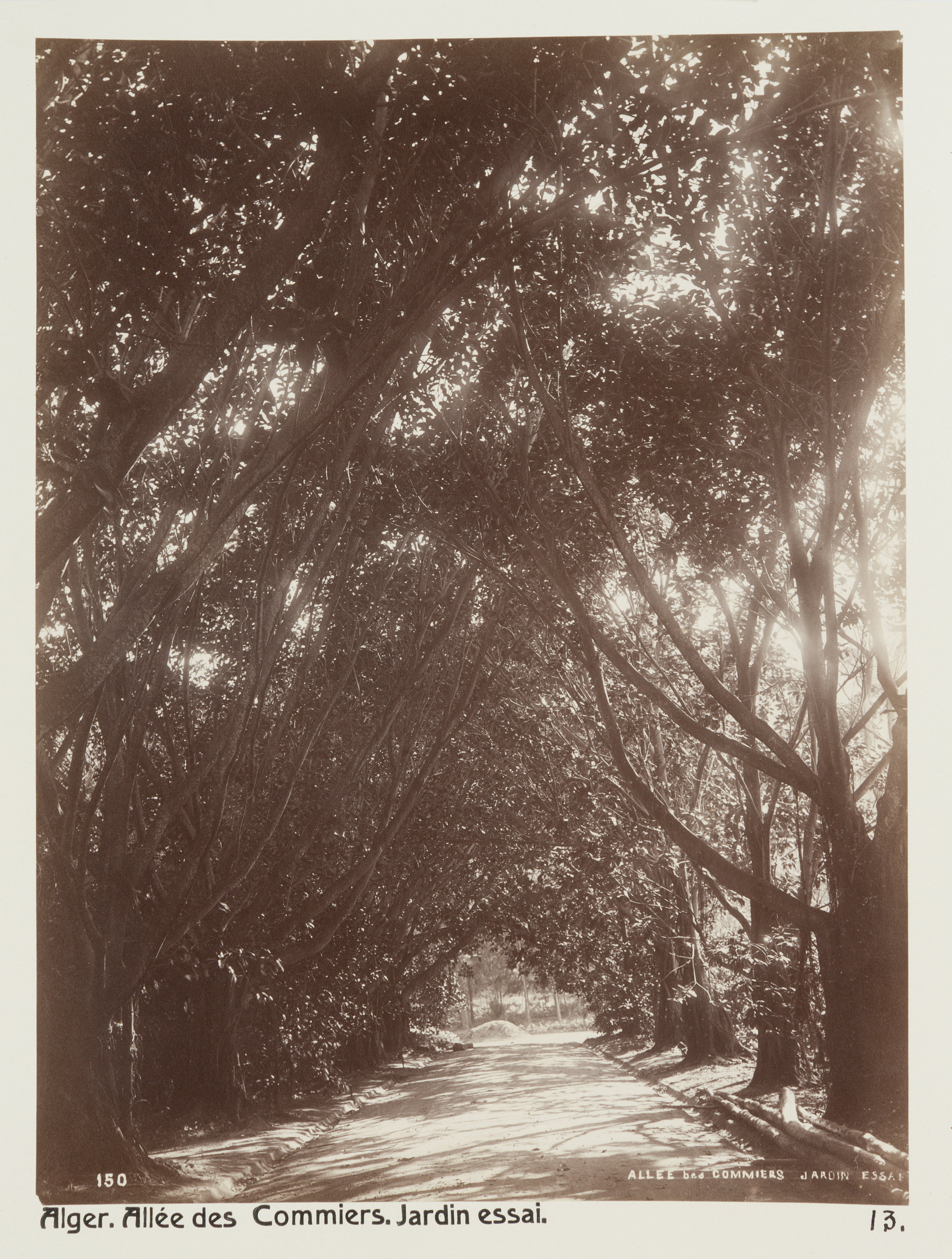Alger, Algeriet. Fikusallé. Jardin d'Essai. Dubblett till LXVI:F.14. Bilderna med inventarienummer LXVI:K.H.01.-137. är inköpta av Johanna Kempe, f. Wallis, i Alger, Biskra, Tunis, Constantine, Oran och Blidah vid hennes vistelse i nämnda städer tillsammans med sin dotter och svärson, Wilhelmina och Walther von Hallwyl, dotterdottern Irma samt fröknarna Caroline Pflaum och Ida Uhse under deras resa genom Algeriet och Tunisien samt åter över Schweiz 11 februari - 19 maj 1889. Förestående uppgifter lämnade med ledning av fröken Ida Uhses Reseanteckningar. Vissa av bilderna är dubbletter till bilder i inventarienummerserien LXVI:F.01.-138. som köptes in av Wilhelmina von Hallwyl under samma resa.