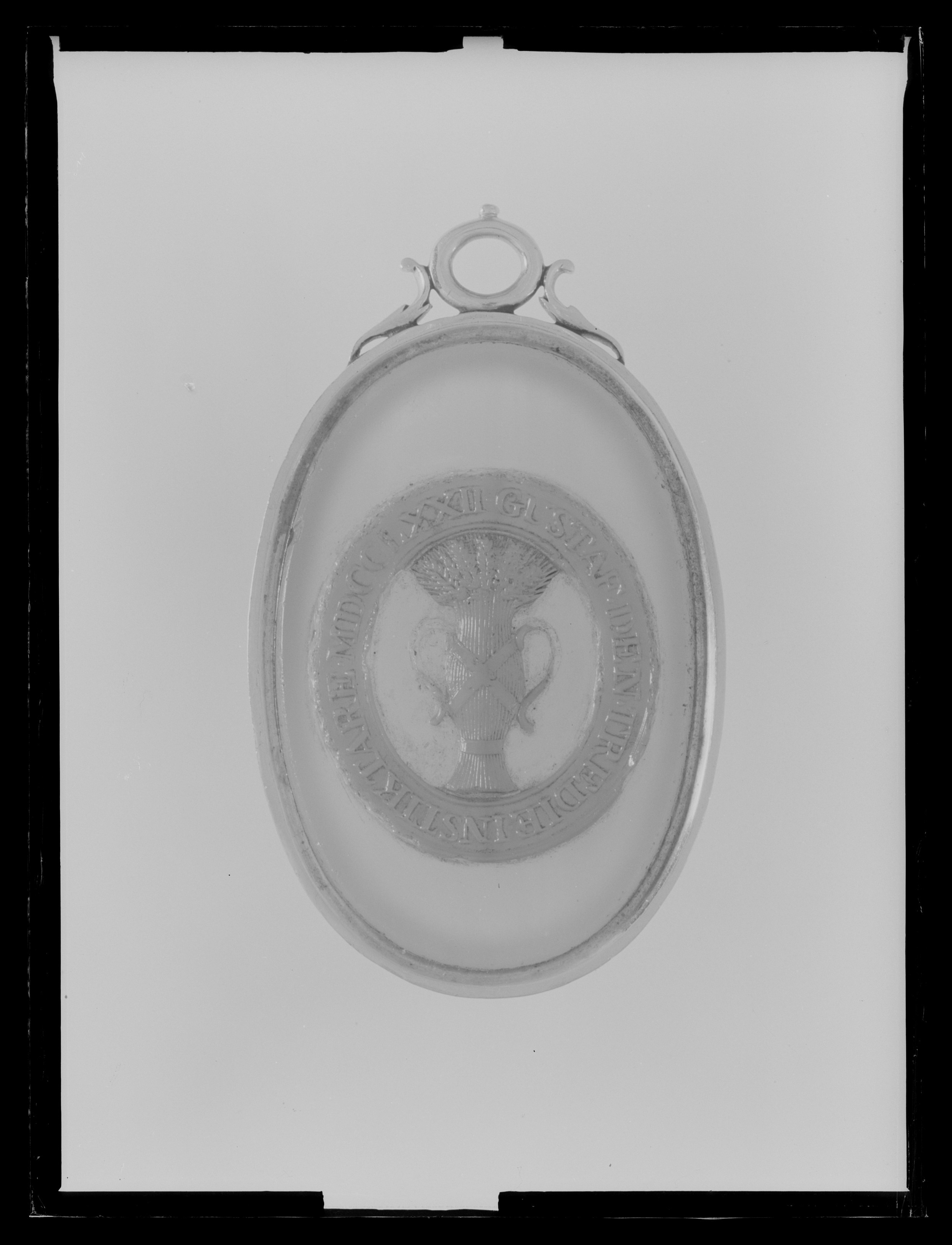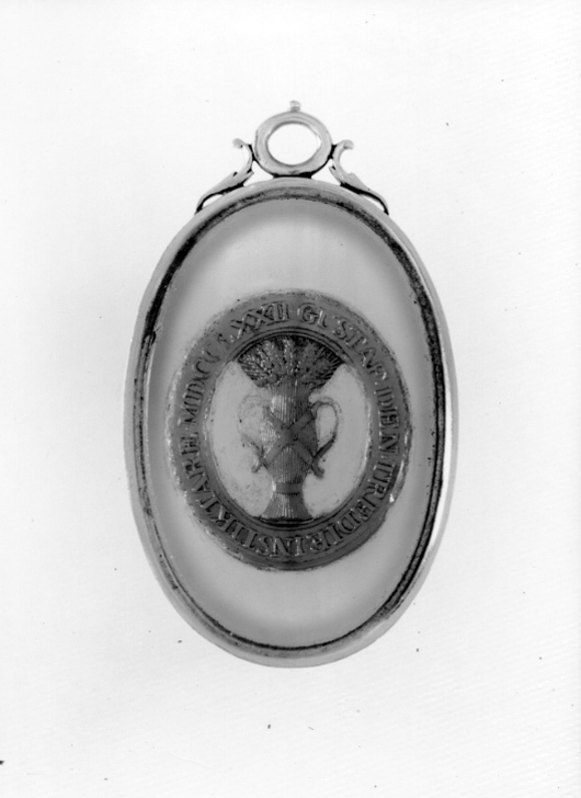 Oval medaljong av grå bandagat, på översidan utsparat rödbrunt lager i form av vase, omgiven av runt textband med text i relief: "GUSTAF.DEN.TREDIE.INSTIKTARE.MDCCLXXII". Guldfattning à jour, upptill en oval guldring flankerad av bladornament. Ram av guld.