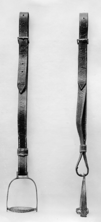 Stigbygel av förtent stål, u-formad bygel med fast rektangulärt remläge. Skänklarna nedtill på utsidan med V-formade infilningar. Ögleformat trampstöd med på utsidorna infilade hack. Tillbehör: Stigläder av grönt skinn ca 890 mm långt, 30 mm brett med sölja av stål.