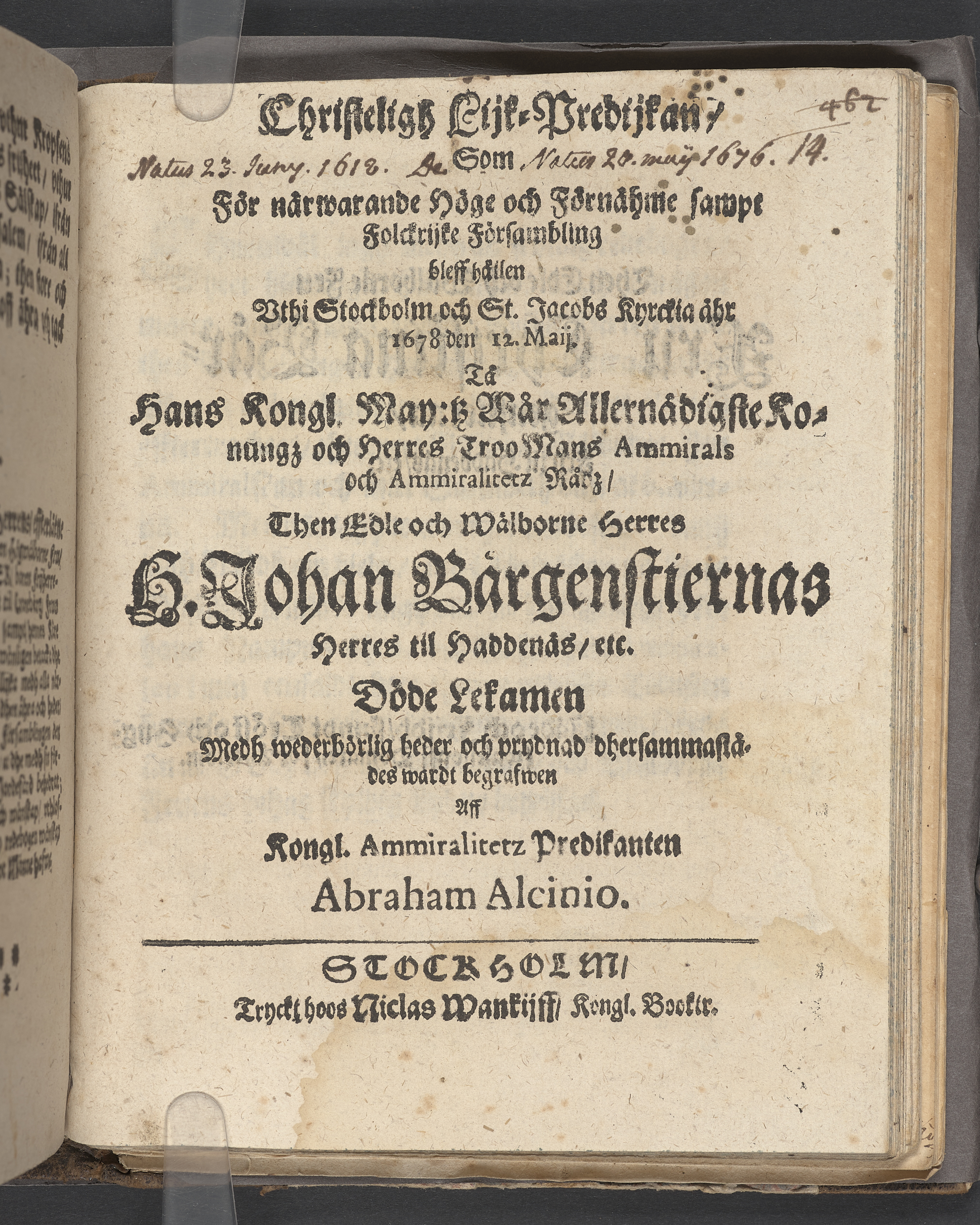 Christeligh lijk-predijkan, som för närwarande höge och förnähme sampt folckrijke försambling bleff hållen vthi Stockholm och St. Jacobs kyrckia åhr 1678 den 12. maij. tå ... H. Johan Bärgenstiernas herres til Haddenäs, etc. döde lekamen ... wardt begrafwen aff kongl. ammiralitetz predikanten Abraham Alcinio. Stockholm, tryckt hoos Niclas Wankijff, kongl. booktr.