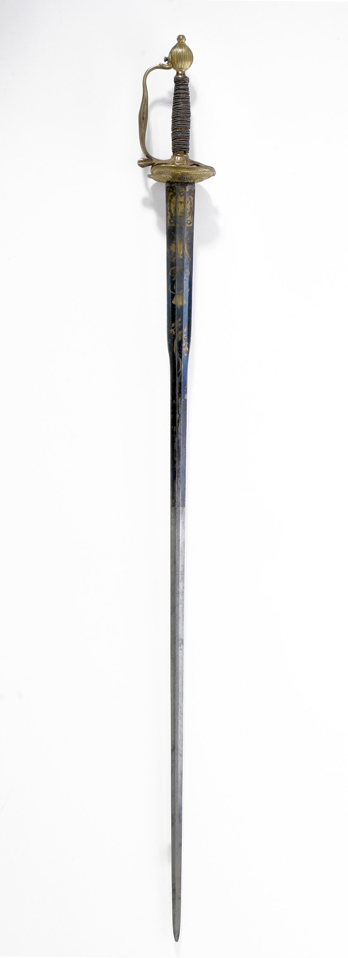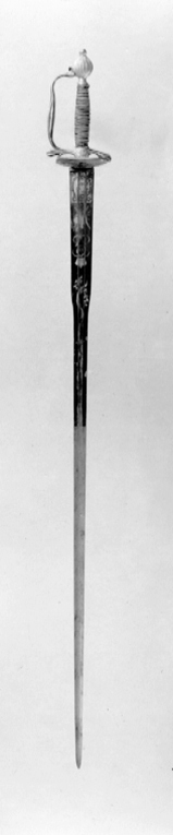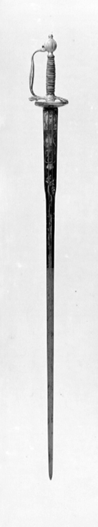 Fäste av förgylld mässing, efterkarolinsk typ. Längs kanten av parerplåtarnas utsida graverat i skrivstil: " Giftvit af Konungen till Öf.ste Lieutn. och Rid. af Donner för visad Manndom mot Rikets Fiender 1790 under kriget mot Ryssland ". På parerplåtarnas utsidor dessutom två emaljerade, ovala, krönta kopparplåtar med spegelmonogram G (Gustav III). Kavel lindad med tvinnad silvertråd, upptill flätad krans av silvertråd. Klinga rak, tvåeggad med sexsidig slipning s k colichemarde-klinga. Starka delen etsad och förgylld med dekor mot blånerad bakgrund. Vid basen en lagerkrans runt tre kronor, en trofégrupp, Gustav III:s krönta namnchiffer samt två bladrankor. På klingbasen inslaget: E F S (?, Eskilstuna fristad).