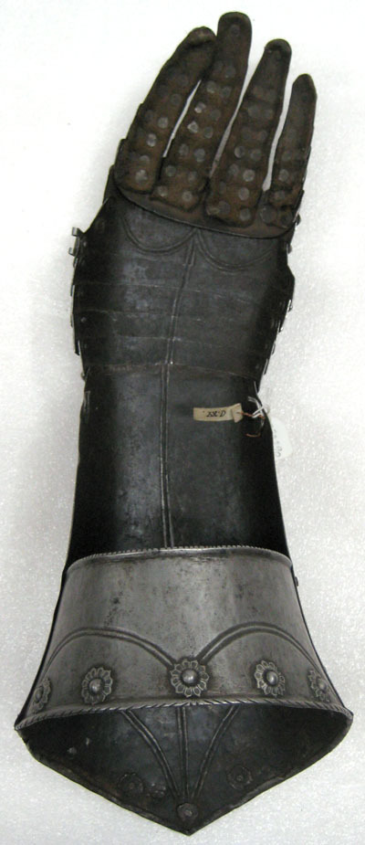 Av stålplåt. Utsidan slipad metallren med mörka partier och insidan svartbrun med slagmärken. Sammanlagt 29 delar. Lång krage av två delar, den inre betydligt mindre och enkelt nitad till den större i sidorna. Kanten invikt med repstavsfilning, nitar med blomformiga brickor runtom. Upptill vid spetsen märkning i form av nio punsade gropar. Hand av fem skenor samt en sjätte formad efter knogarna, över skarven en smalare skena med högt uppdriven och repstavsfilad ås. Dekorativ försänkt dubbellinje på kragens sidor och längsmed hanskens mitt fram till den åsade skenan. Tumskydd av en plåt och mindre lameller. Fäst i handsken med gångjärn. Fingerskydd i form av lameller nitade omlott på läderband. Dubbellinje över lamellerna, på den yttersta en nit med blomformig bricka.