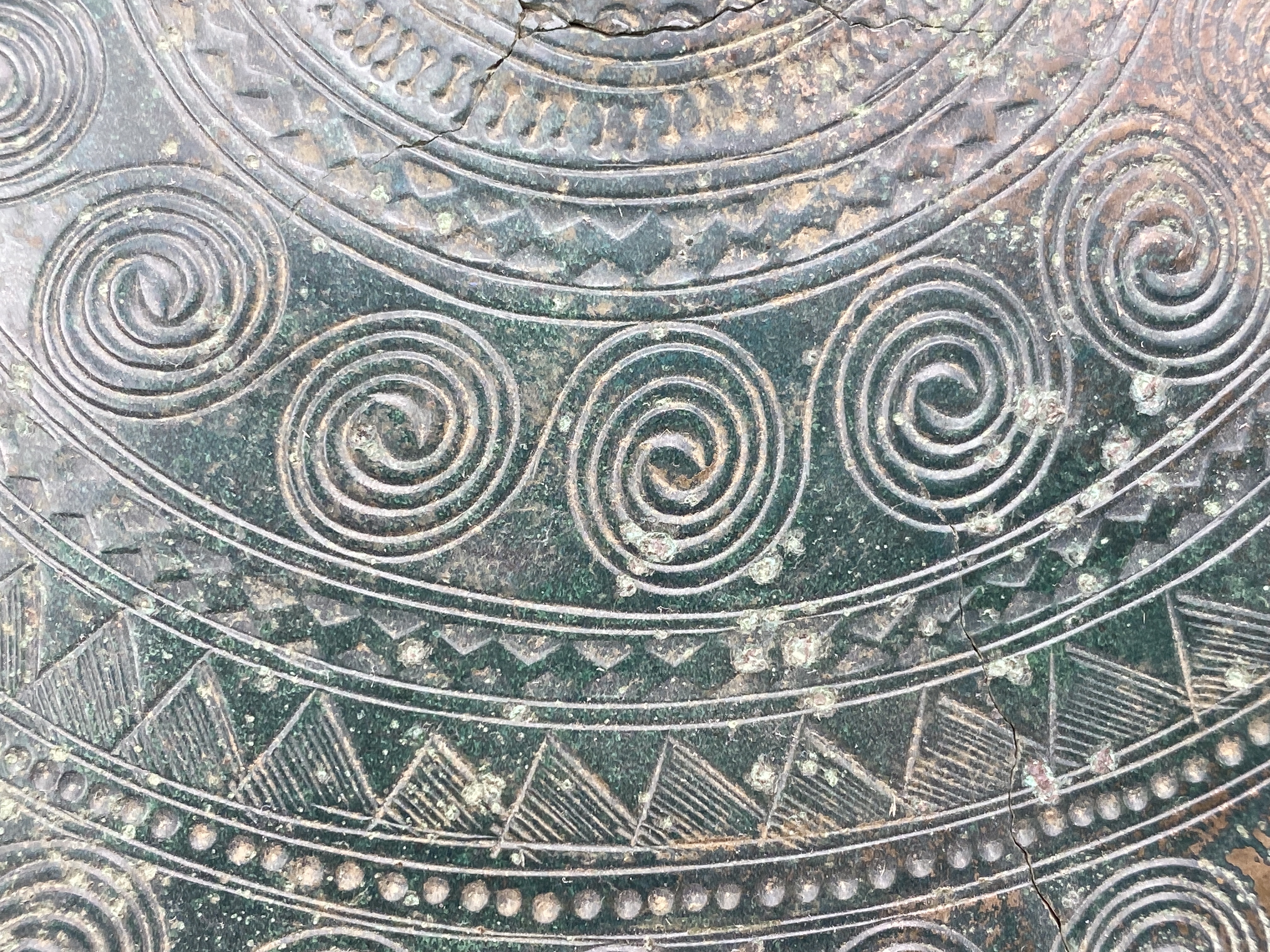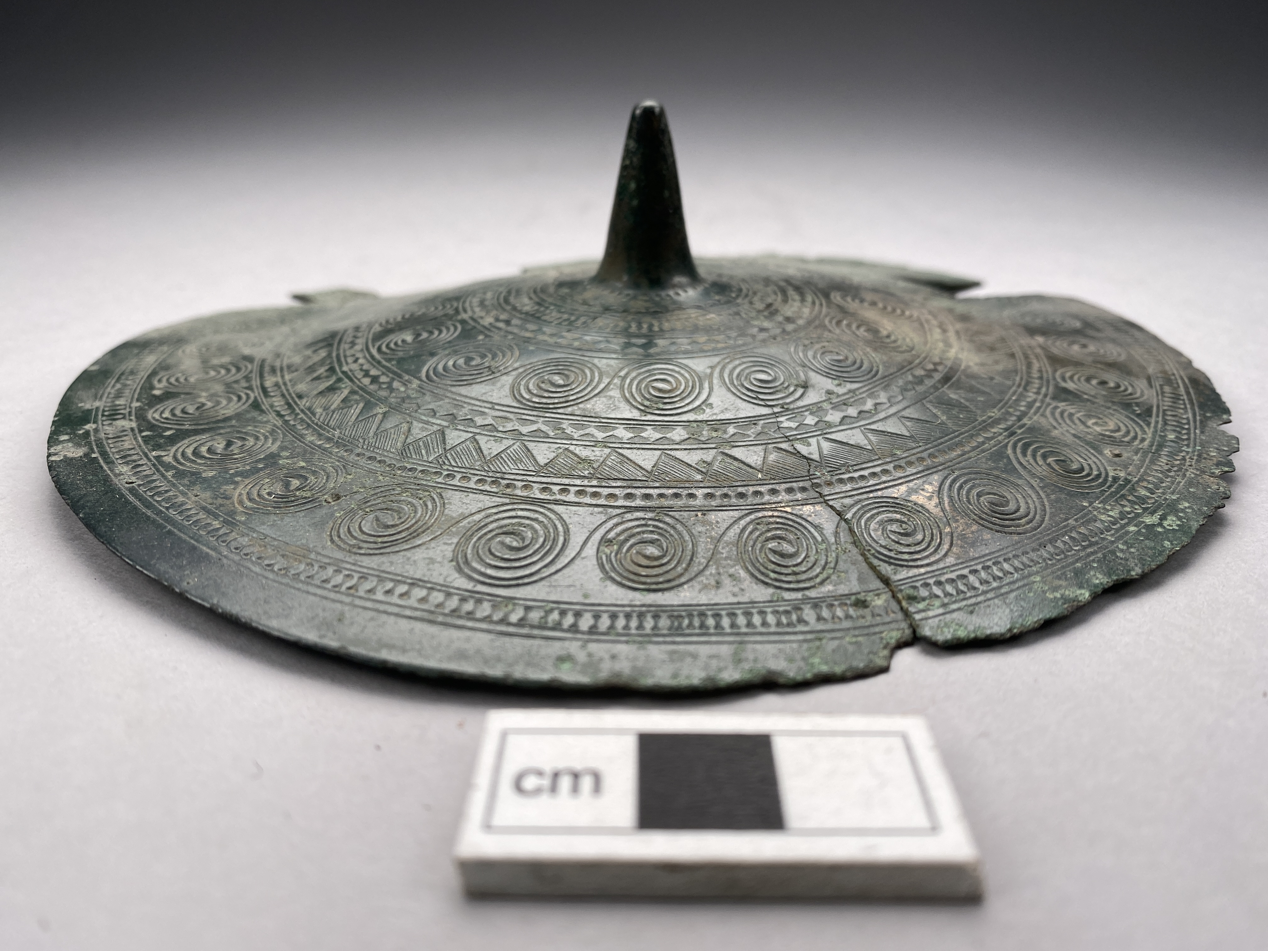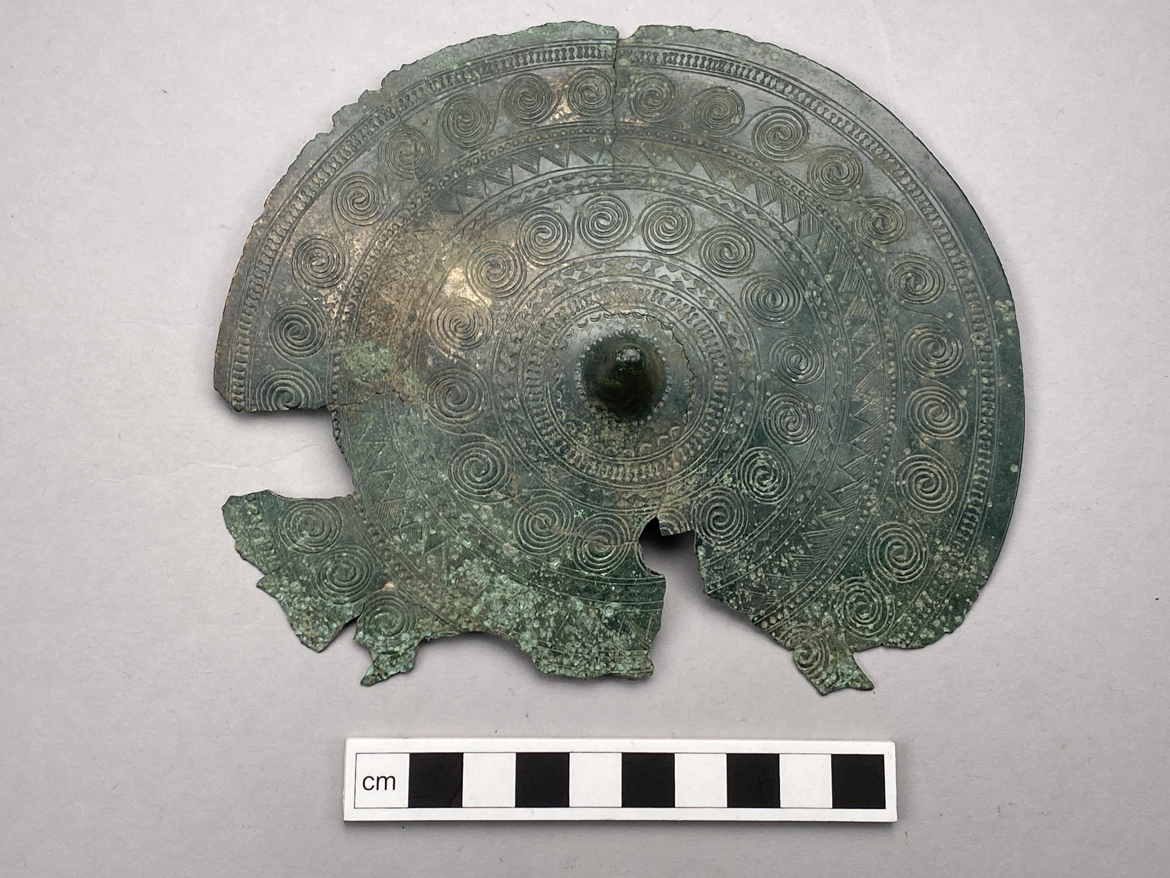 Mindre bälteplatta av brons med mittspets. Bruten i ett tiotal stycken, därav en större bit, som utgör något mer än hälften av plattan. Ornerad. På baksidan odekorerade med en fästeanordning i form av ett valv