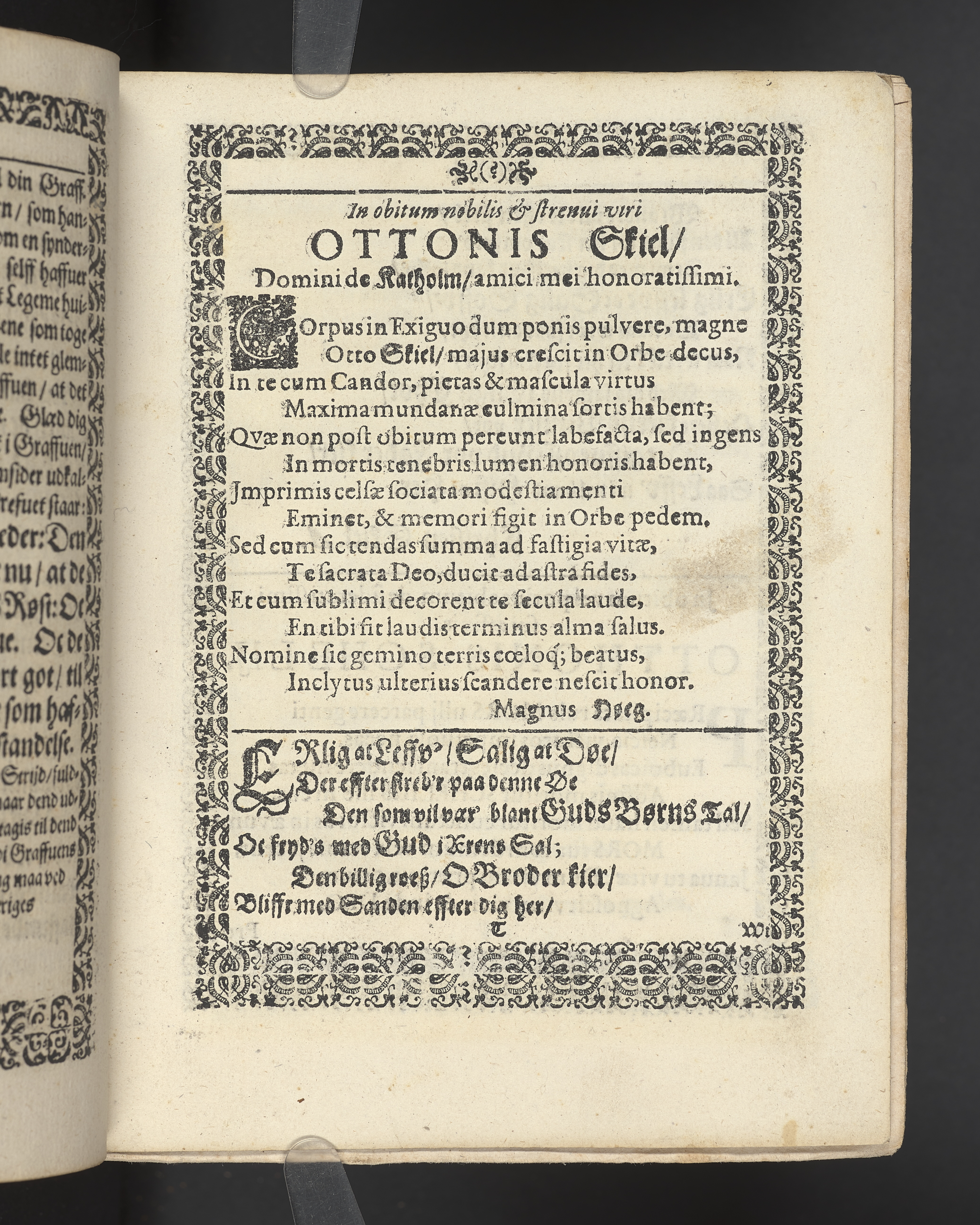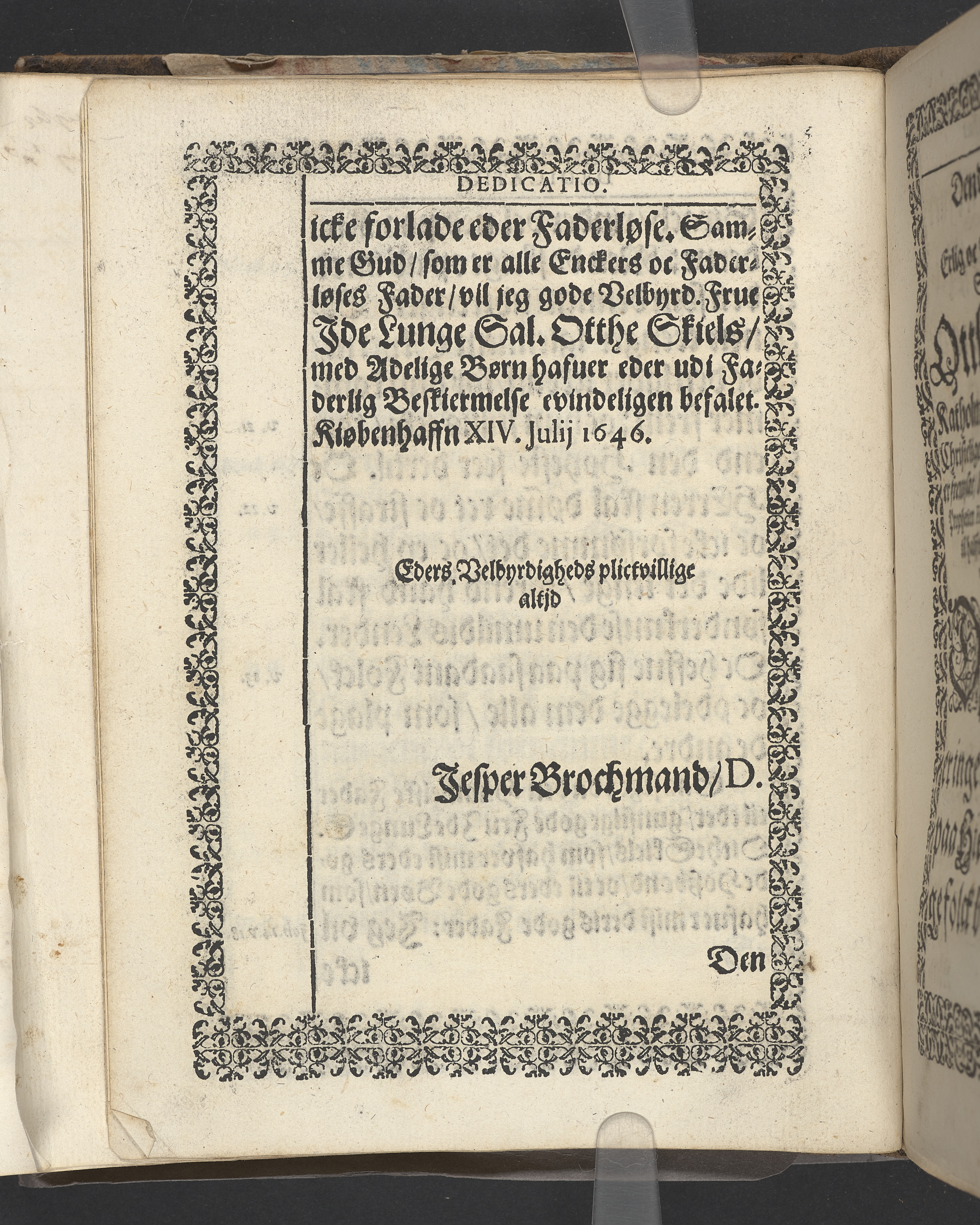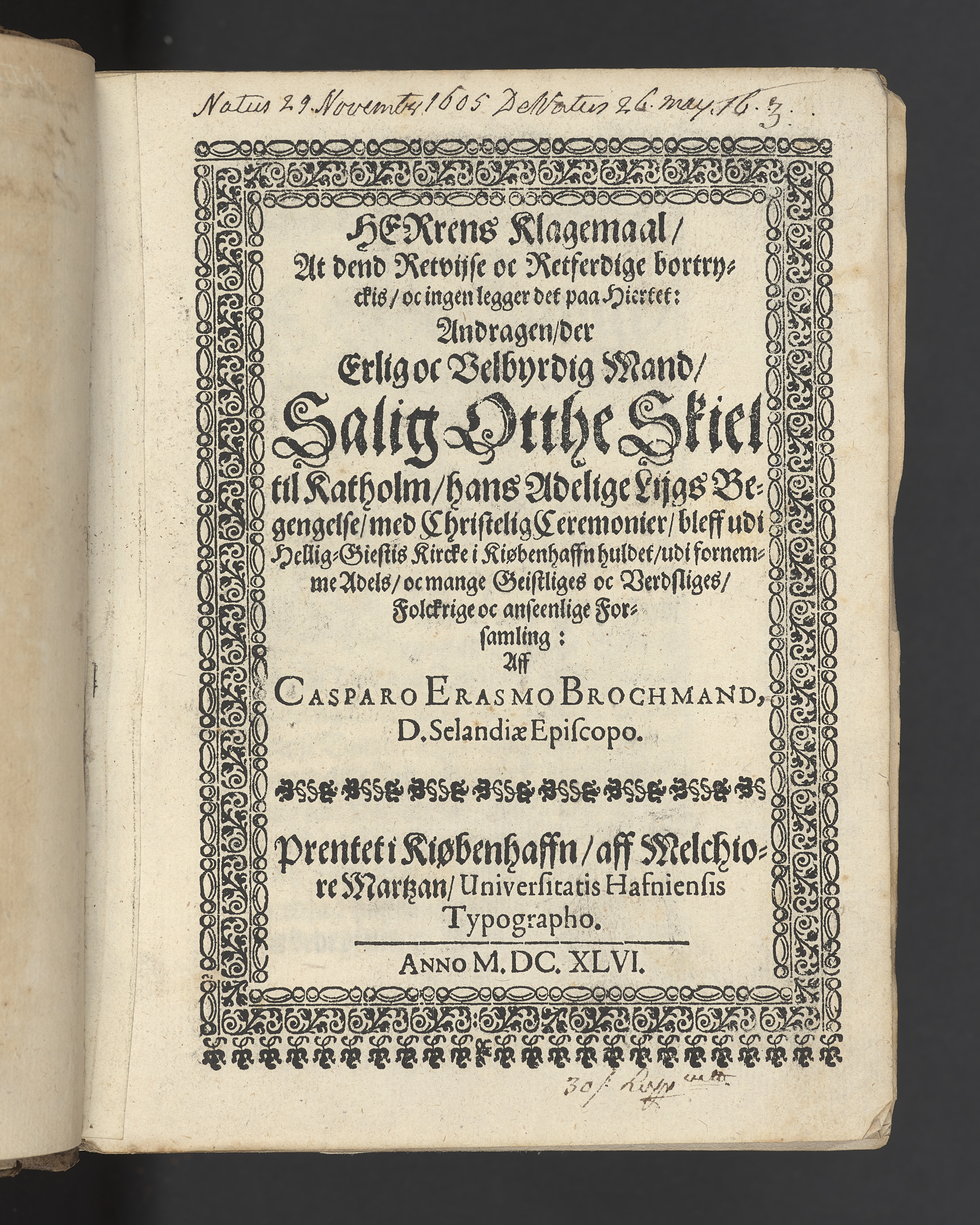 Herrens Klagemaal ... andragen, der erlig oc velbyrdig Mand, salig Otthe Skiel til Katholm, hans adelige Lijgs Begengelse, med christelig ceremonier, bleff udi Hellig-Giestis kircke i Kiøbenhaffn huldet ... Aff Casparo Erasmo Brochmand ... Prentet i Kiøbenhaffn, aff Melchiore Martzan ... MDCXLVI.