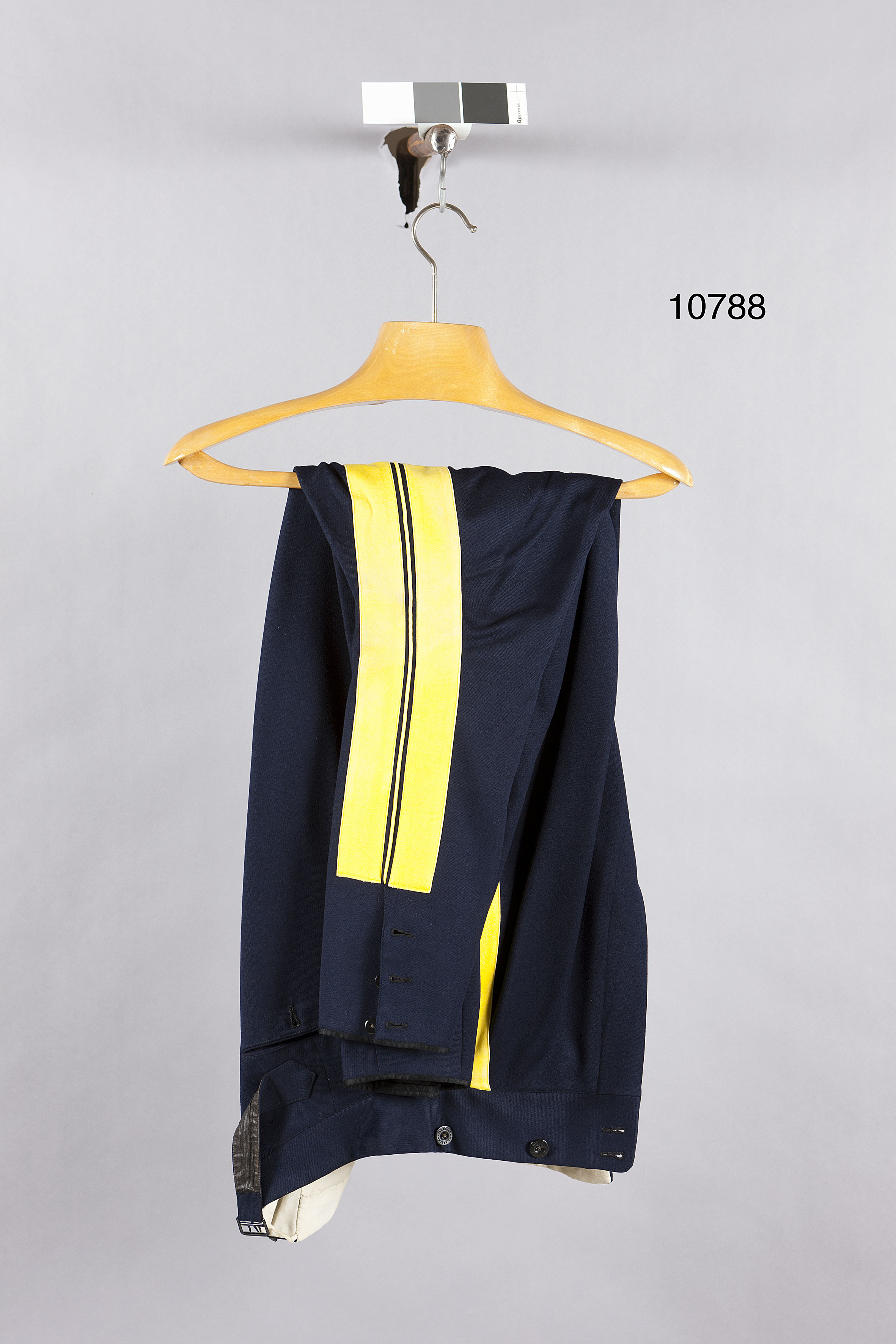 Ridbyxor av mörkblå diagonal knäppt med gylf med sex knappar, d: 15 mm, varav fem med firmamärke:"M. L. ANKER STOCKHOLM". En knapp märkt med gul text: "MILITÄRBOLAGET". På linningen åtta knappar d:17 mm, lika som de övriga. Baktill i mittsömmen ett infällt stycke av svart siden.Spänntampar med svartlackerad sölja med text: "C.J & Co". Två bakfickor vardera knäppt med en svartknapp. Fickor i sidsömmen. Utmed dessa dubbla 40 mm breda galoner av gult kläde mellan dessa passpoal. Galonerna slutar 135 mm nedifrån, sprund knäppt med tre släta knappar, d: 14 mm. Nederst smal svart sidenkant. På ett ca 240 mm långt parti på insidan av byxbenen foder av diagonal med parallella stickningar vinkelformigt ställda mot sömmen. Foder upptill av vitt kyprat ylle. Bak rektangulär etikett av bomull med firmanamn i mörkblå skrivstil: "M.L. Anker STOCKHOLM." Där tillskrivet med bläck: H.K.H Prins Carl, 19.12.1914. No 49".