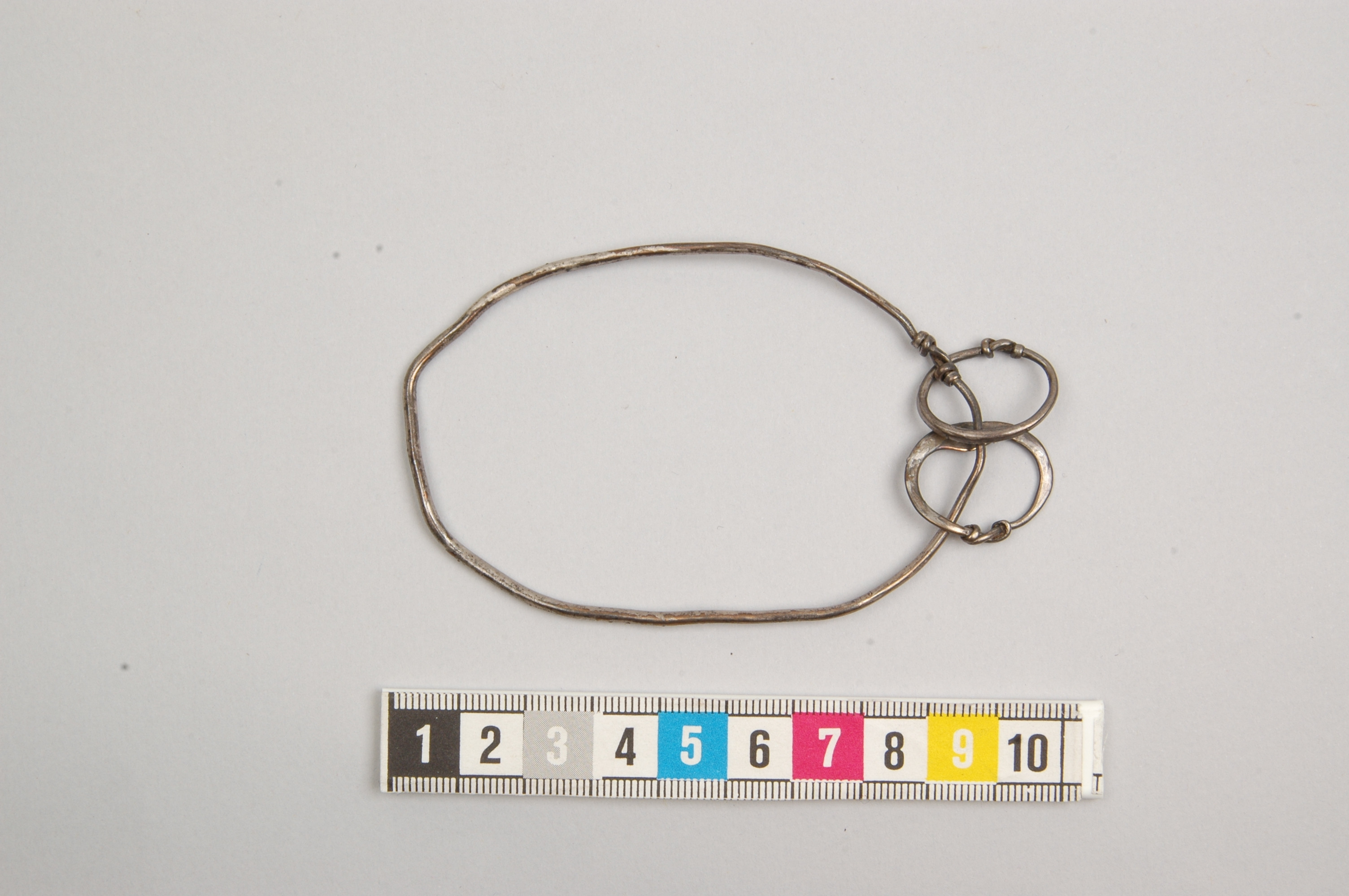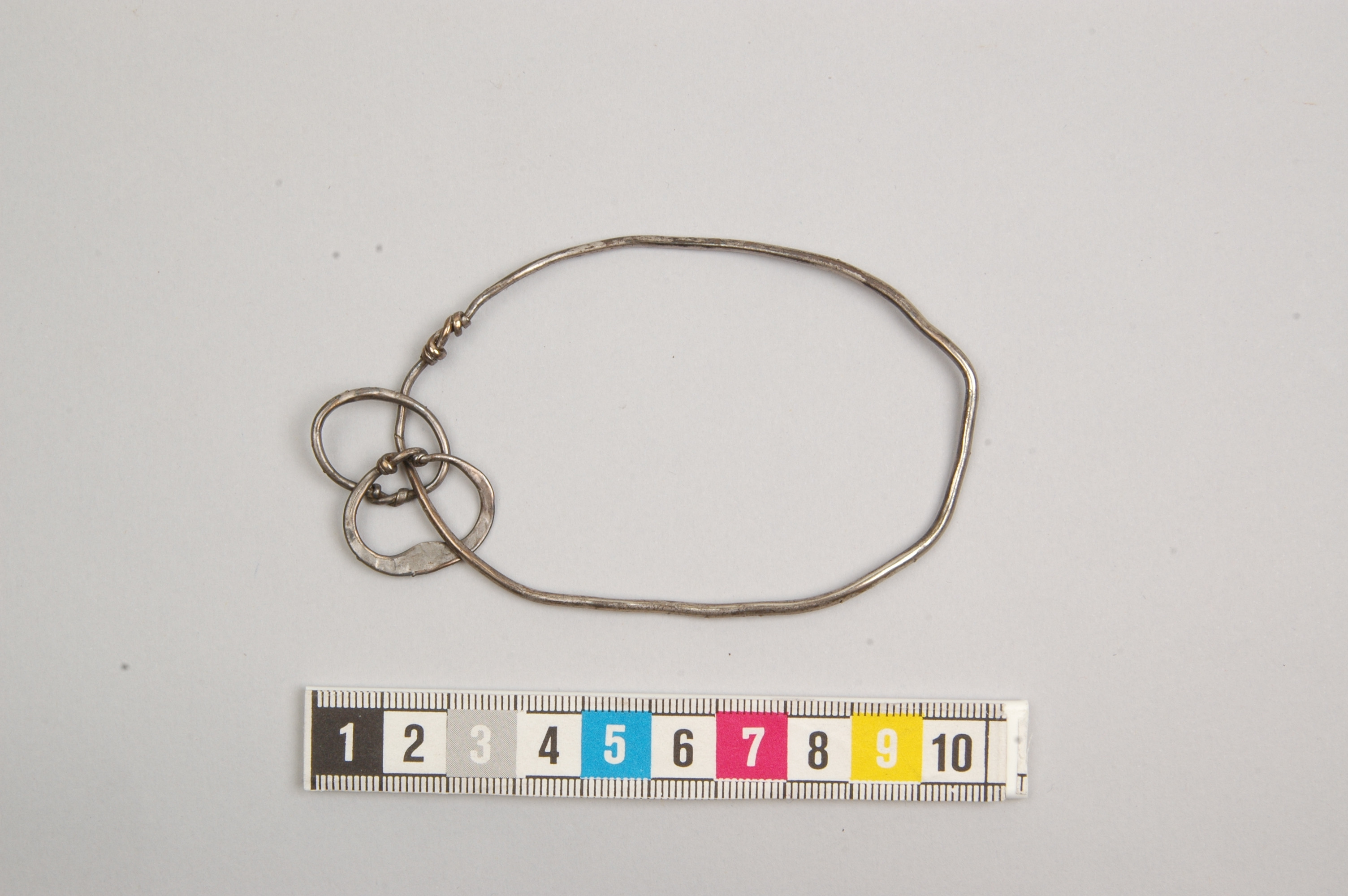 Armring men 2 vidhängande hängen i form av miniatyreldstål och ring