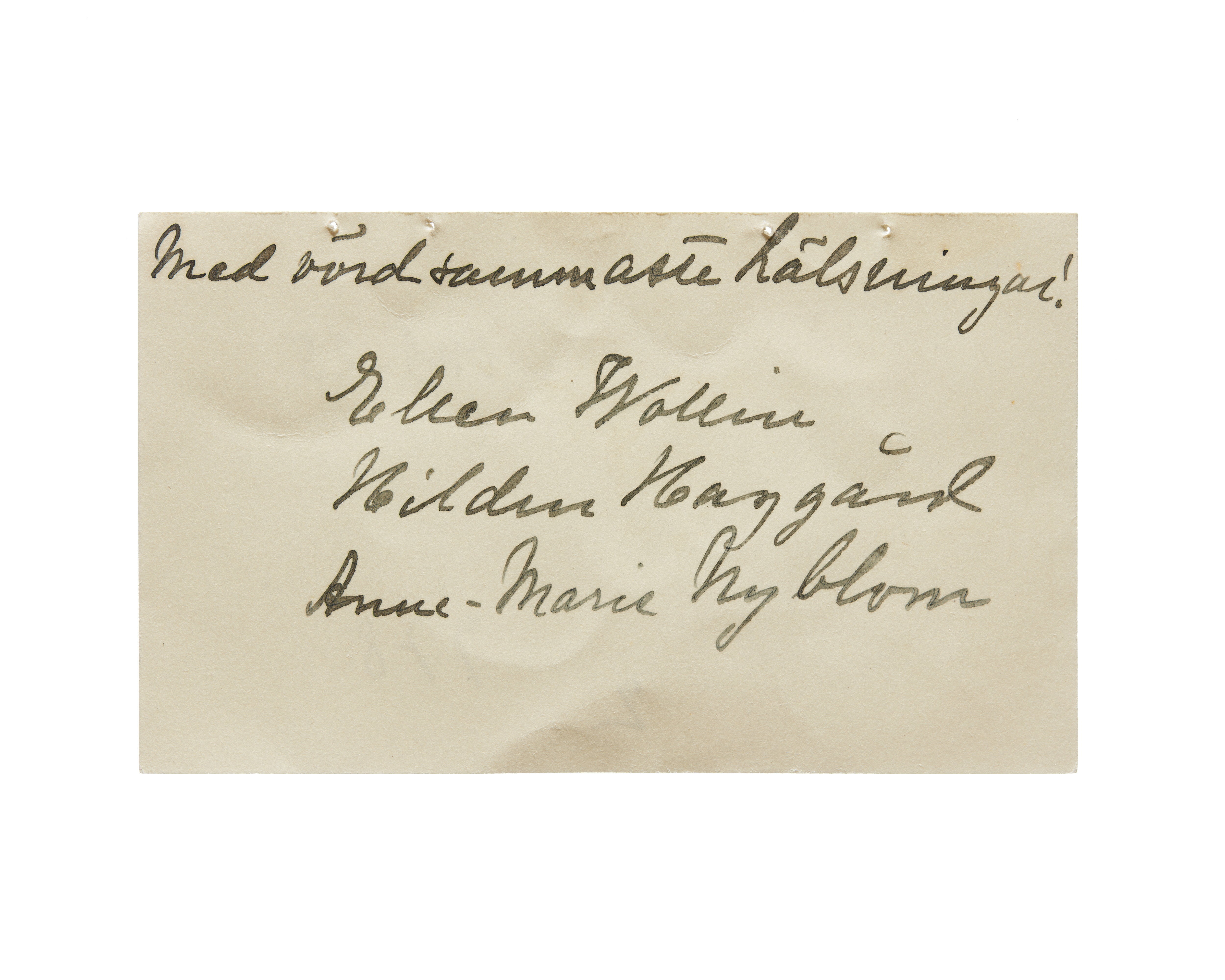 Fyra visitkort från Fru Ellen Wollin, f. Nyström. Första kortet dateart 1924. Handskrift "Med vördsam lyckönskan". Andra kortet daterat 1925. Handskrift "med vördsammaste hälsningar! Ellen Wollin, Hilden Haggård, Anne-Marie Nyblom". Tredje kortet daterat 1926. Handskrift "med vördsam lyckönskan, Ellen Wollin". Fjärde kortet daterat 1929. Handskrift "med vördsam lyckönskan, vari innesluten stor tacksamhet".